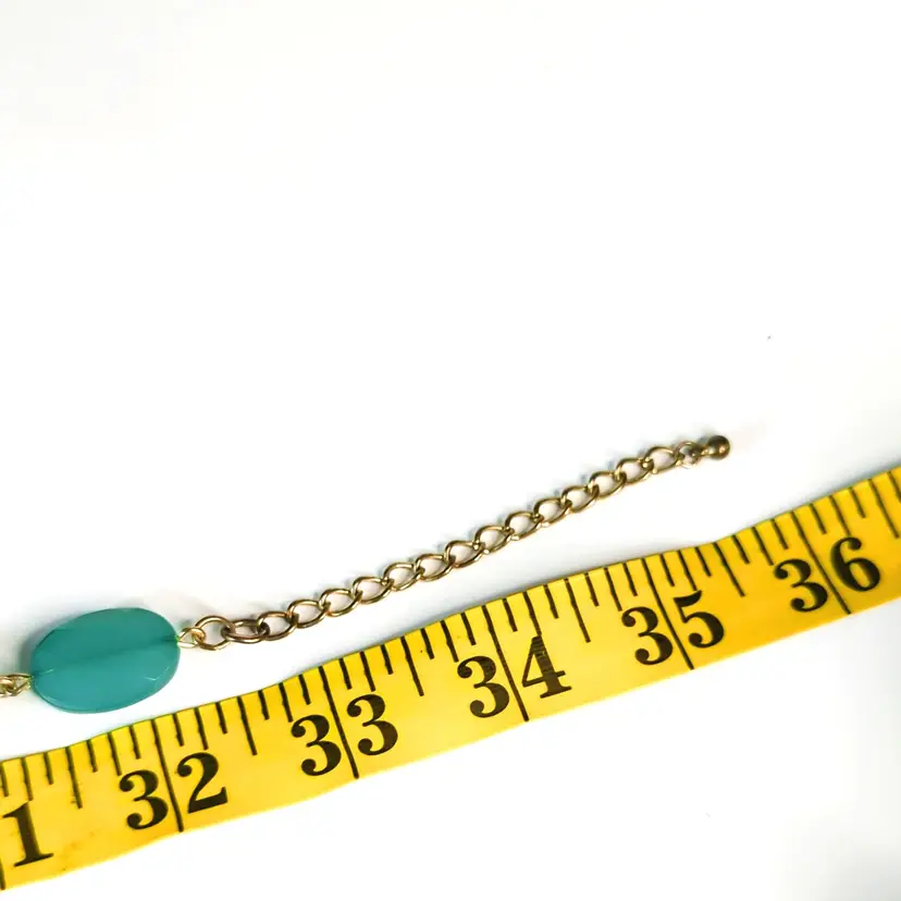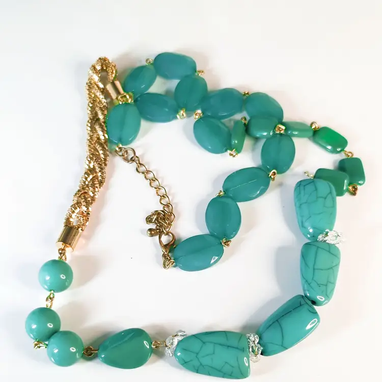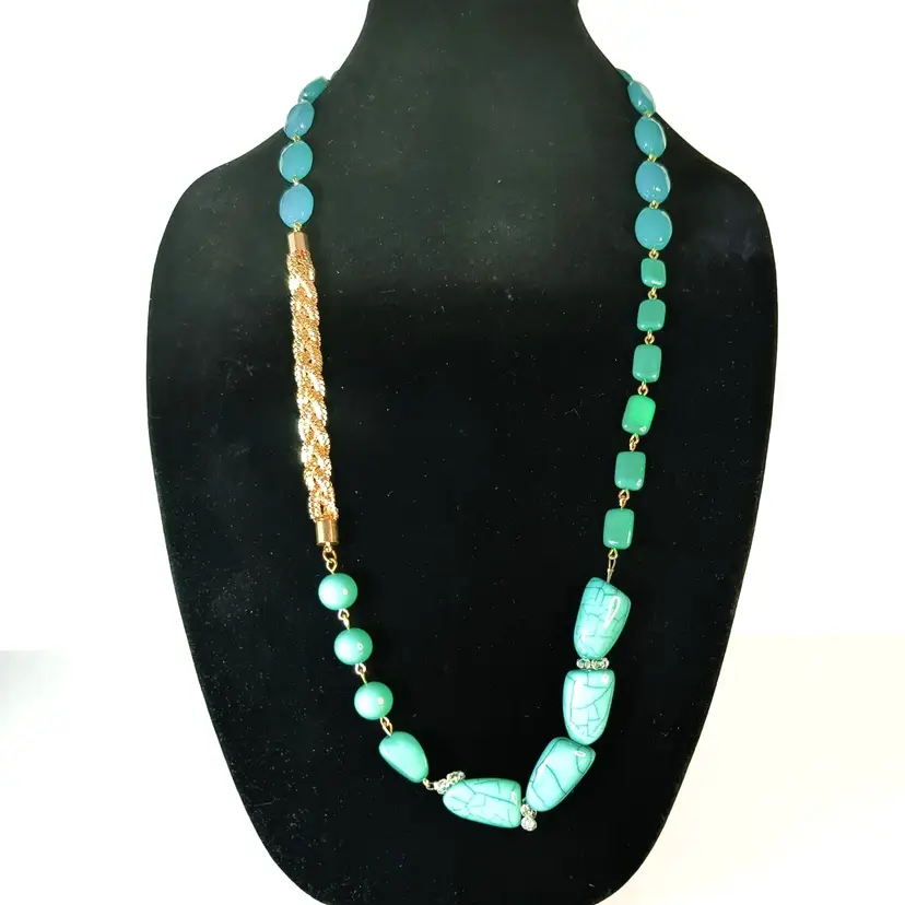 • Various shades of aqua blue beads • Gold-tone chain • Secure clasp • 36 inches in length • Versatile accessory
