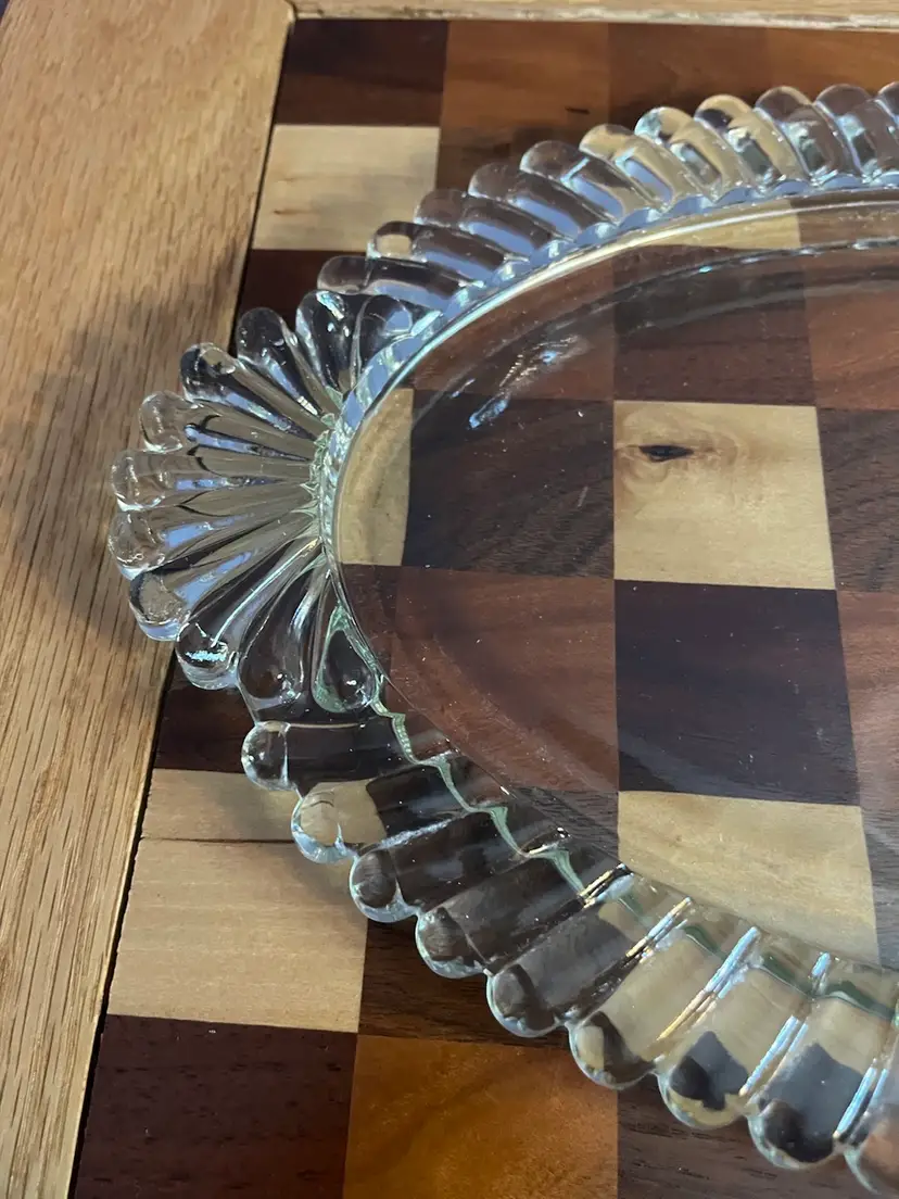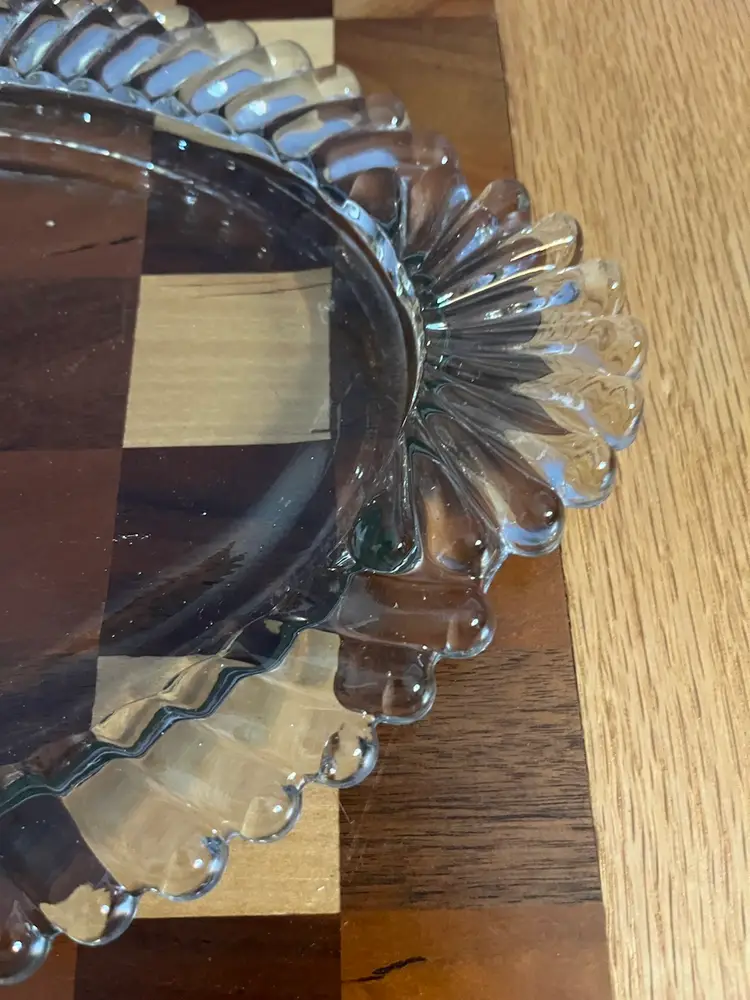 This particular style of glass tray, with its fan-like or scalloped rim, is reminiscent of designs popular during the Art Deco and mid-century modern periods. These trays were versatile, used for serving appetizers, candies, or as catch-all dishes. Their durability and aesthetic appeal made them enduringly popular, and they remain sought-after by collectors of vintage glassware today.