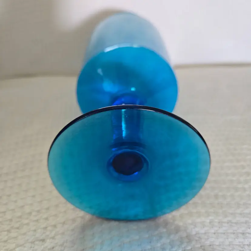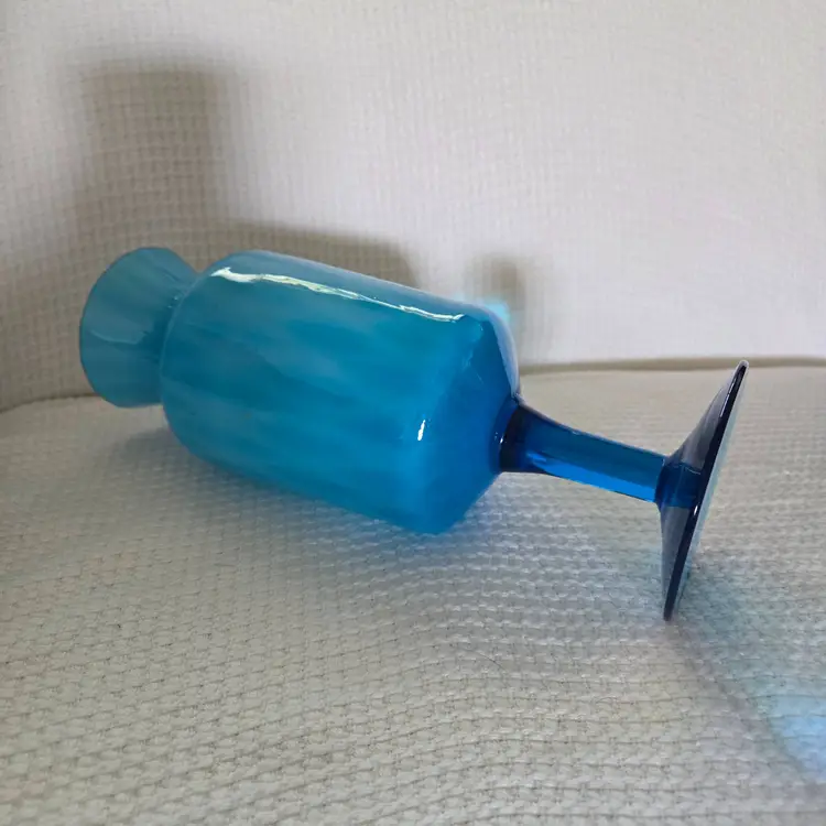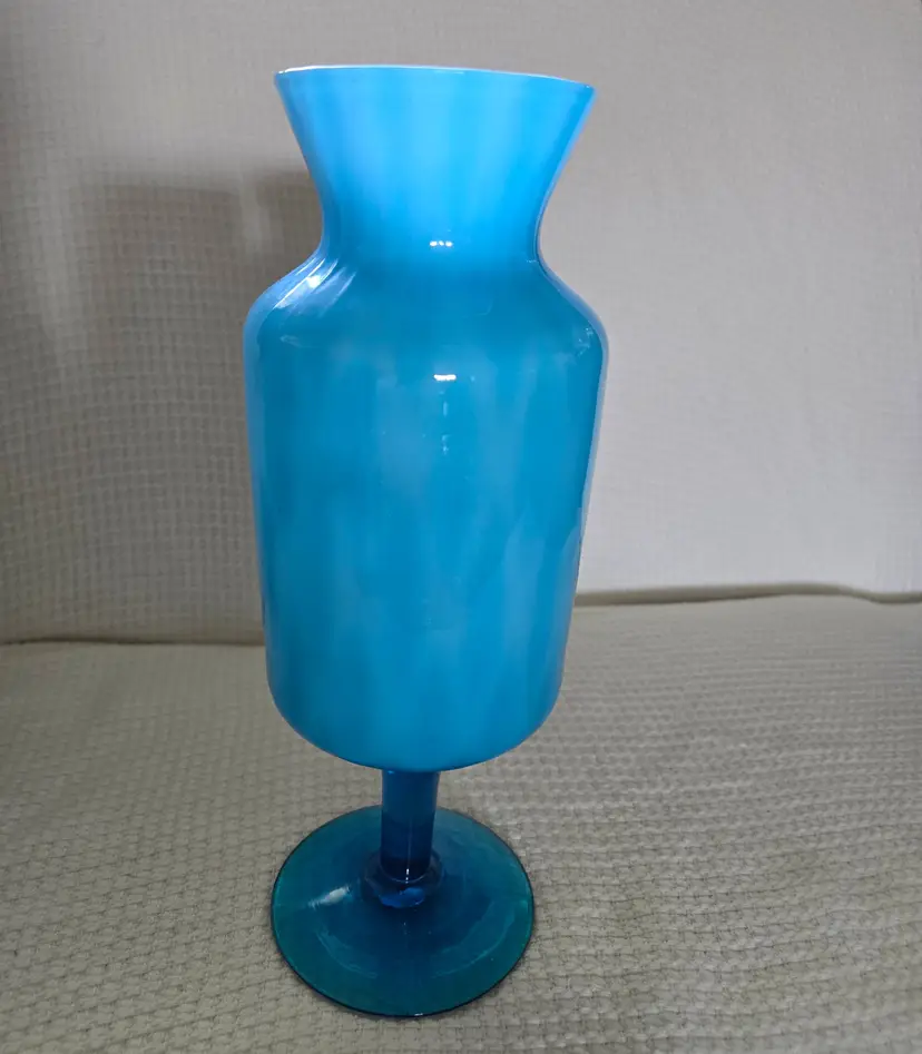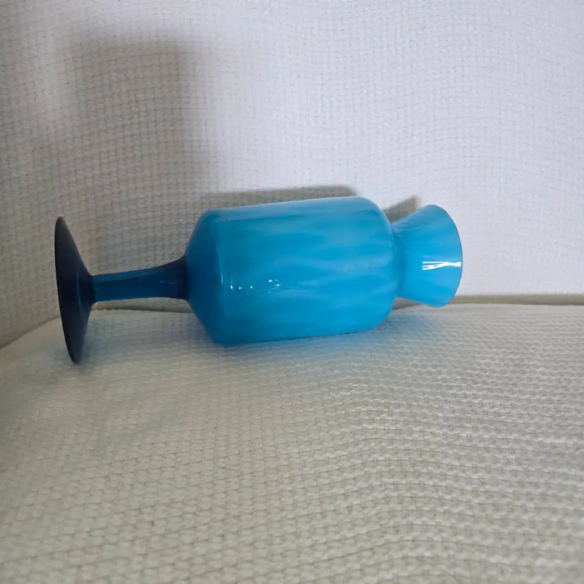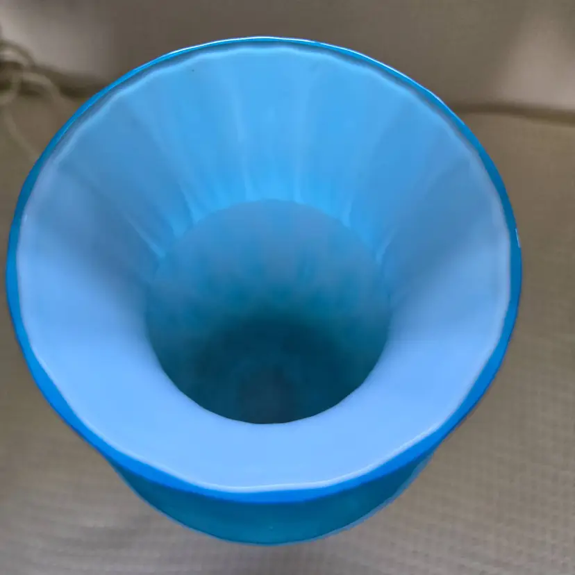 Light blue hand blown cased in white vase. It has a darker base and the the top has an overlay optic swirl design throughout. Measures 9 3/4" tall 2 3/4",across the top, 4" around the largest part and3 1/4" at the base. In perfect condition. No chips, cracks or repairs