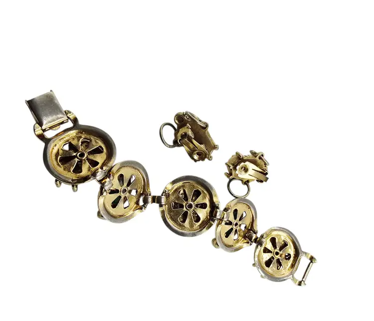 Size: Bracelet approx 7.5", earrings approx 1.25" Condition: Good vintage; some wear to back plating Era: Circa 1960s Signed: None Details: often attributed to Selro, but I don't believe this is