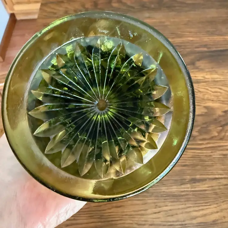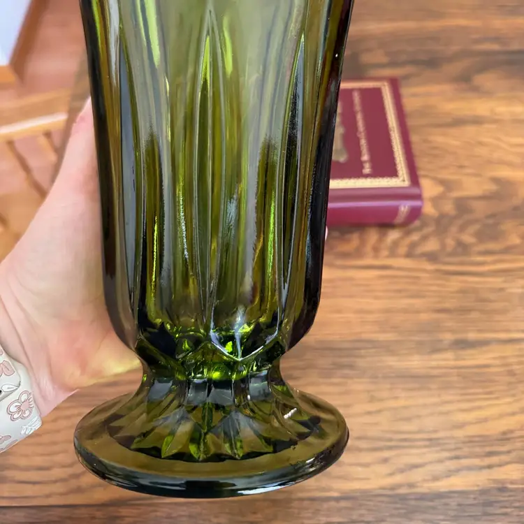 Add a touch of retro charm to your home with this vintage avocado green glass vase from the 1960s–1970s. This striking piece features a scalloped rim, elegant paneled sides, and a radiant starburst base, all pressed into richly colored olive green glass. The classic flared shape makes it perfect for fresh or dried floral arrangements, or simply as a statement accent piece on its own.