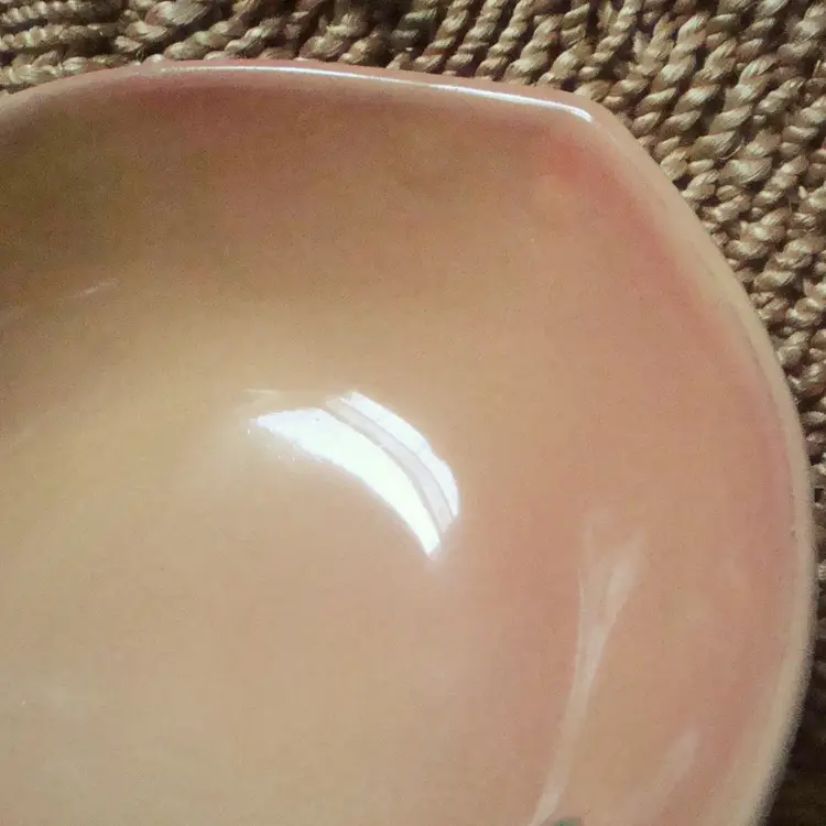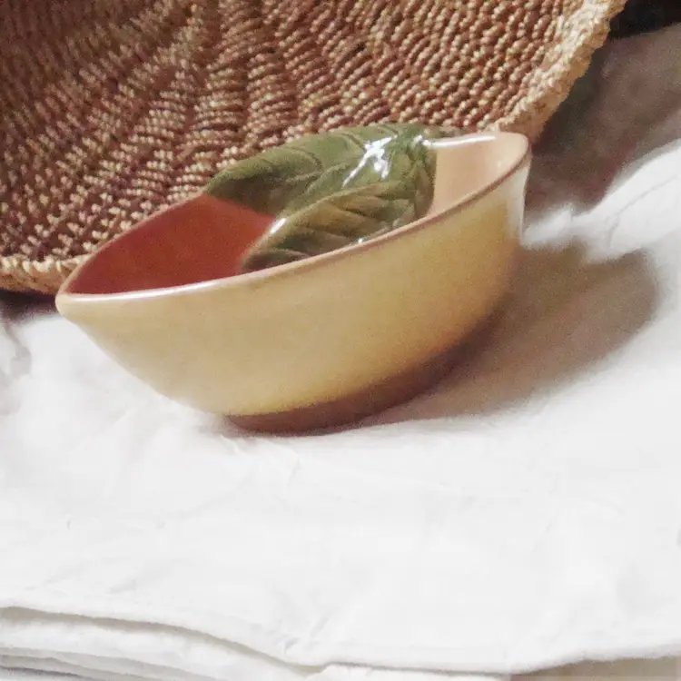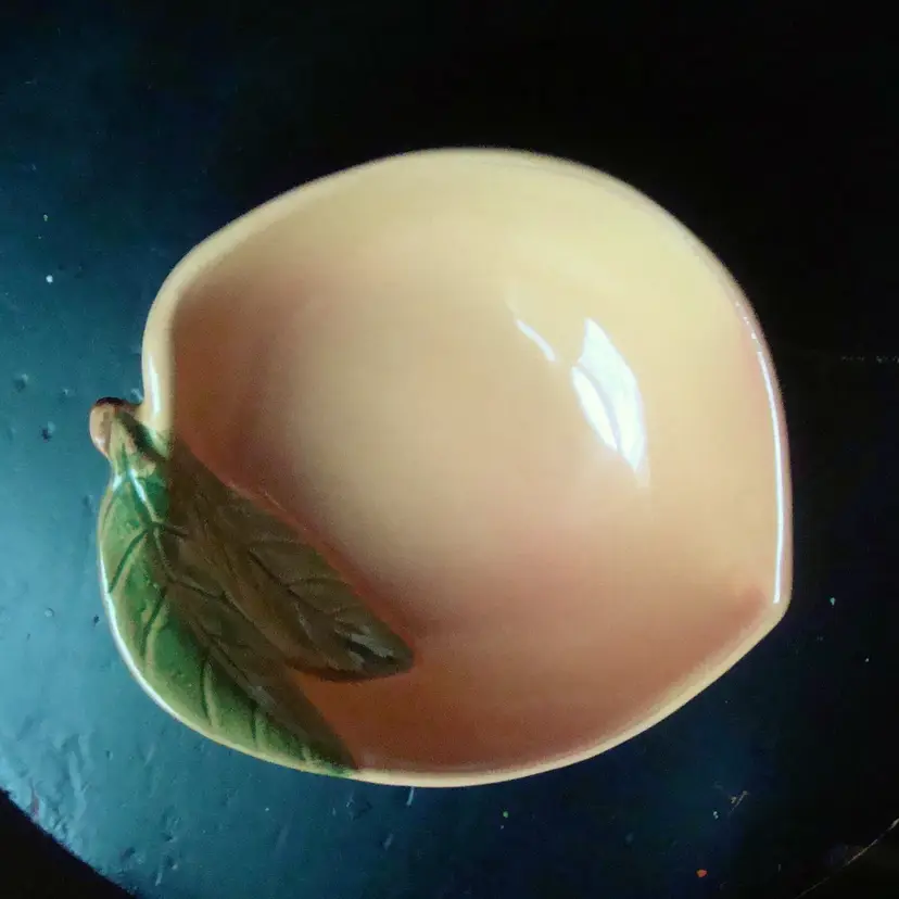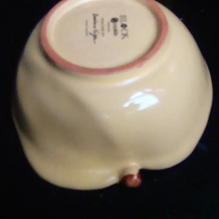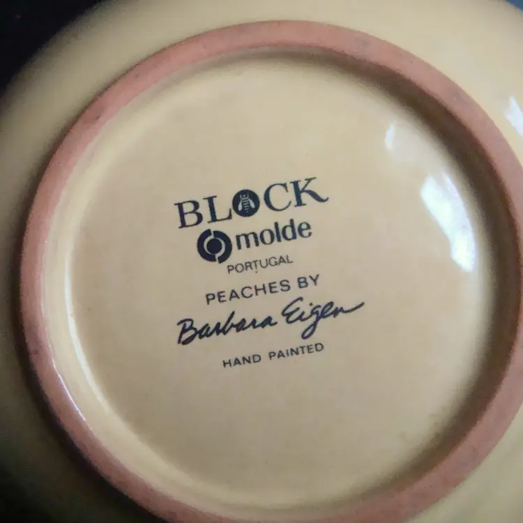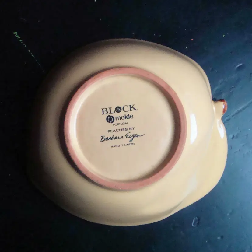 Peaches by Barbara Eigen hand-painted side bowl Soft earthy tones Size: 5.5" x 2.25" approx. Some wear at rim, not highly noticeable or rough, etc. (see photo) Ceramic contains slight manufacturer imperfections - uneven color glazing. (see photo) Made in Portugal Overall great condition and a pretty piece to add to your table.
