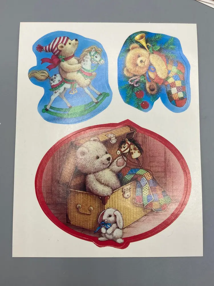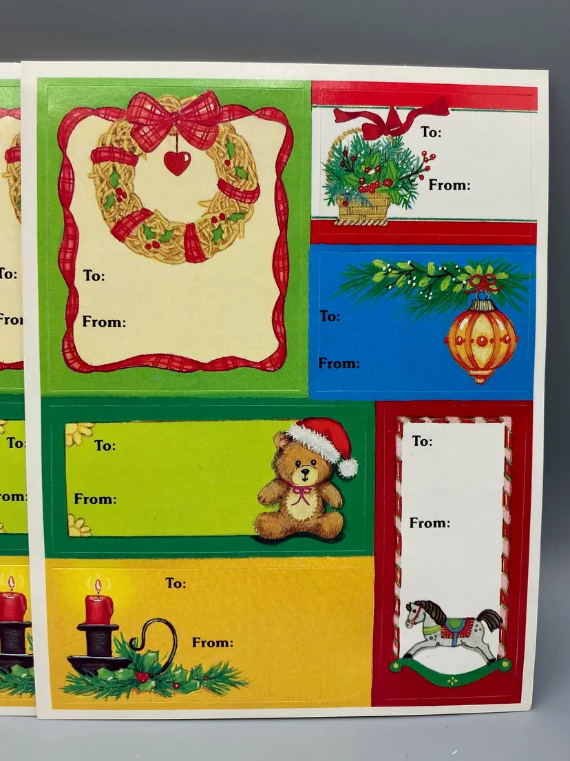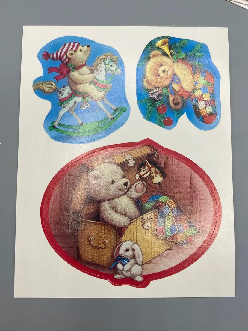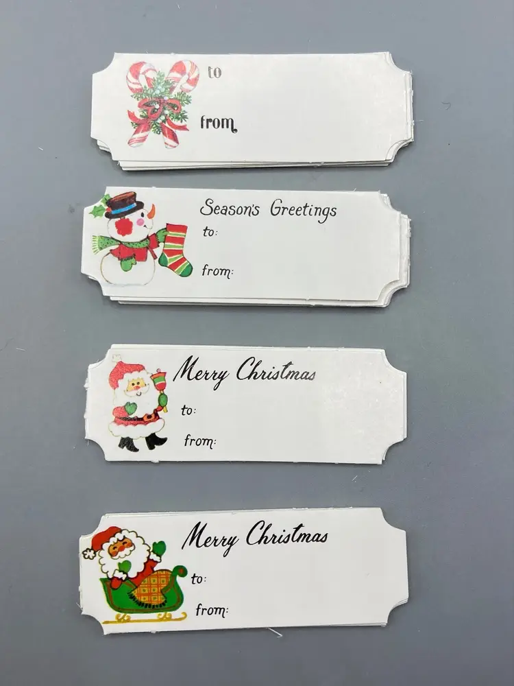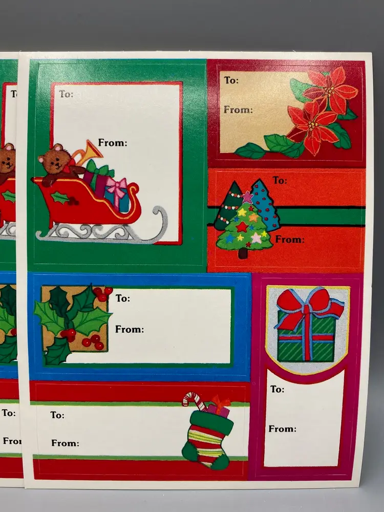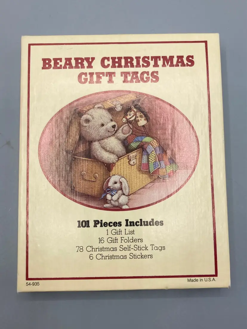 This lot includes a box of Beary Christmas Gift Tags that includes... 44 Teddy Bear Cards that are foldable 2 gift list papers 12 sticker gift card sheets 7 Santa and sleigh tags 5 Santa tags 11 snowmen tags 10 candy cane tags