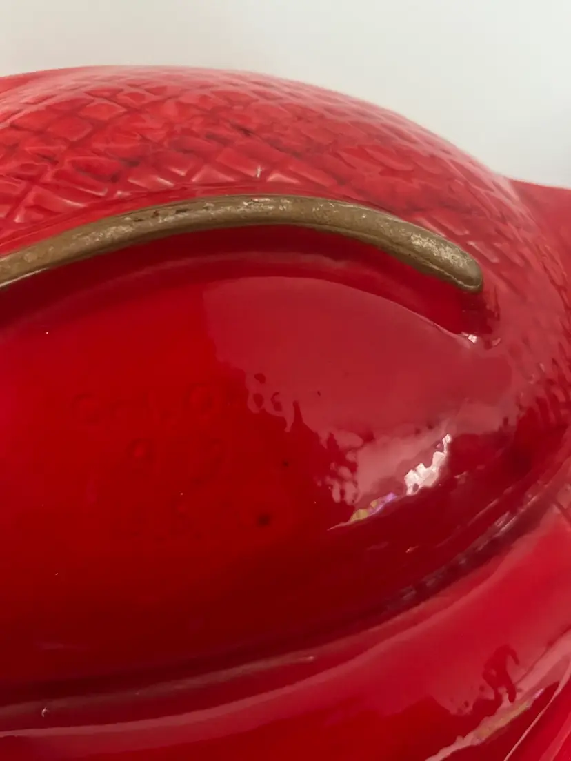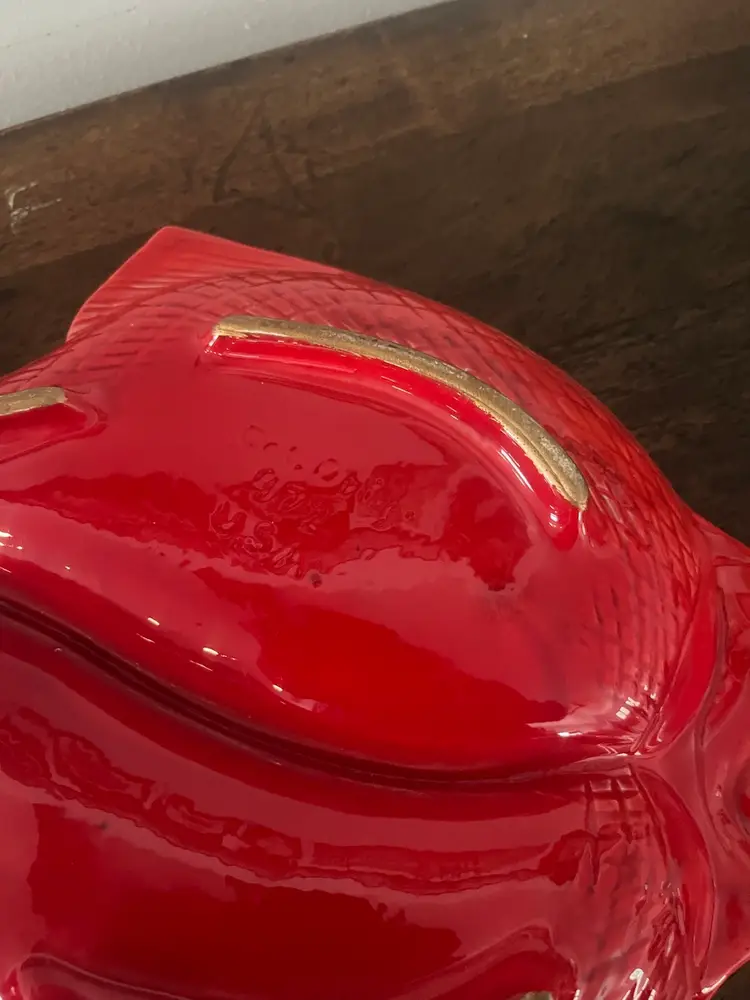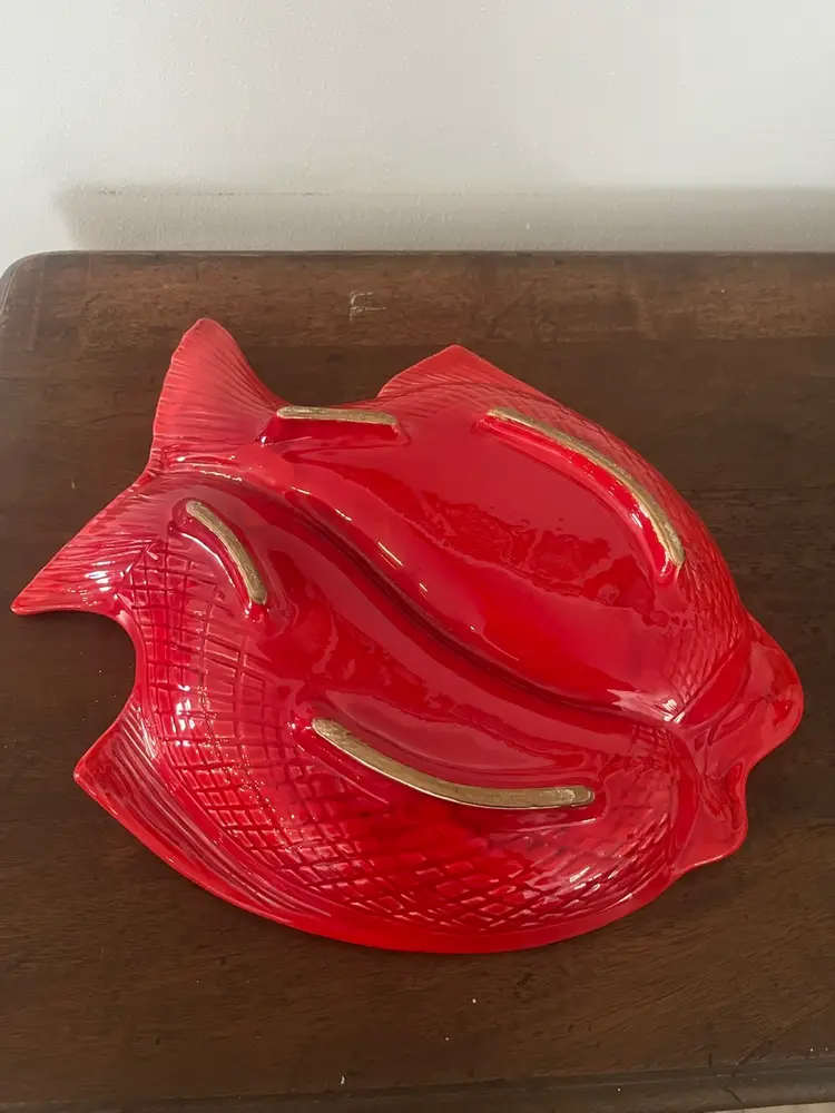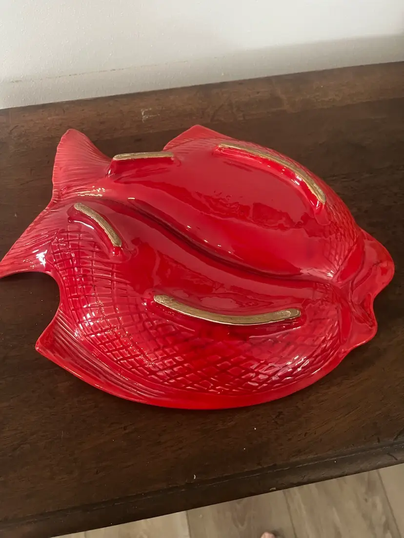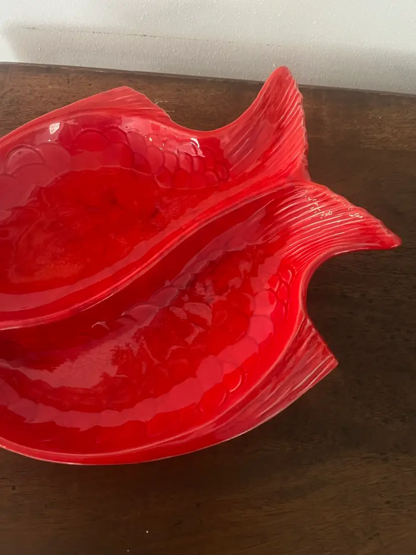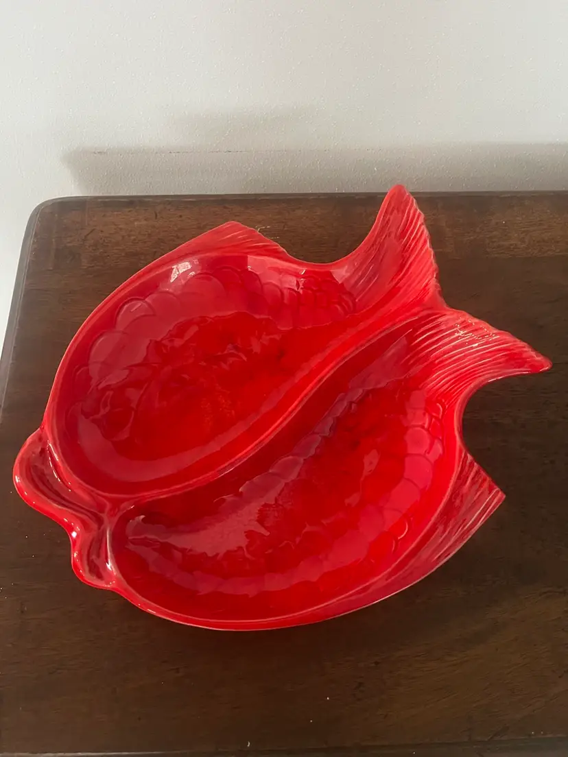 Groovy fish divided serving platter. Approximately 14” x 11 1/2”. Excellent condition. No chips or cracks. Bottom says Cal. Orig. 972 USA