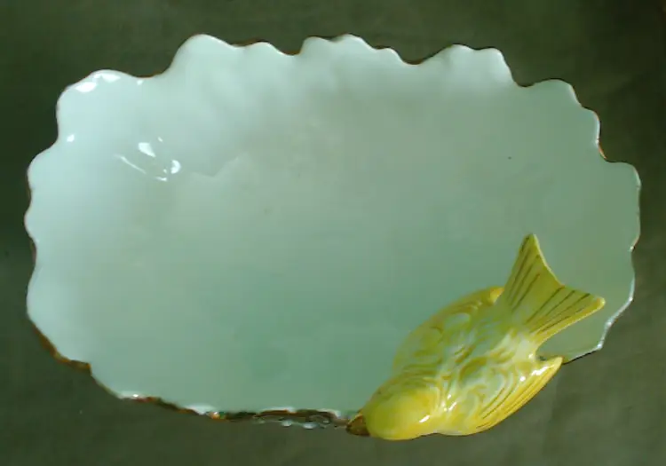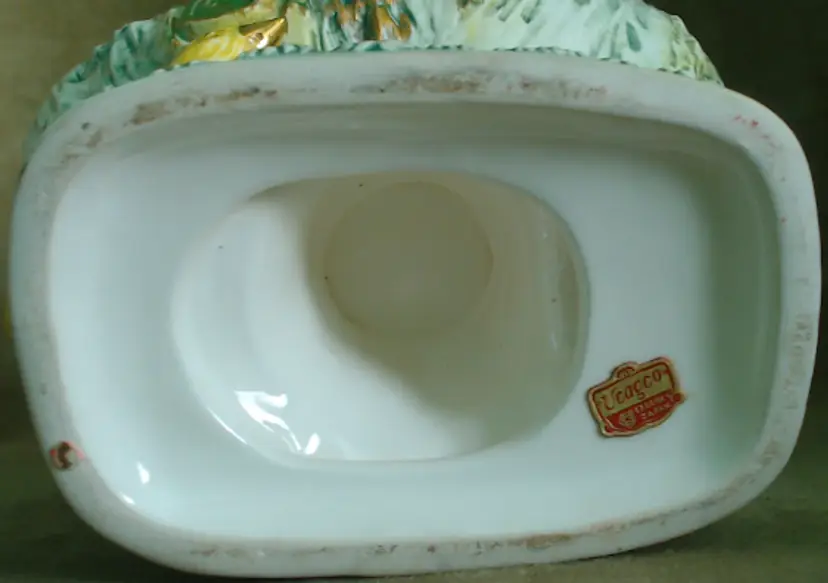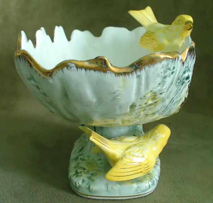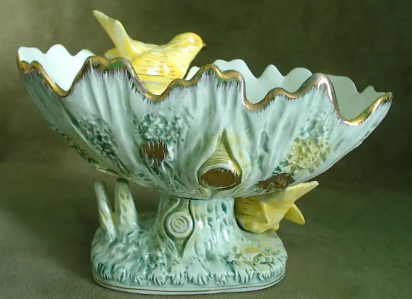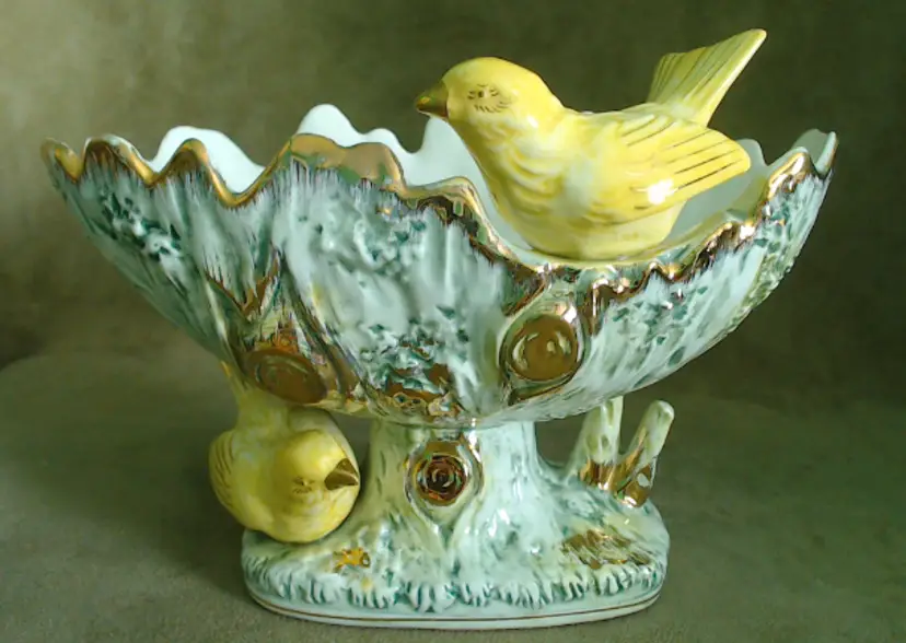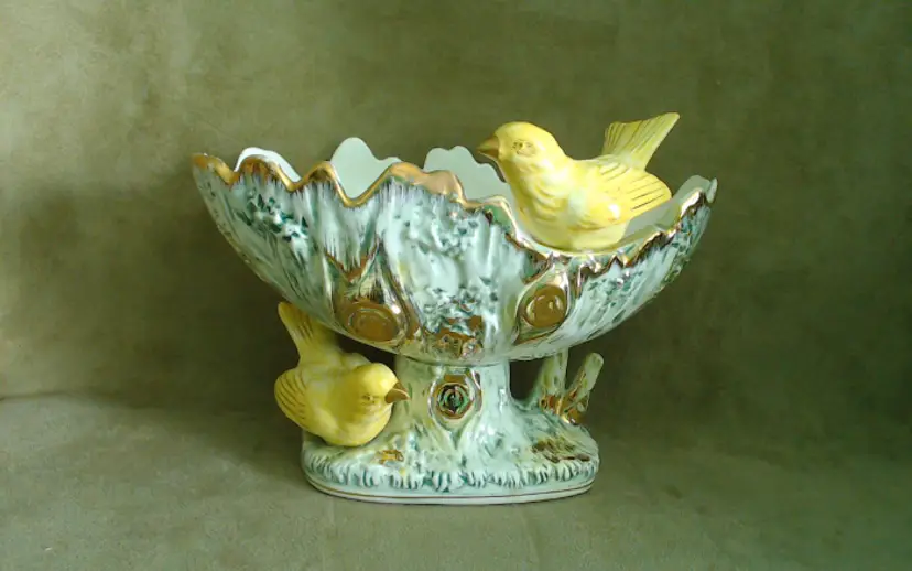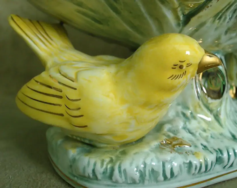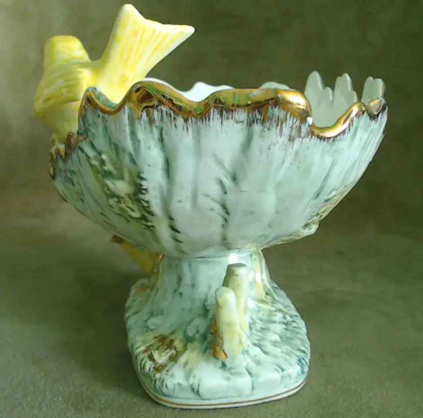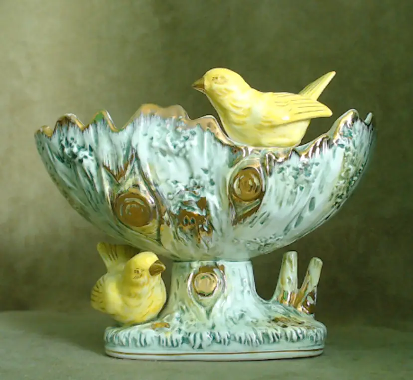 This is a vintage planter, adorned with two little birds! Made in Japan during the late 1950s, for Ucagco, this large indoor planter was designed to be a show stopper! The pedestaled "stump" is quite unusual, and the generous gold gilding is eye catching. The sunny yellow of the birds is so cheerful! Condition: This planter is in Very Good shape! There is a small hairline on the back, but it's quite hard to spot and it doesn't affect the function of the piece. There are no chips and no other flaws that I could find. The gilding is still bright and shiny all over! Size: The piece measures about 8" across, is 5¼" wide, and stands just over 6" tall. The actual planter portion is curved, and is about 2¼" from the deepest point to the lowest dip on the side. Quite a nice size for an indoor planter!