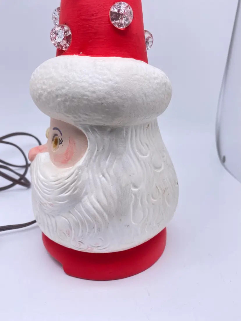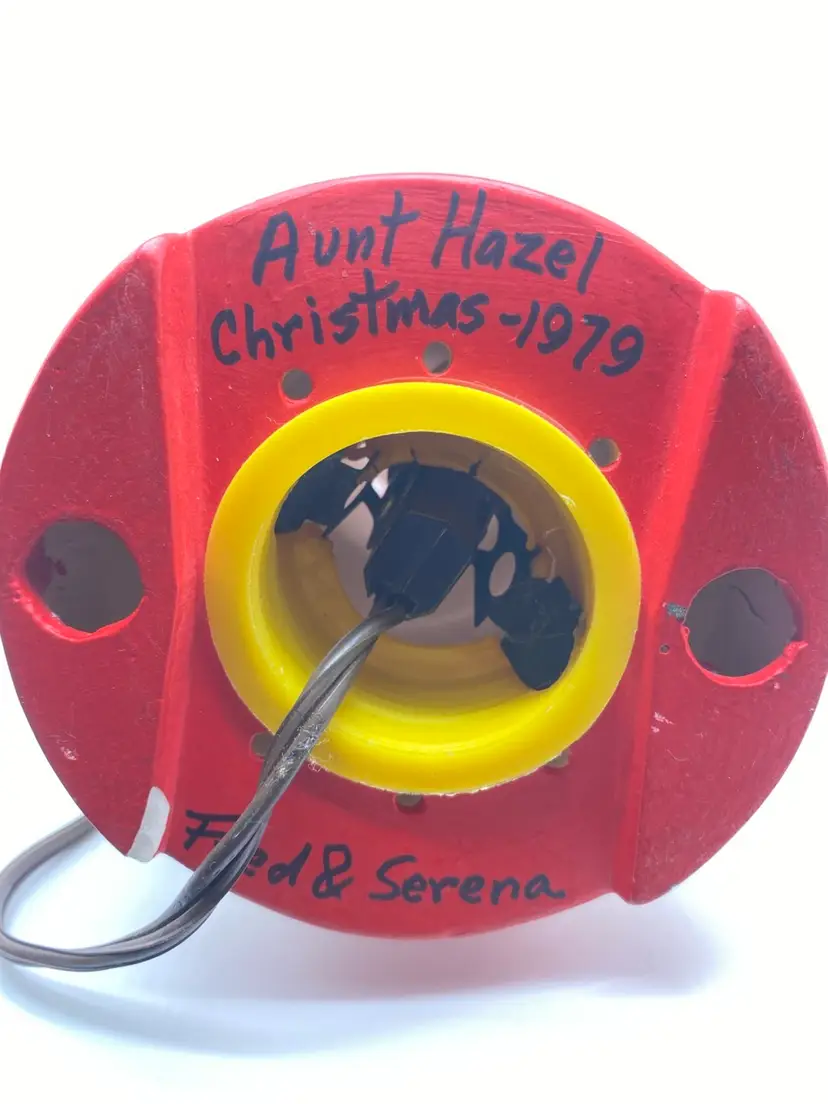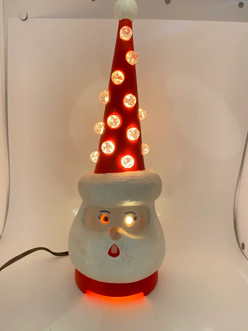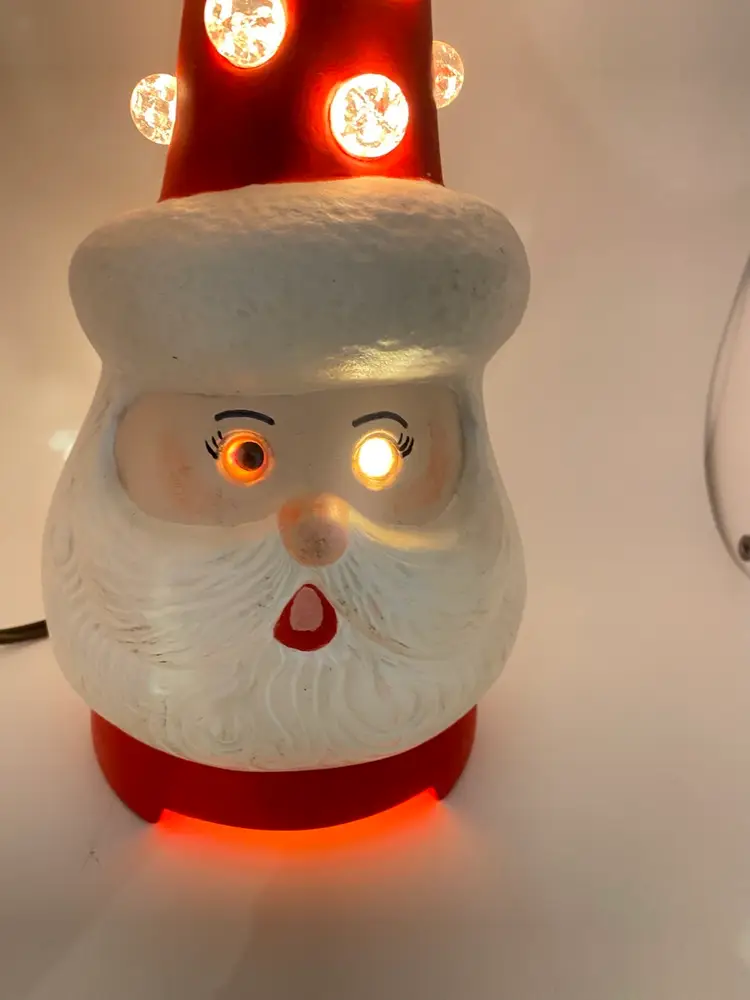 Christmas decor. When plugged in lights up. Missing an eye. Marked 1979 on bottom. Stands about 13” tall