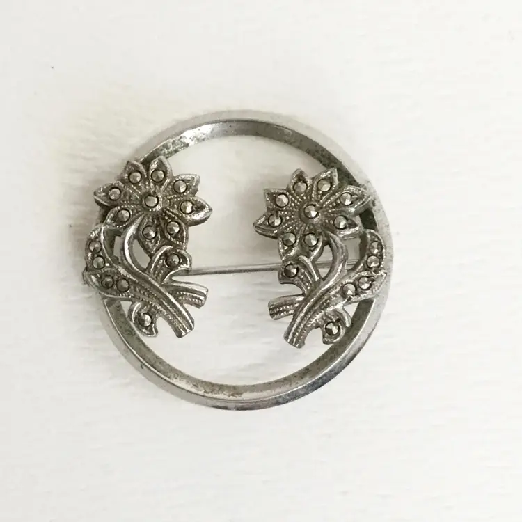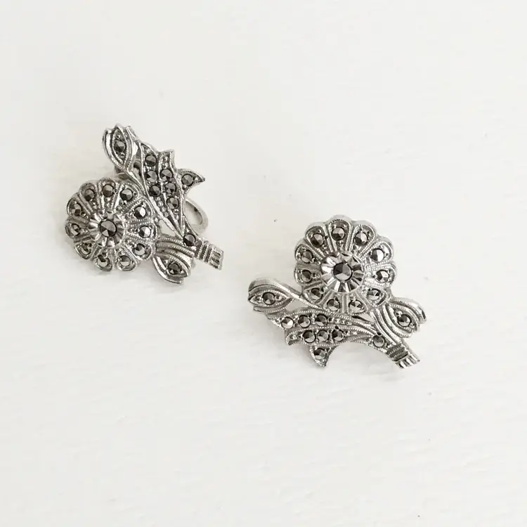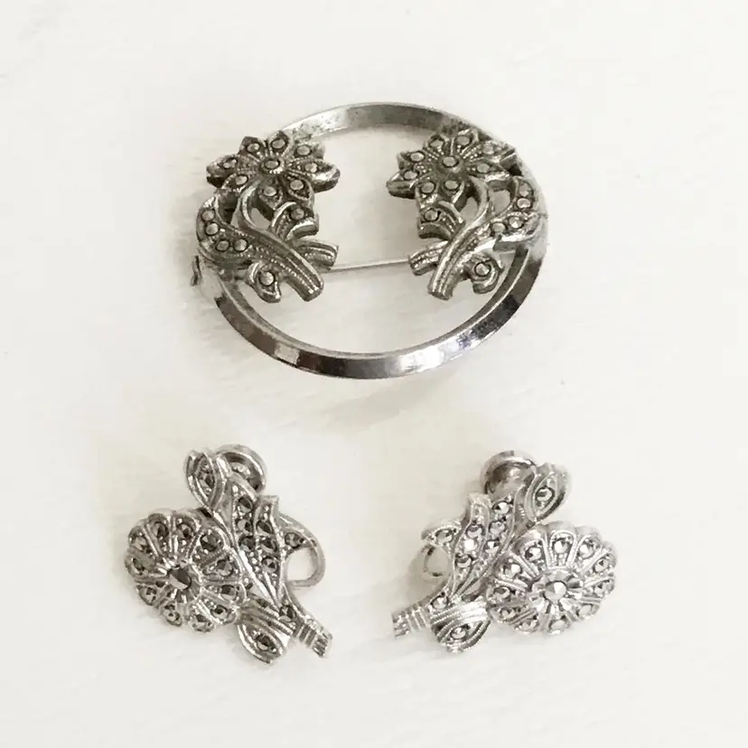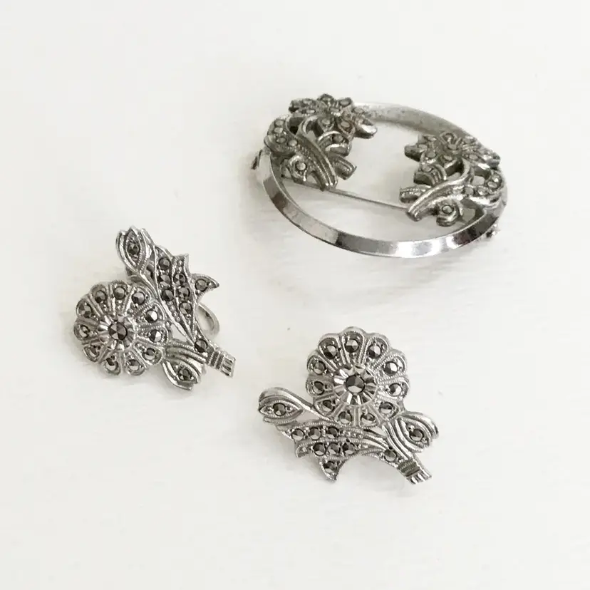 Vintage BK Sterling Silver Tone Floral Flower Marcasite? Earrings & Brooch Set