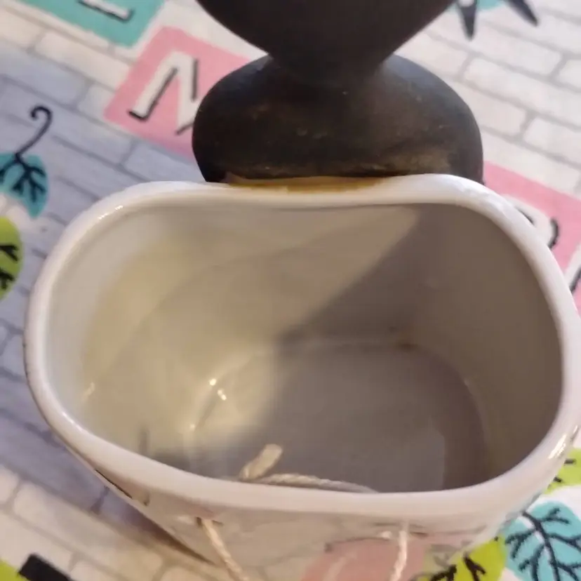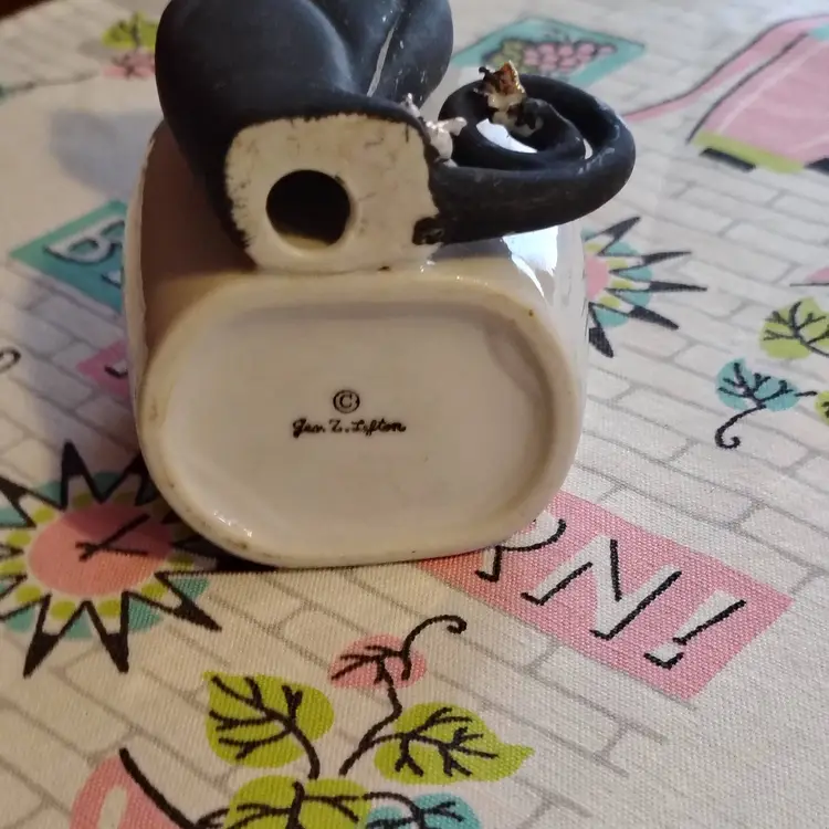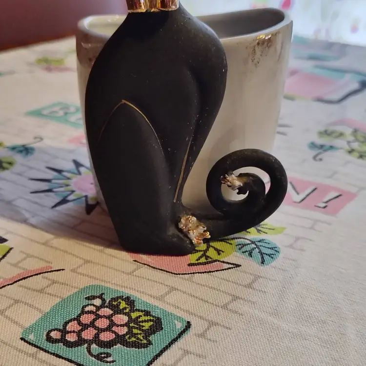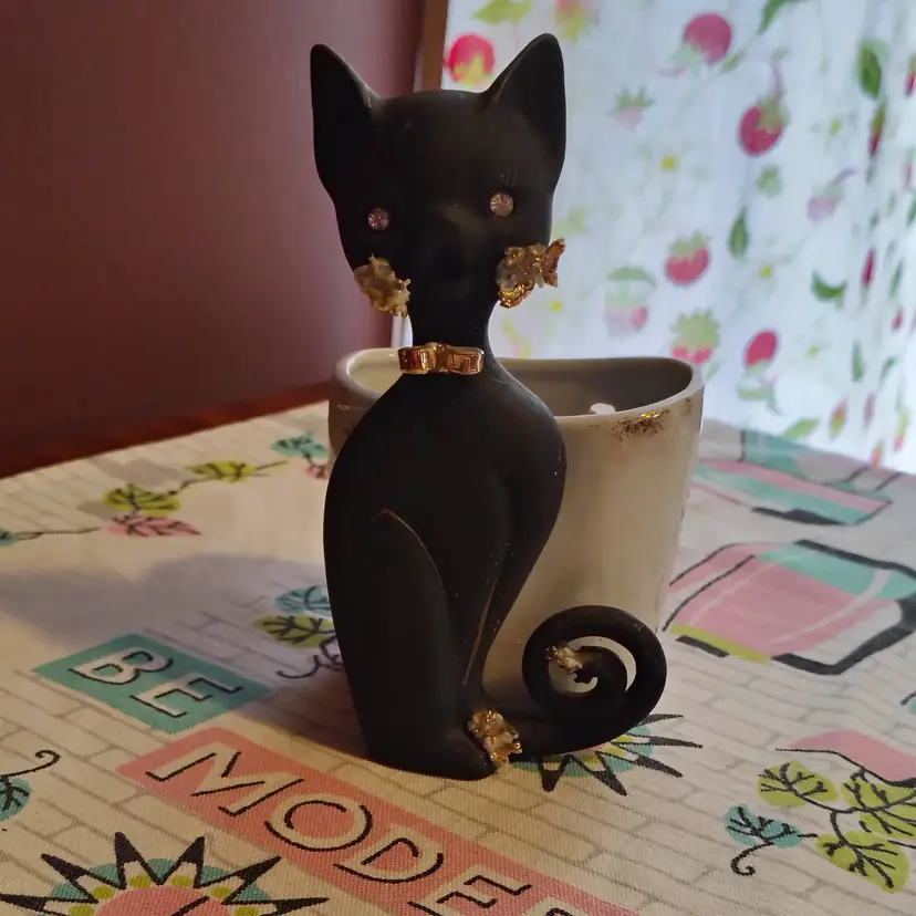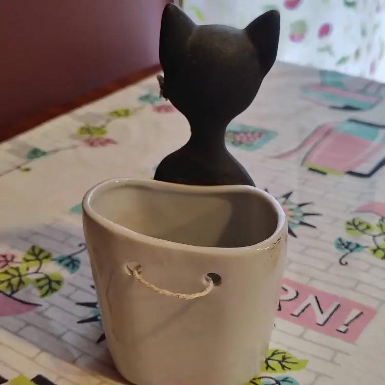 This is a vintage wall pocket, adorned with a stylish cat! Made in Japan during the 1950s, for Lefton, this kitschy kitty planter was crafted from a lightweight porcelain, and given hand painted details. The planter has a flat bottom and back, so it can be placed on a windowsill or a table, but it also can be hung on a wall. So many choices!. Our kitty has little tufts of porcelain "spaghetti" serving as her whiskers and fur tufts. Her spaghetti fluff has been given a shiny gold gilding, and her eyes have even been set with sparkling rhinestones. Such a fancy cat! Condition: This cat planter is in Excellent shape! There are no chips, cracks, or any other damage that I could find. Her spaghetti fur seems to be completely intact as well. It's possible there may be a single strand missing off her tail, but I didn't feel any sharp spots, so it's probably just a spot they missed with the gold, making it look a little sparse. There is a single iron inclusion inside the planter portion, but that's ok. She was born with it! Size: The piece measures 3" across, is 2½" wide, and sits 5¼" tall. The actual planter portion measures 2¾ by 1½", and is 2¼" deep.