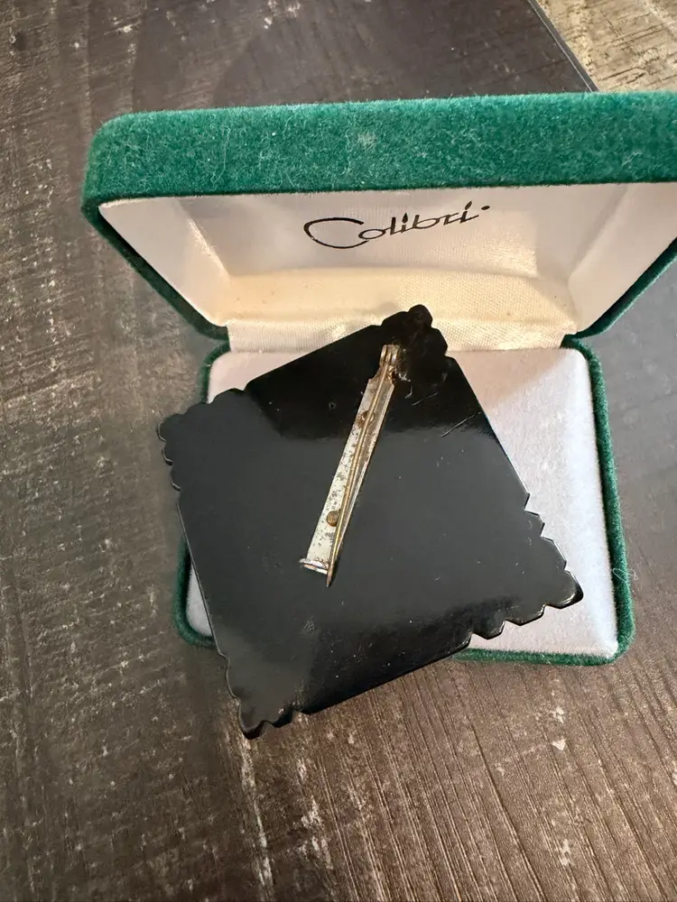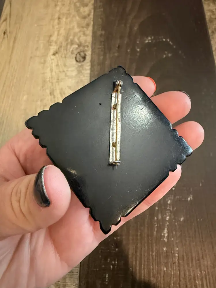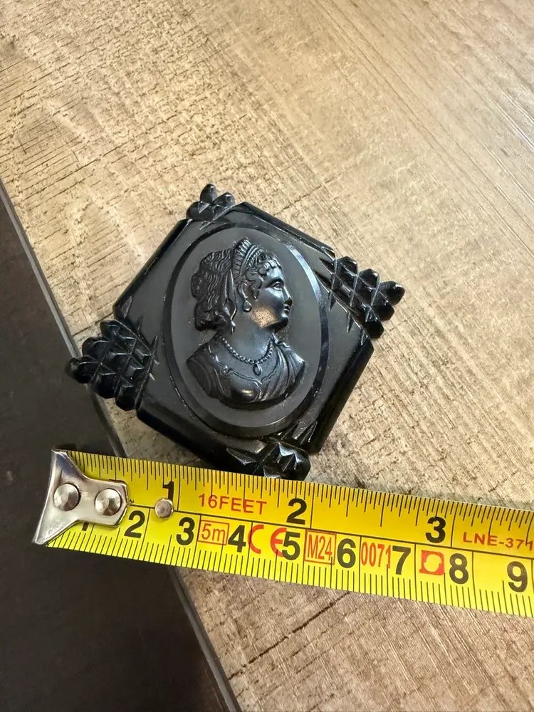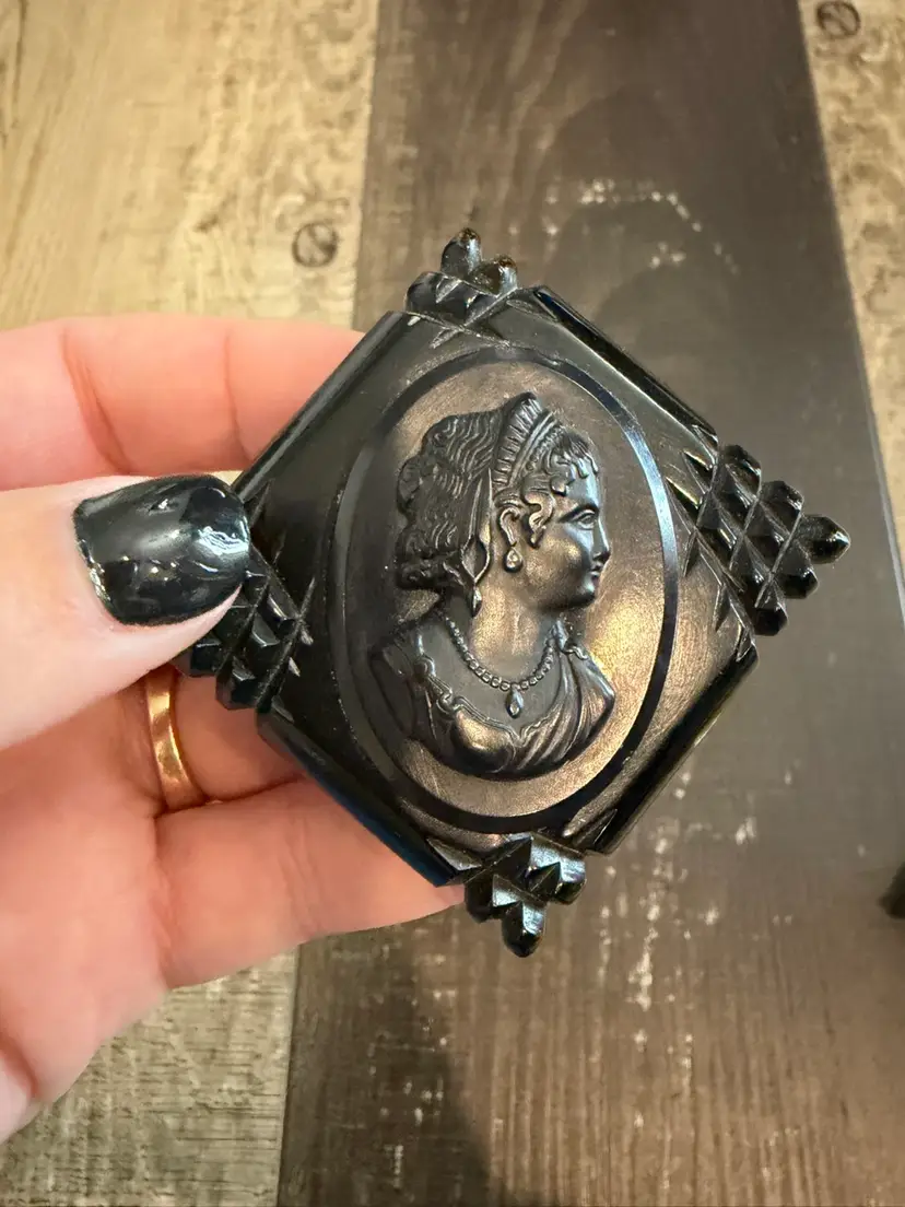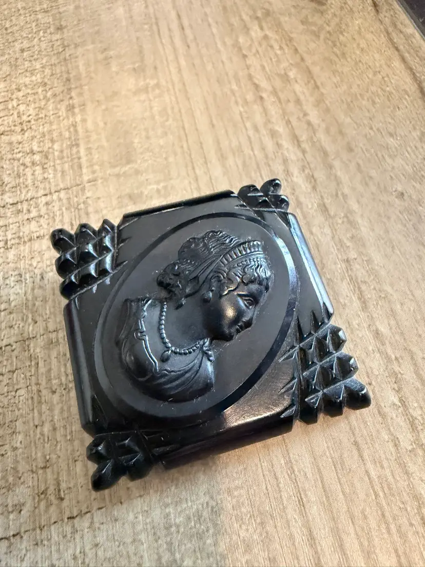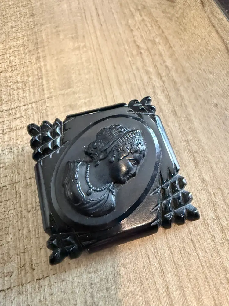 Beautiful vintage/possibly antique mourning cameo brooch Approx. 2.25” I was told this is Bakelite, but sadly I don’t think it is. 🥲 Great condition. Has a couple very small scuffs on back Cross posted