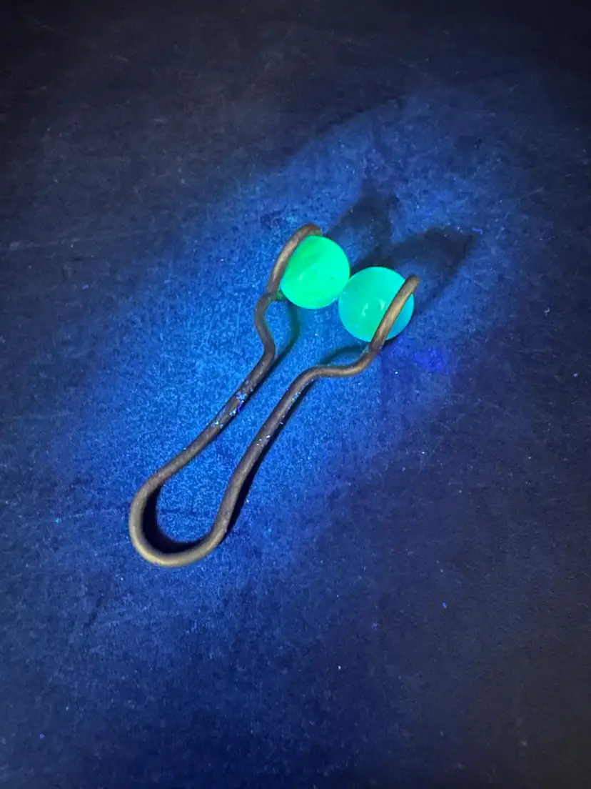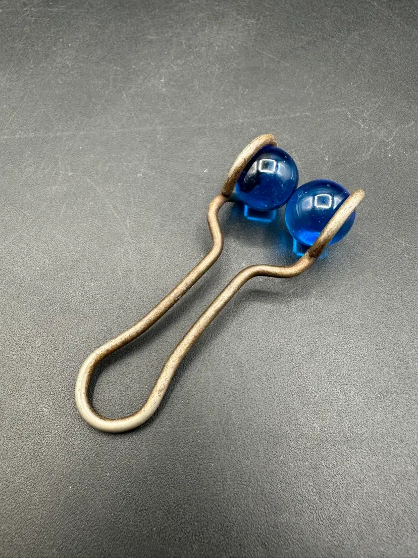 This is a vintage razor blade sharpener, also known as a glass hone. It was designed to sharpen old-style razor blades by drawing the blade between the two glass marbles.