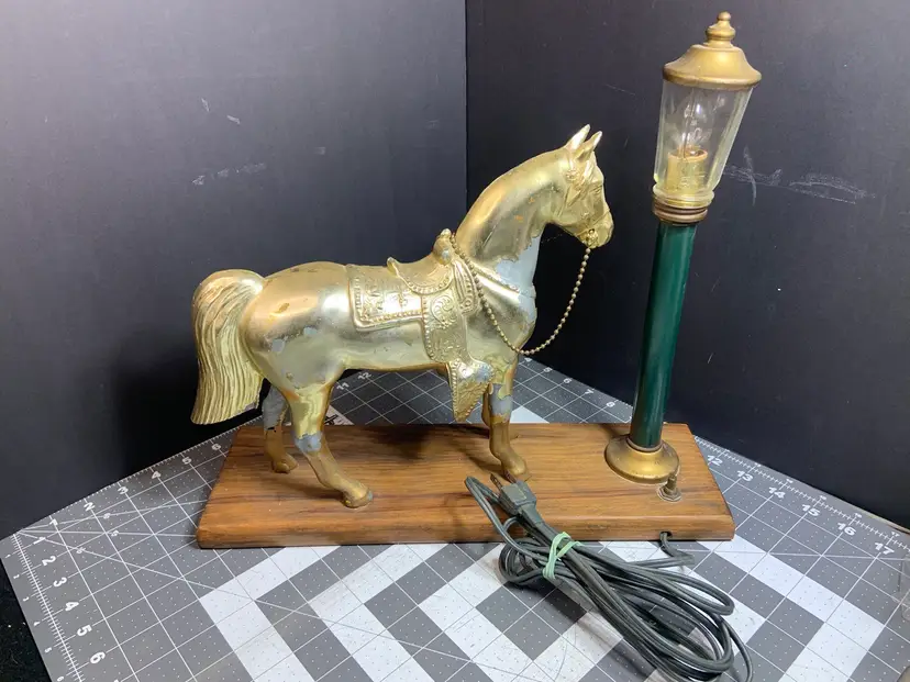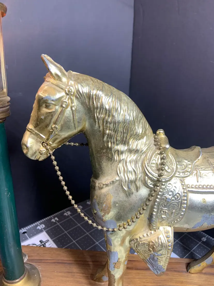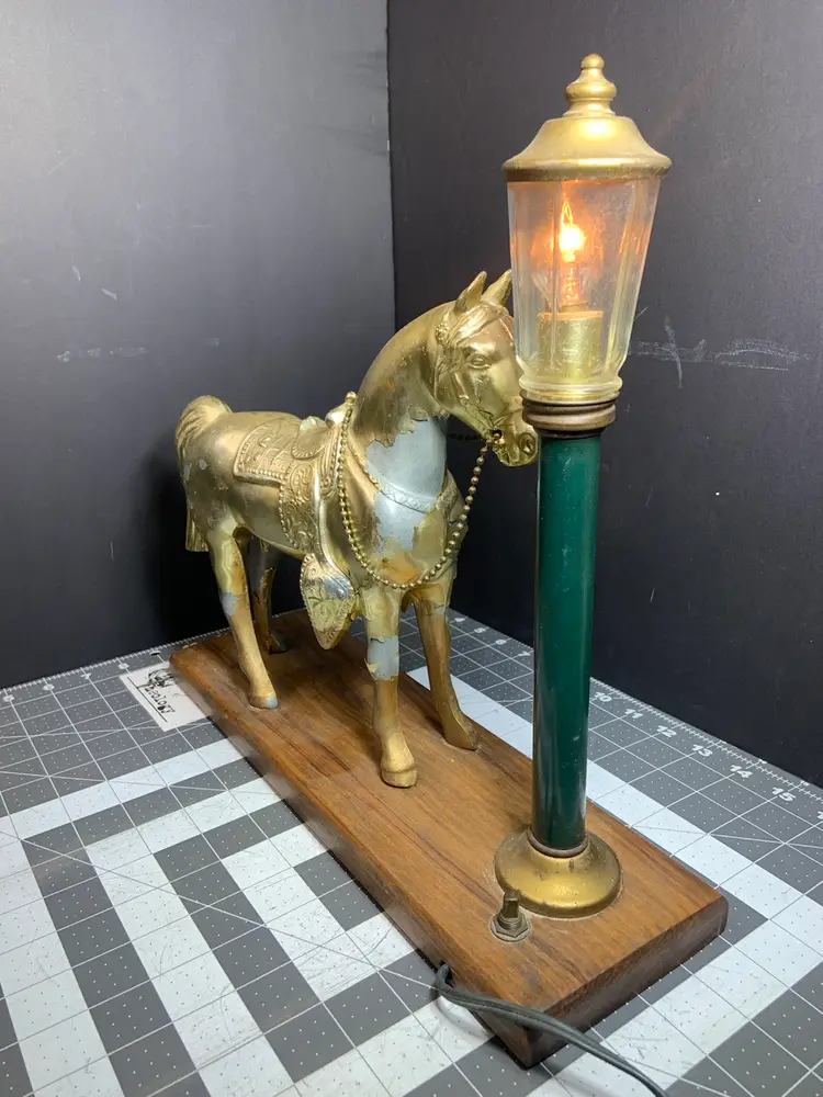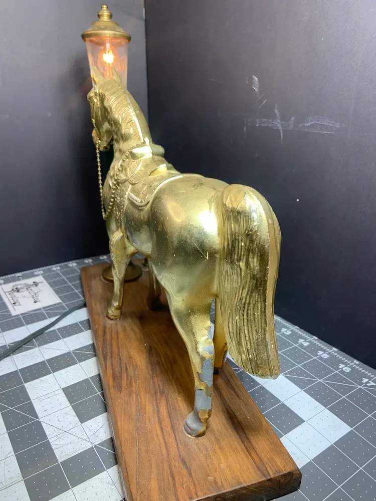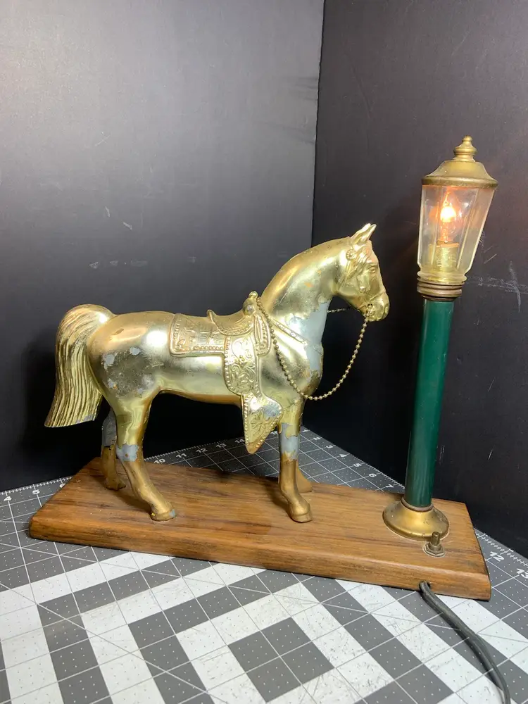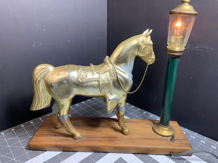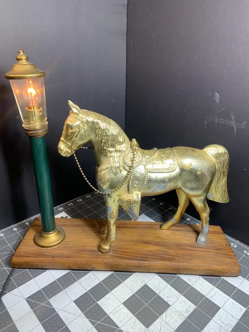 Vintage gold toned brass styled horse with lamp post night light lamp stand. Old approximately 1950s styled metal horse on wood with lamp post light. Switch button on wood. Horse paint is flaking and is sold as seen.