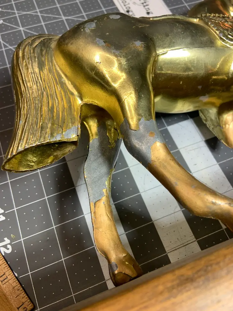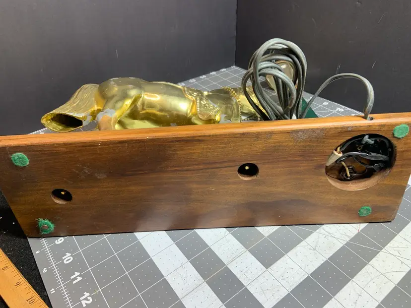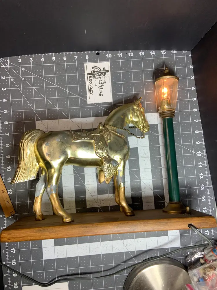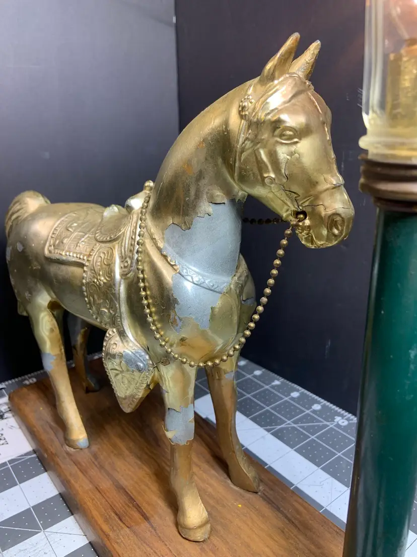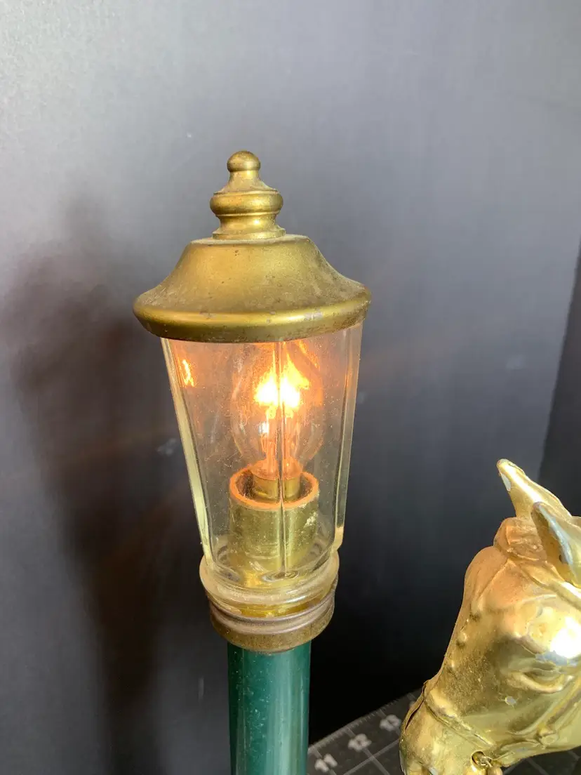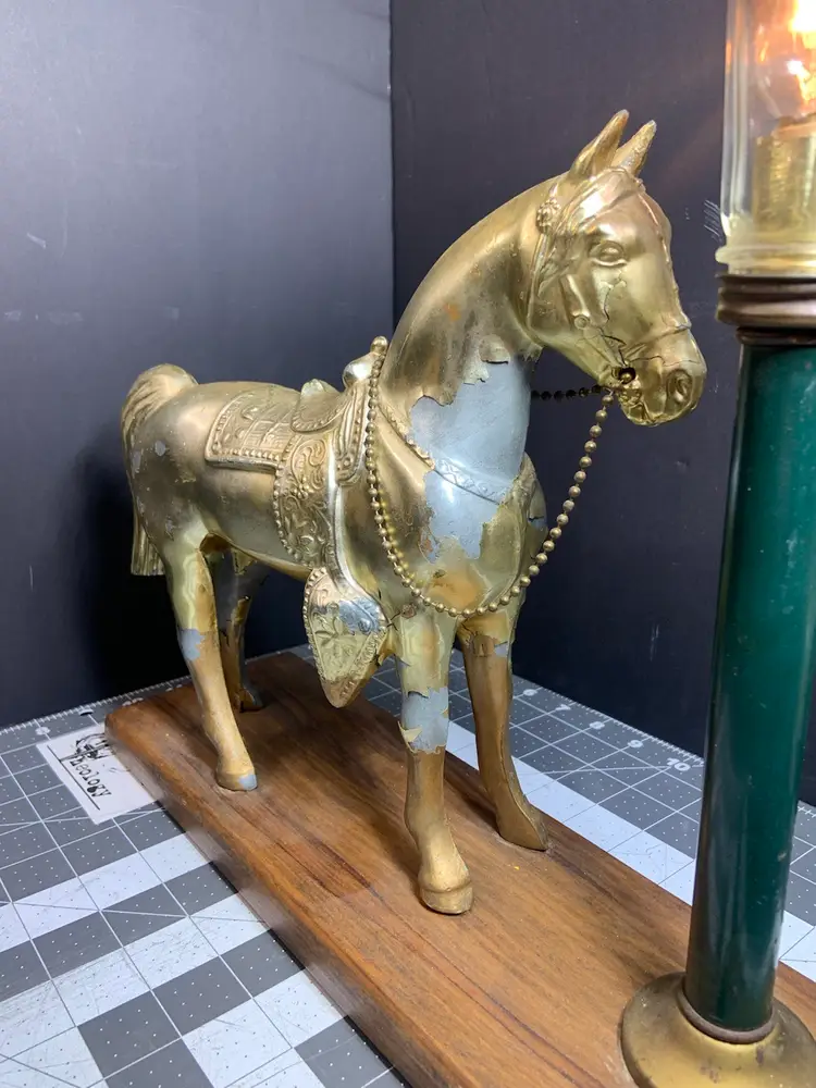 Vintage gold toned brass styled horse with lamp post night light lamp stand. Old approximately 1950s styled metal horse on wood with lamp post light. Switch button on wood. Horse paint is flaking and is sold as seen.