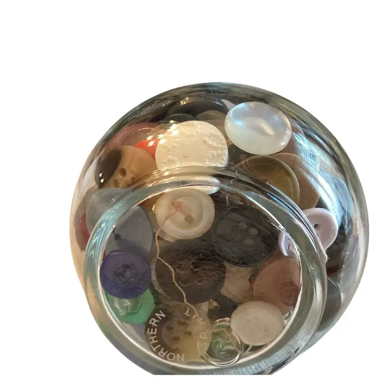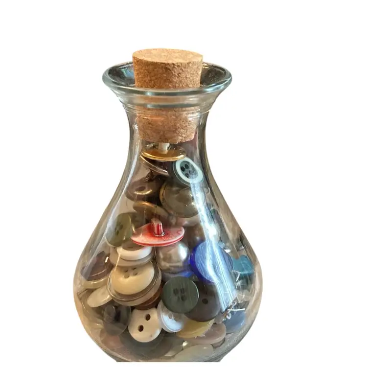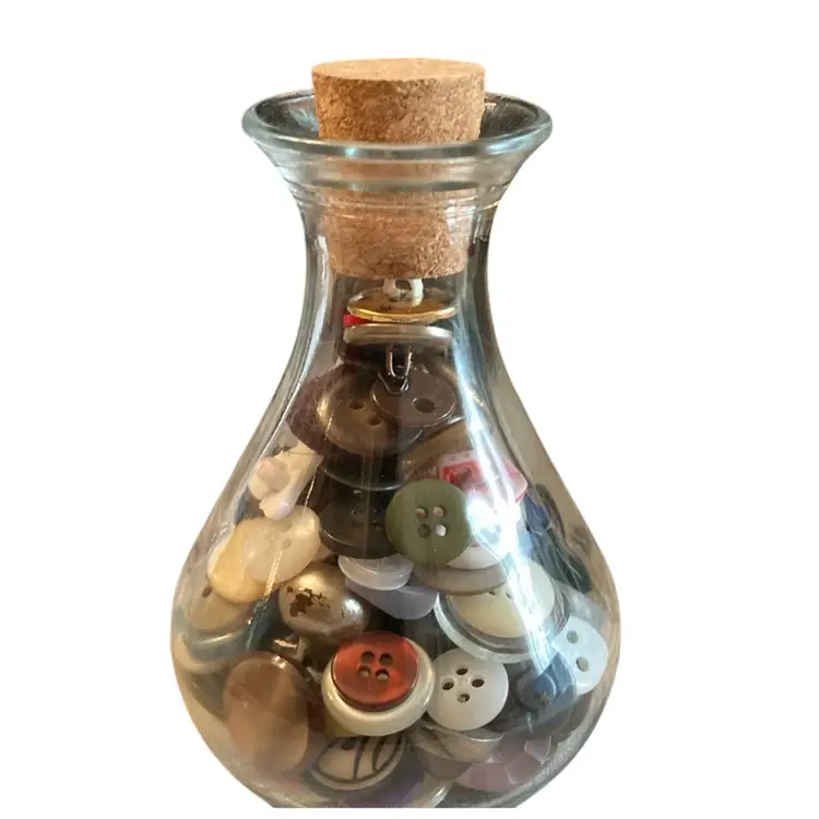 4” tall clear bottle with cork filled with vintage buttons.