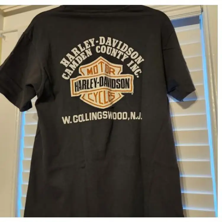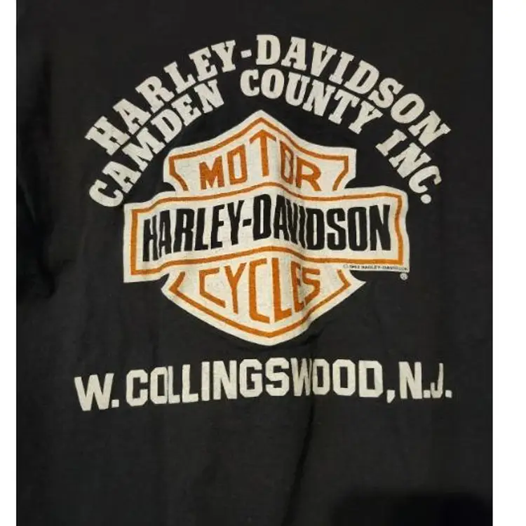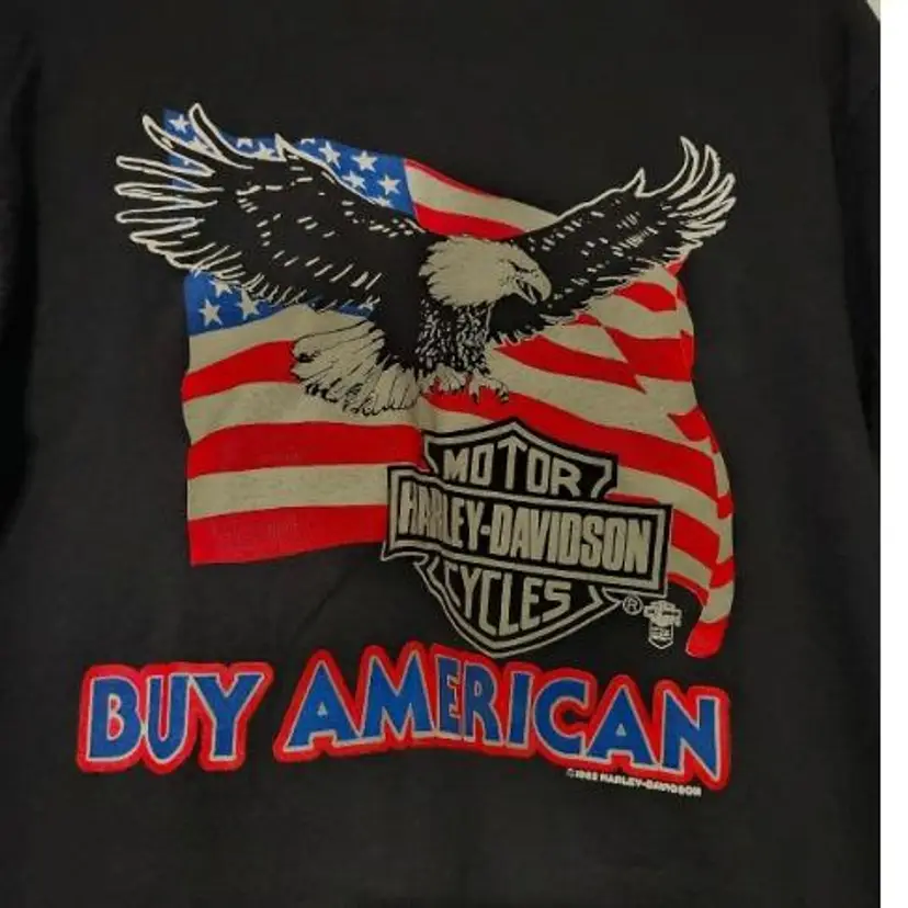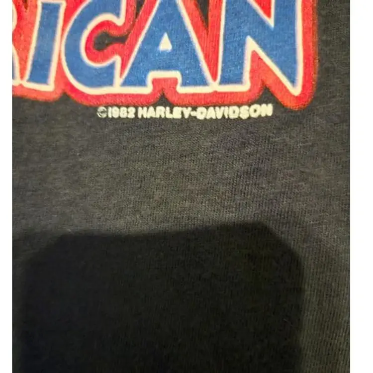 1982 Buy American Harley-Davidson men's tshirt. Single stitched men's size XL. There is no size tag. The collar is slightly stretched and the black is starting to fade.Preowned