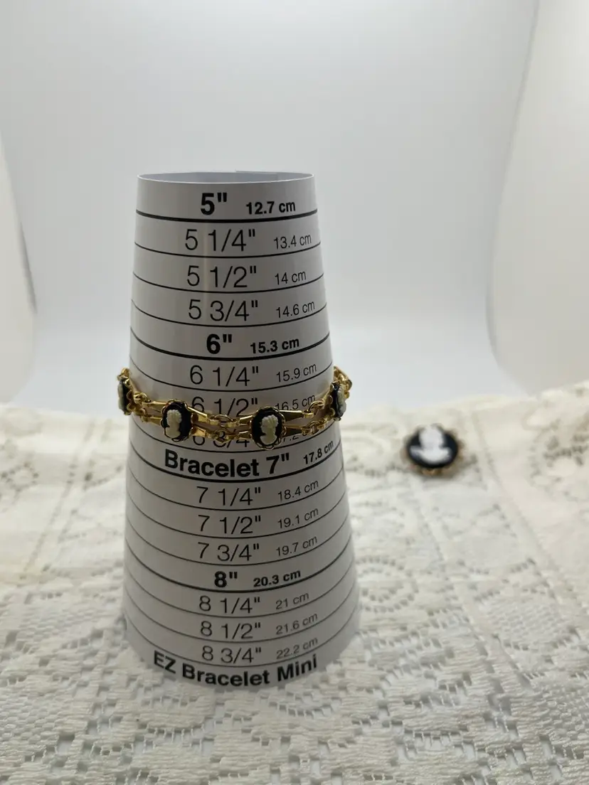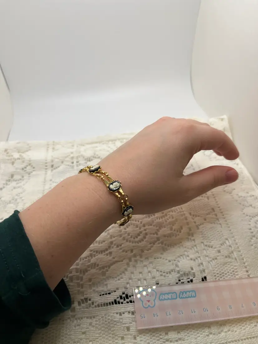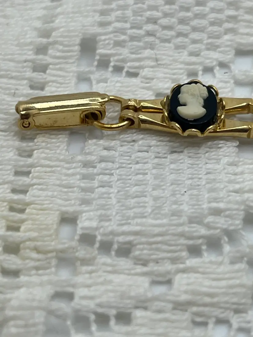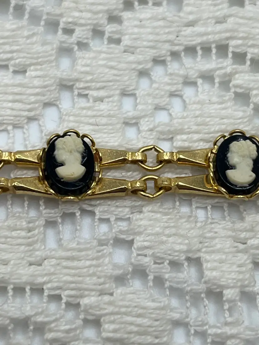 • Links: Seven round cameo cabochons (white on black plastic) set in gold-tone frames, connected by slim rectangular links