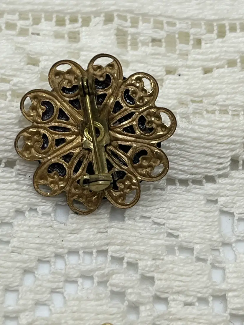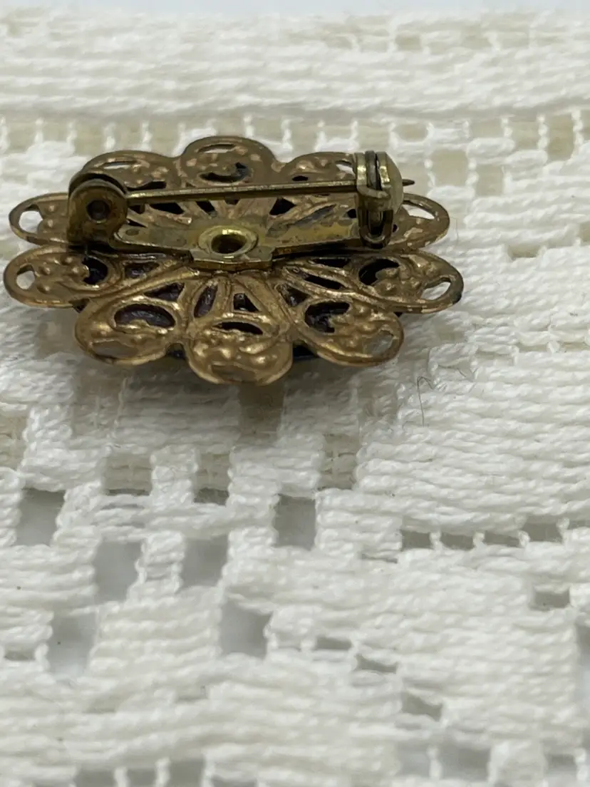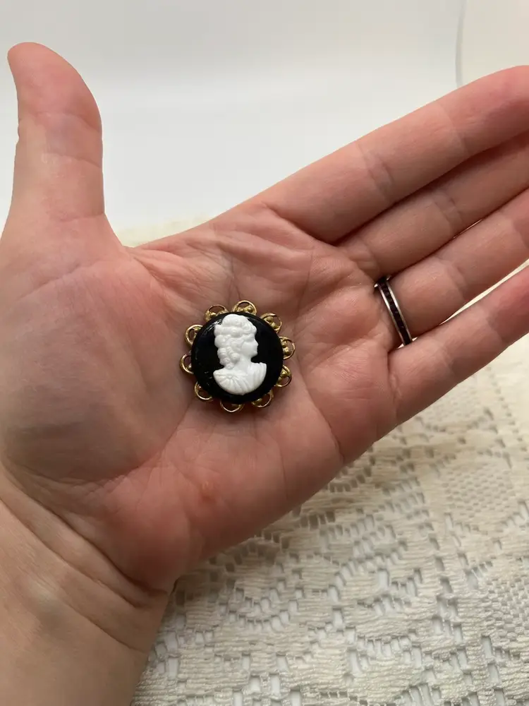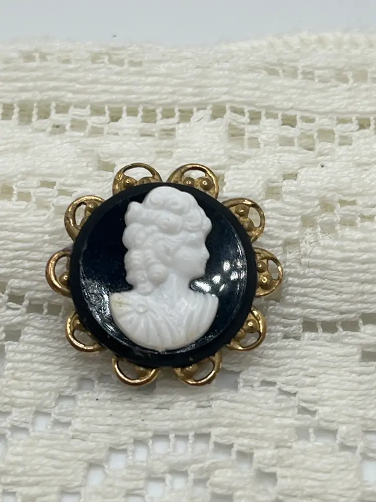 • Material: Molded vintage plastic cameo, gold-tone base metal