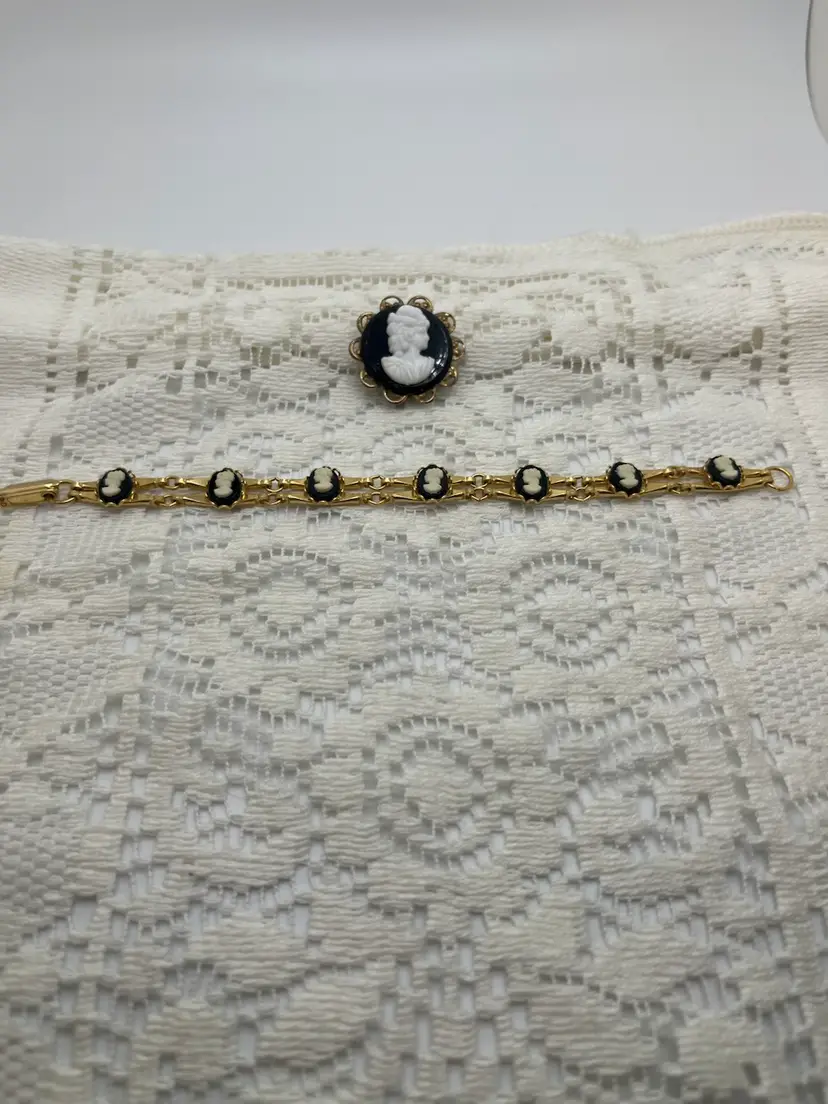 Elevate your look with this charming vintage cameo duo—two coordinating pieces you won’t find anywhere else, sold together as a set! Each features a classic black-and-white plastic cameo profile set in warm gold-tone metal. Perfect for adding a touch of retro-Victorian flair to any outfit.