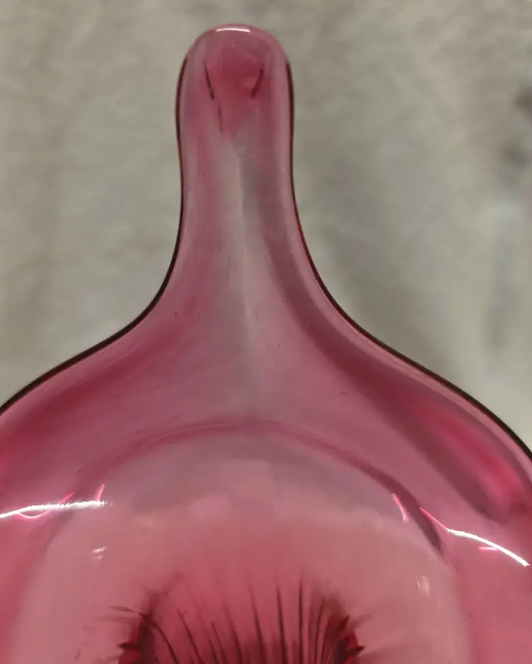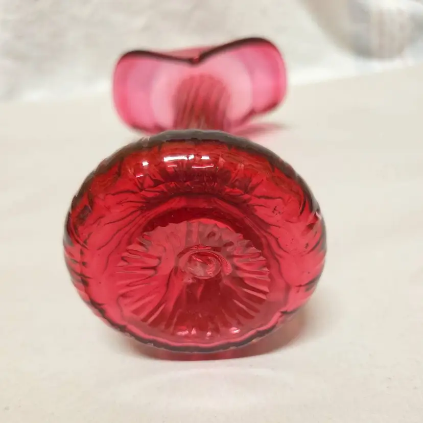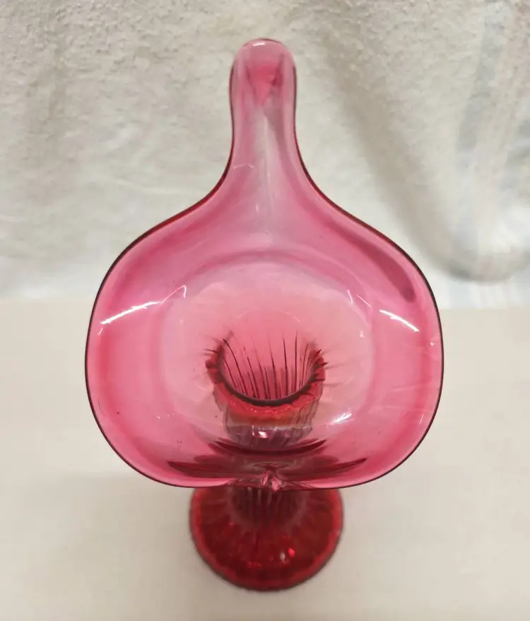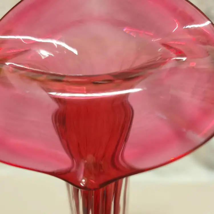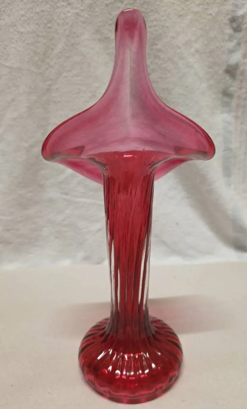 This Vintage Art Glass Cranberry Jack-in-the-Pulpit Vase from Canada is a unique and decorative piece that showcases traditional craftsmanship and a cranberry red color. Handmade in Canada in the mid-20th century, this vase features a solid pattern and a glossy finish, adding a touch of elegance to any room. Standing at 9 inches tall and unmarked with a brand, this hand-blown glass vase is perfect for displaying flowers or simply as a striking decorative piece.