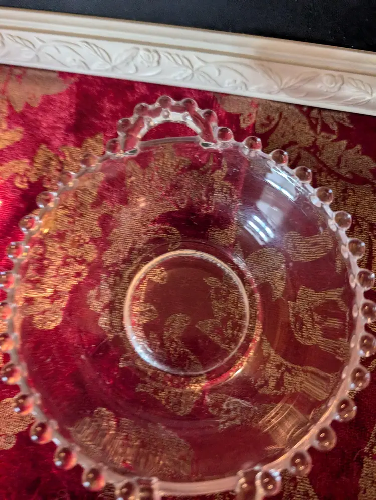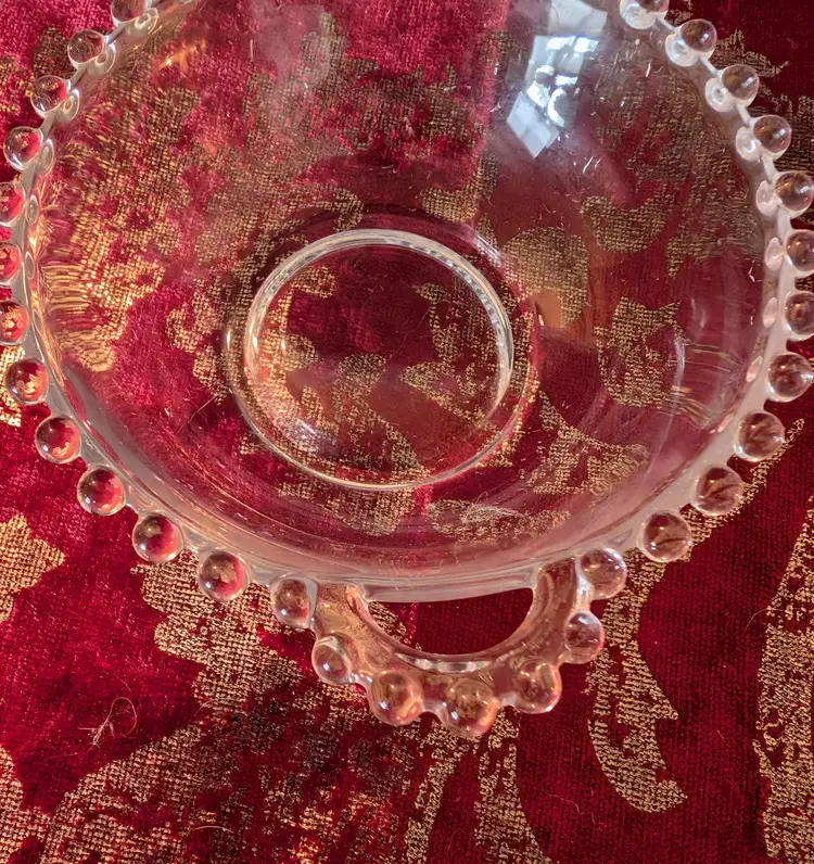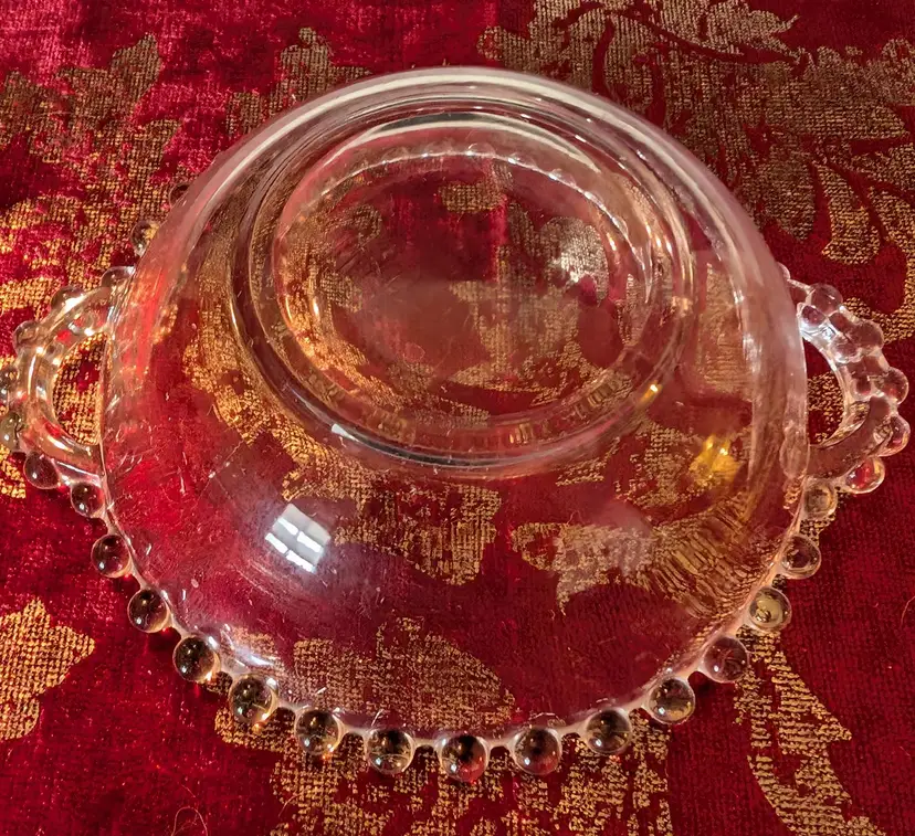 Charming vintage Candlewick glass bowl featuring a delicate beaded rim and dual handles. This lovely piece is in excellent condition with no visible chips or cracks, making it a perfect addition to your collection or as a decorative accent. The bowl measures approximately 6 inches in diameter, ideal for serving or display. Add a touch of vintage elegance to your home with this unique find.