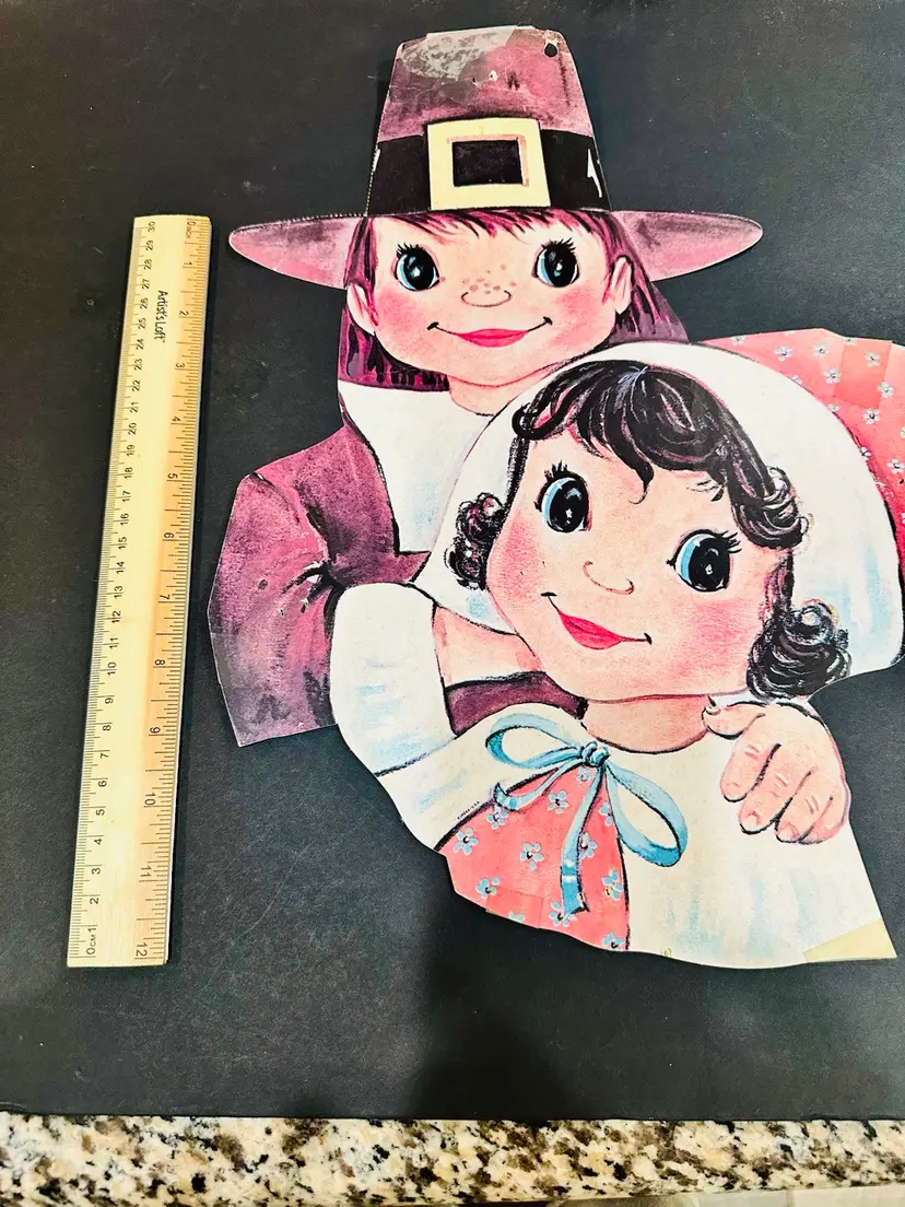 Add timeless charm to your Thanksgiving decor with this vintage cardboard wall piece featuring classic Pilgrim characters! At 16 inches tall, this vibrant decoration showcases a Pilgrim in an orange bonnet and a Pilgrim in a brown hat, bringing warm autumn tones and nostalgic style to any room.