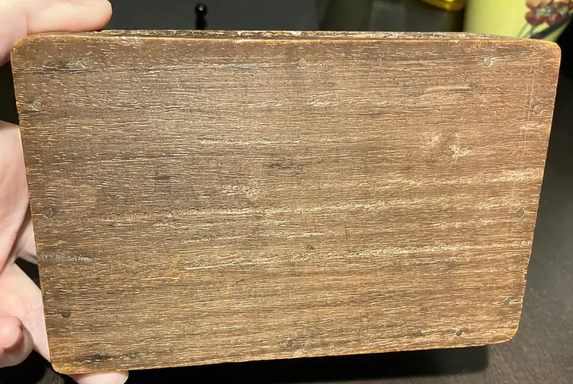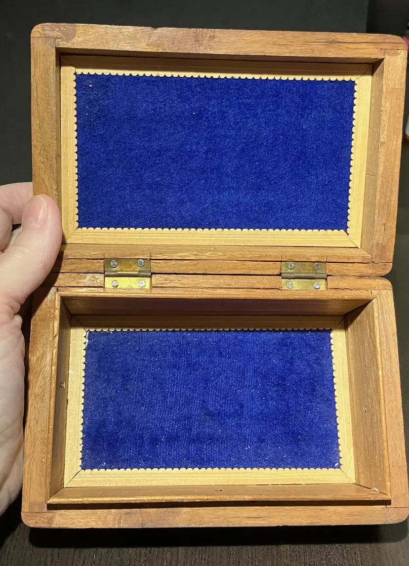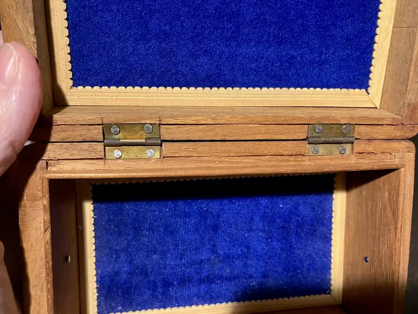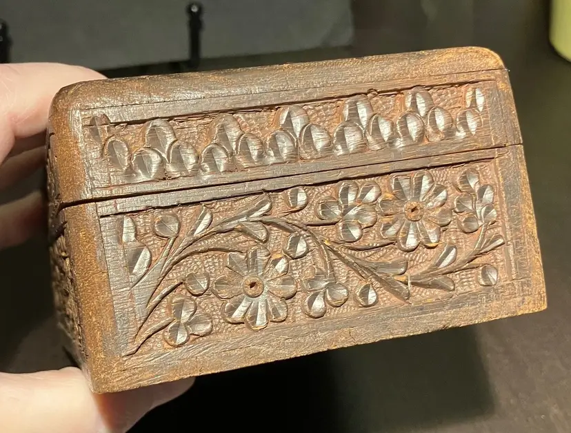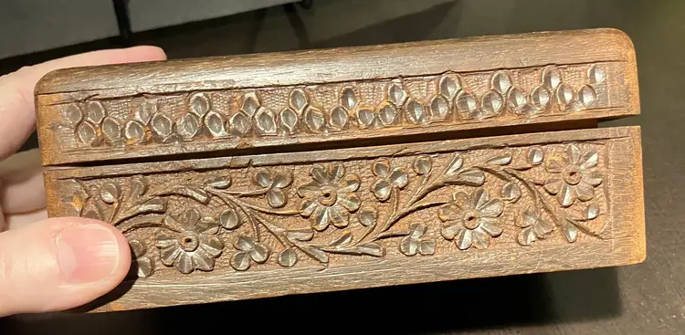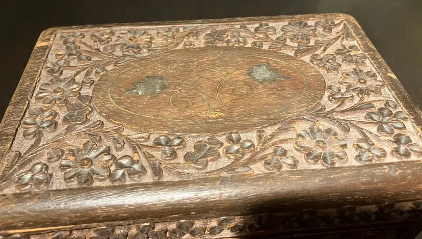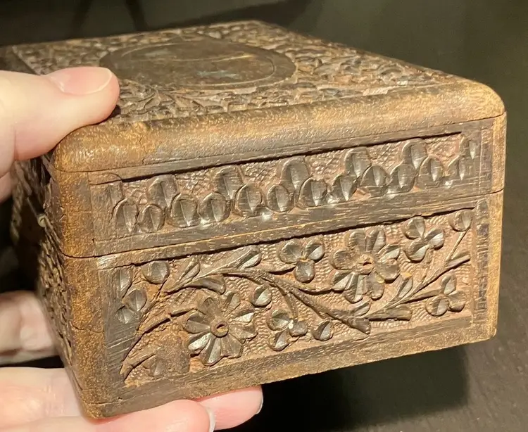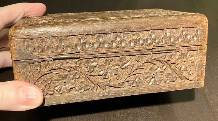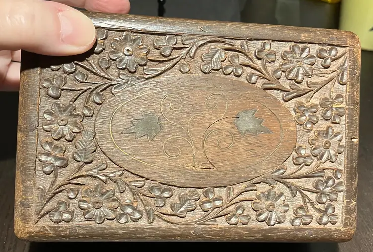 Carved Wooden box likely made in India. Somewhat worn blue cloth interior. There is wood worn around the nails on the top. The leaf and vine image on the top has been damaged - it looks like some of the filling that represents the vine has been removed. Dimensions: 6" by 4" by 2 1/4".
