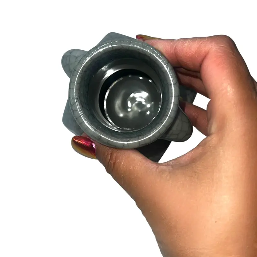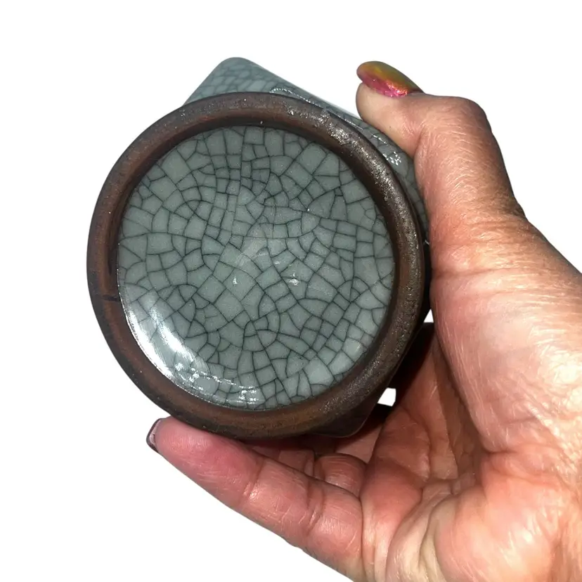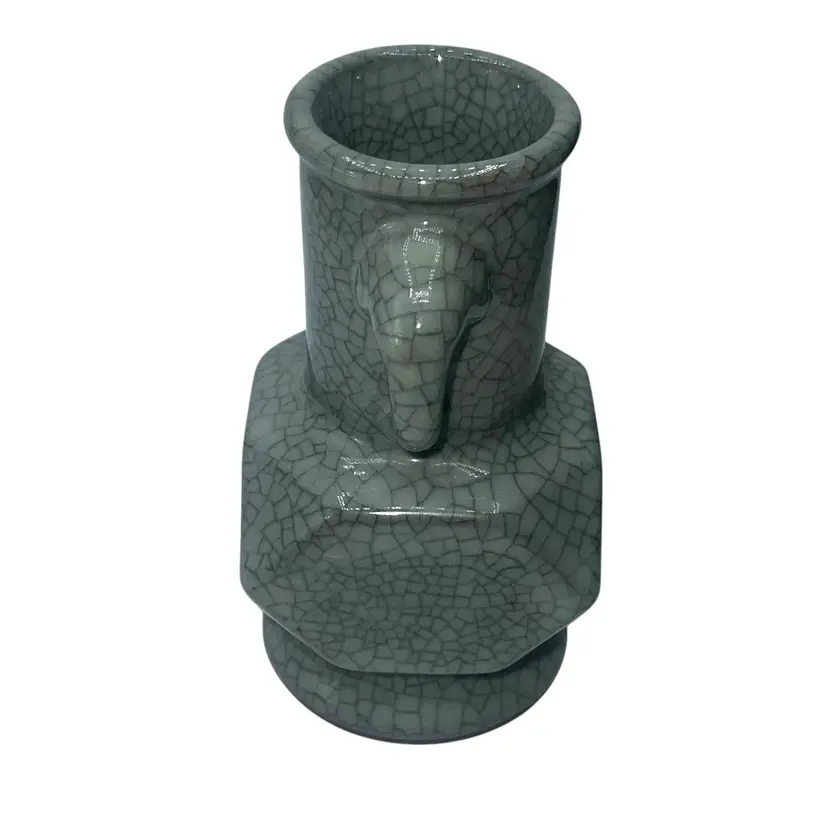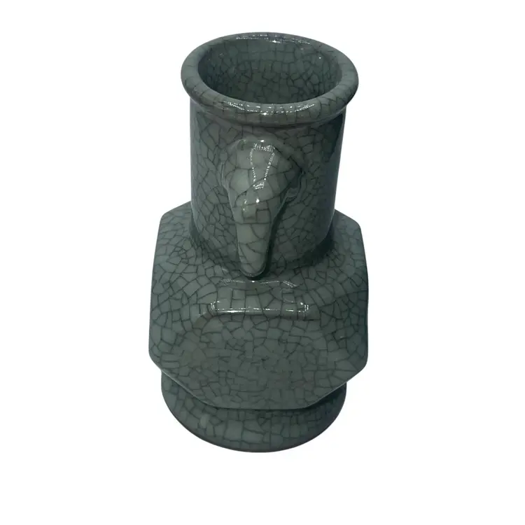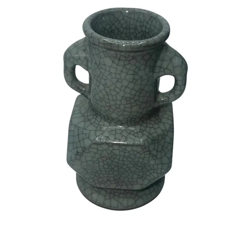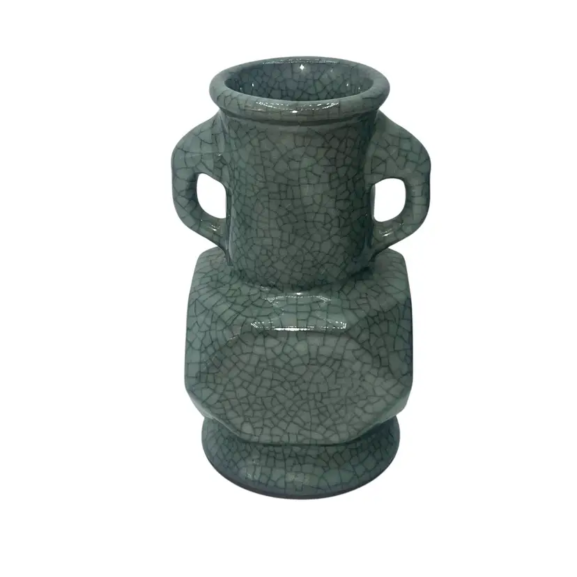 This vintage celadon crackle glaze vase showcases the timeless Ge/Guan-style tradition of Chinese pottery. Standing 5.25 inches tall with a 2-inch opening, it features a distinctive double-handled form with geometric shaping and a refined gray-sage glaze. The surface displays intentional craquelure (crackle lines), both inside and out, a hallmark of classic celadon aesthetics. The base reveals a red clay body, adding warmth and authenticity. • Height: 5.25” • Opening Diameter: 2” • Body: Red clay/stoneware with celadon crackle glaze • Handles: Twin side handles in archaistic form • Color: Gray-sage with full-body craquelure • Condition: Excellent vintage condition. No chips or cracks; crazing is intentional.