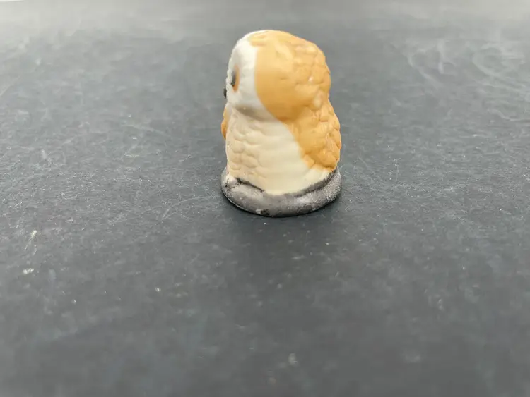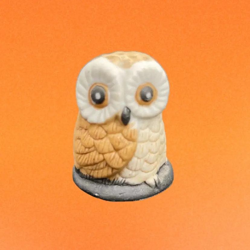 This adorable vintage ceramic thimble figurine is a must-have for any collector or seamstress. The hand-painted design features a charming owl with intricate details on porcelain. Made in Taiwan, this vintage original thimble is perfect for adding a touch of boho style to any sewing project or display. Its unique design is sure to catch the eye of anyone who sees it, making it a great addition to any collection.
