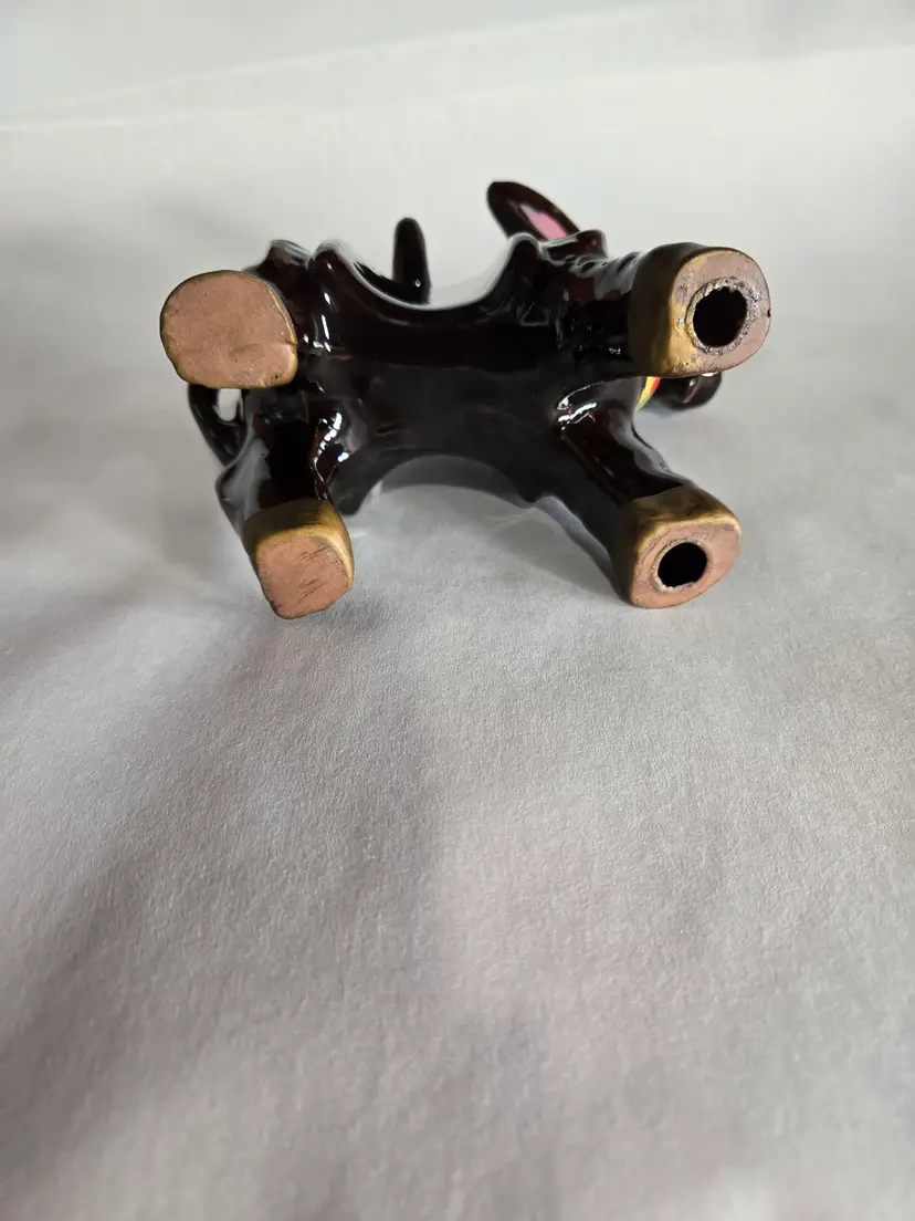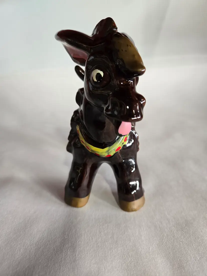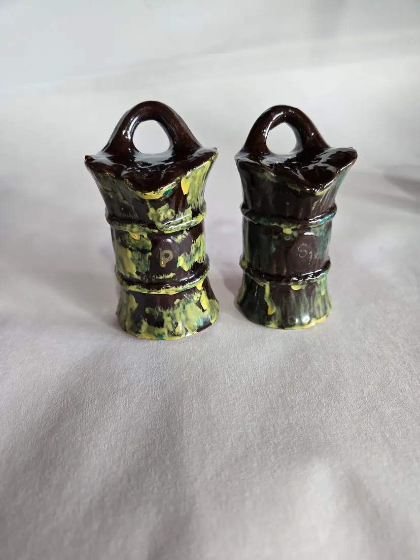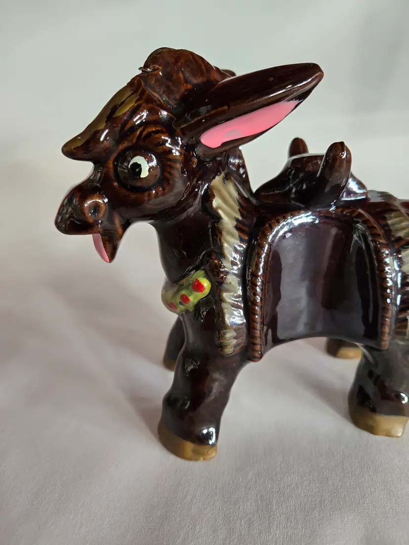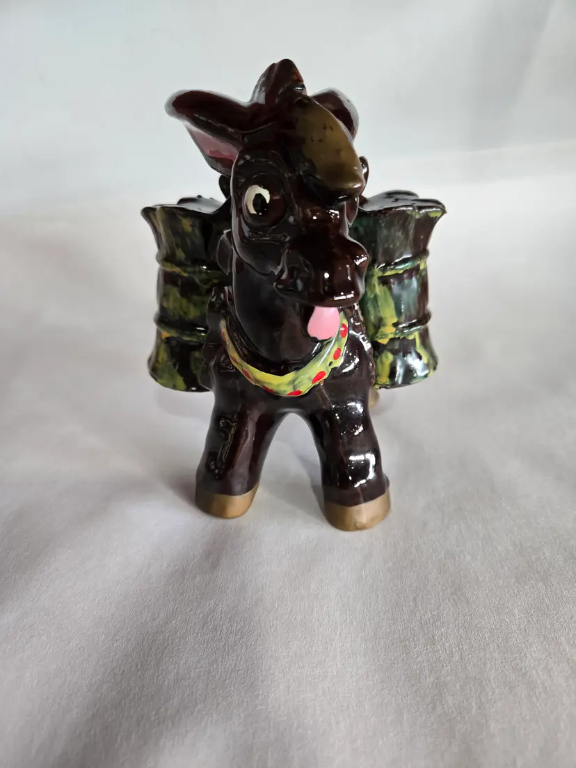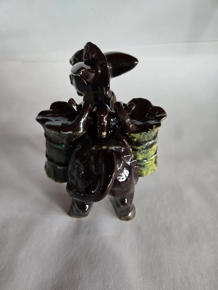 This cute salt and pepper set features a large donkey with two barrels hanging off it's saddle. The barrels are the salt and pepper shakers. One is missing a cork.