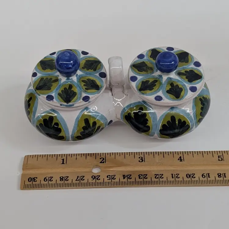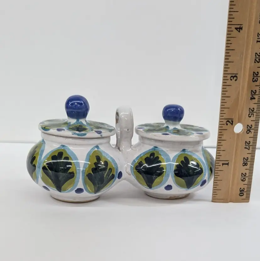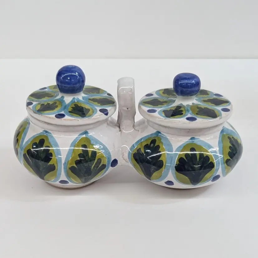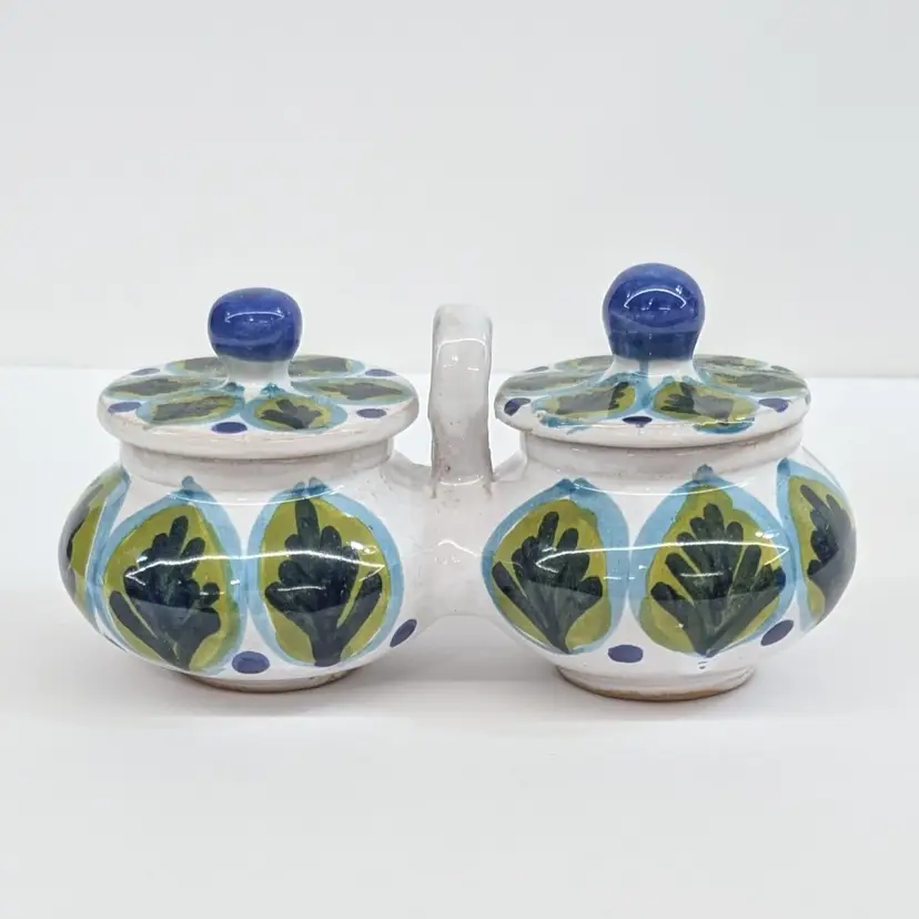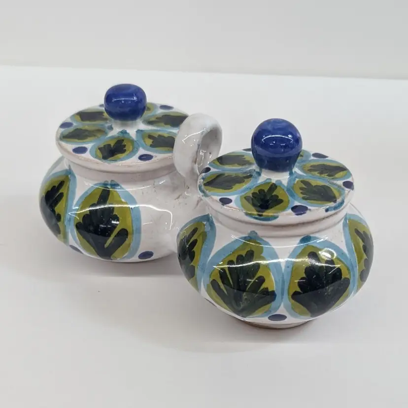 Cute, little condiment or spice jars that are connected together with a handle in the middle and little knobbed lids. A pretty green and blue hand painted design on both the jars and lids. In nice used condition with minimal wear, there is a little glaze missing inside the handle from manufacturing (see pictures). Measurements ~ 4.75 x 2.5 x 2.25"