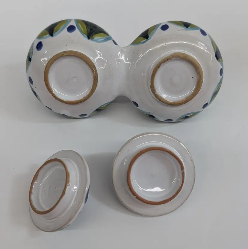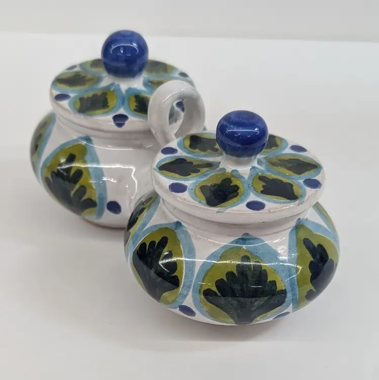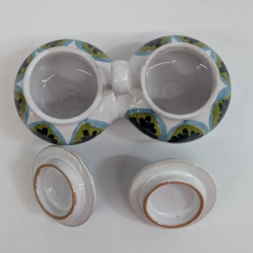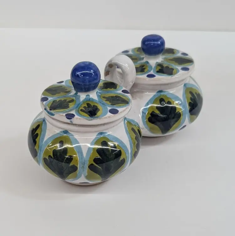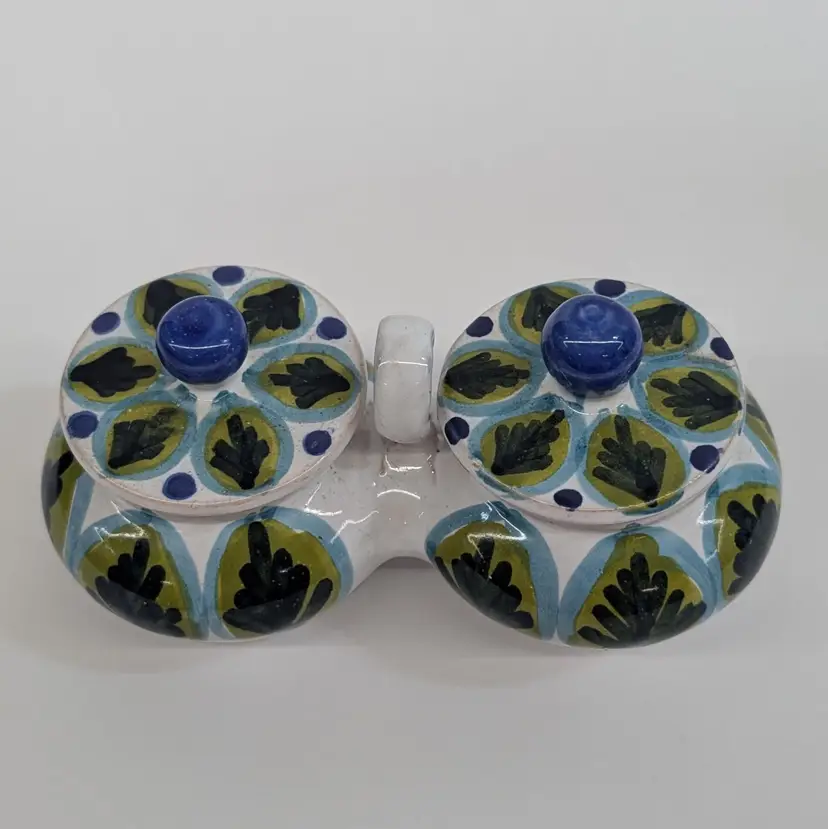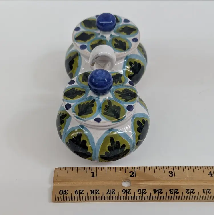 Cute, little condiment or spice jars that are connected together with a handle in the middle and little knobbed lids. A pretty green and blue hand painted design on both the jars and lids. In nice used condition with minimal wear, there is a little glaze missing inside the handle from manufacturing (see pictures). Measurements ~ 4.75 x 2.5 x 2.25"