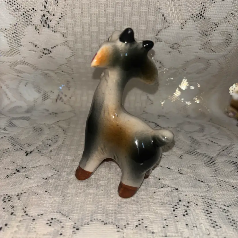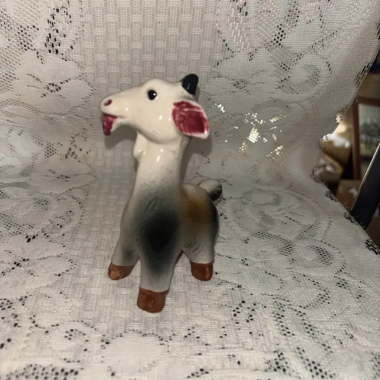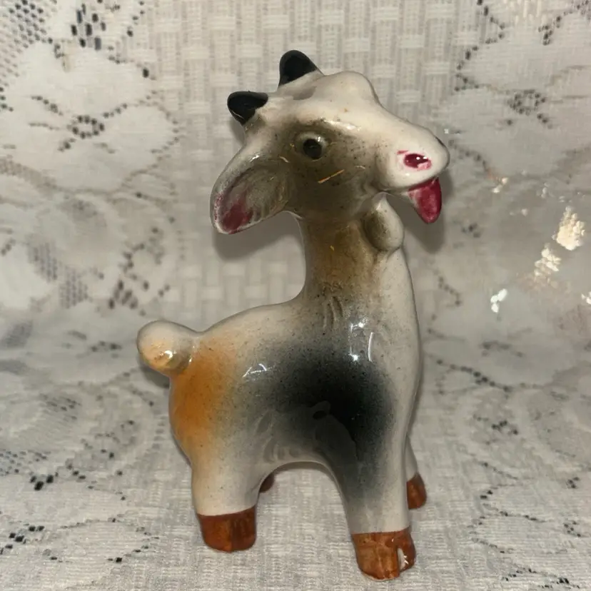 This vintage ceramic goat figurine is a charming piece that embodies whimsy and nostalgia. Made in Japan, this farm animal figure showcases a kitsch style reminiscent of mid-century modern aesthetics. The artist's Anime-inspired design adds a touch of fun to any collection or décor, making it a unique and eye-catching addition to any space.