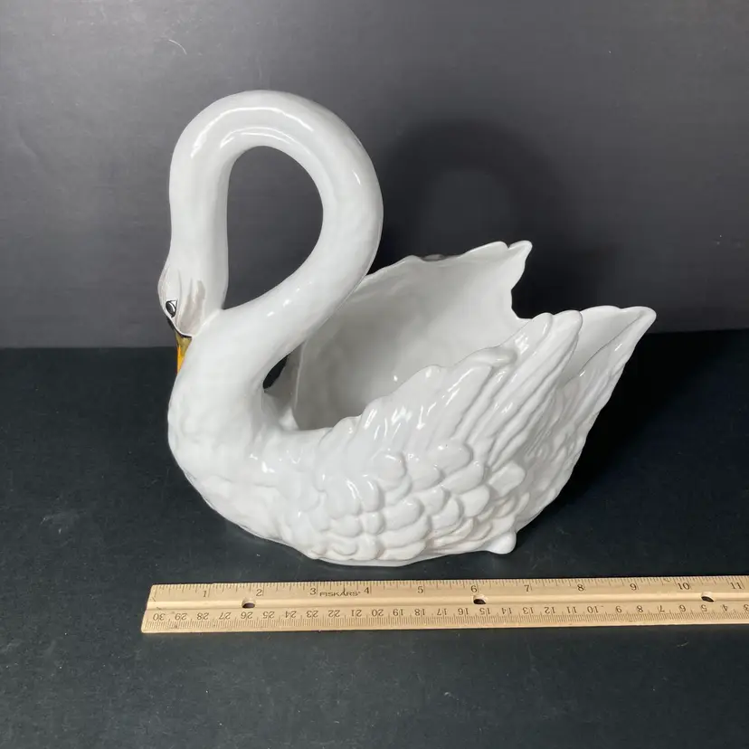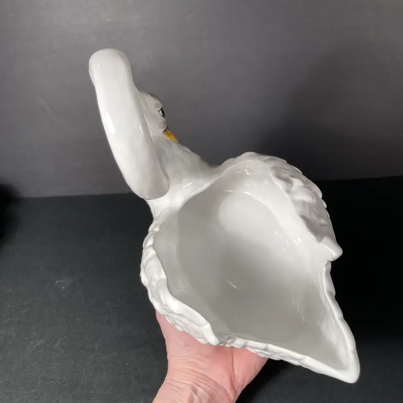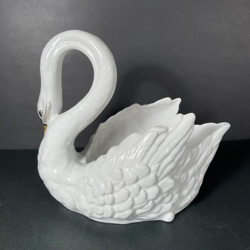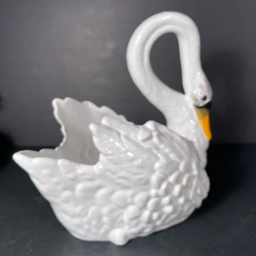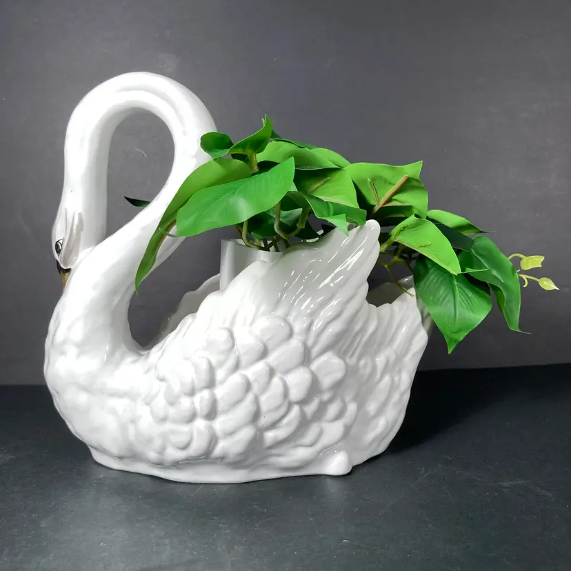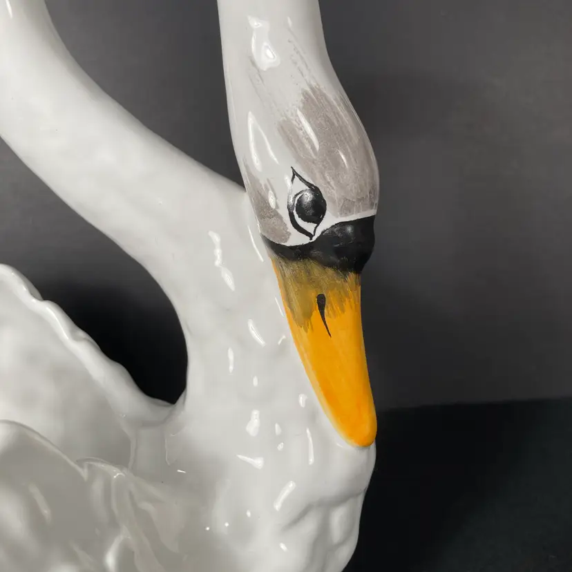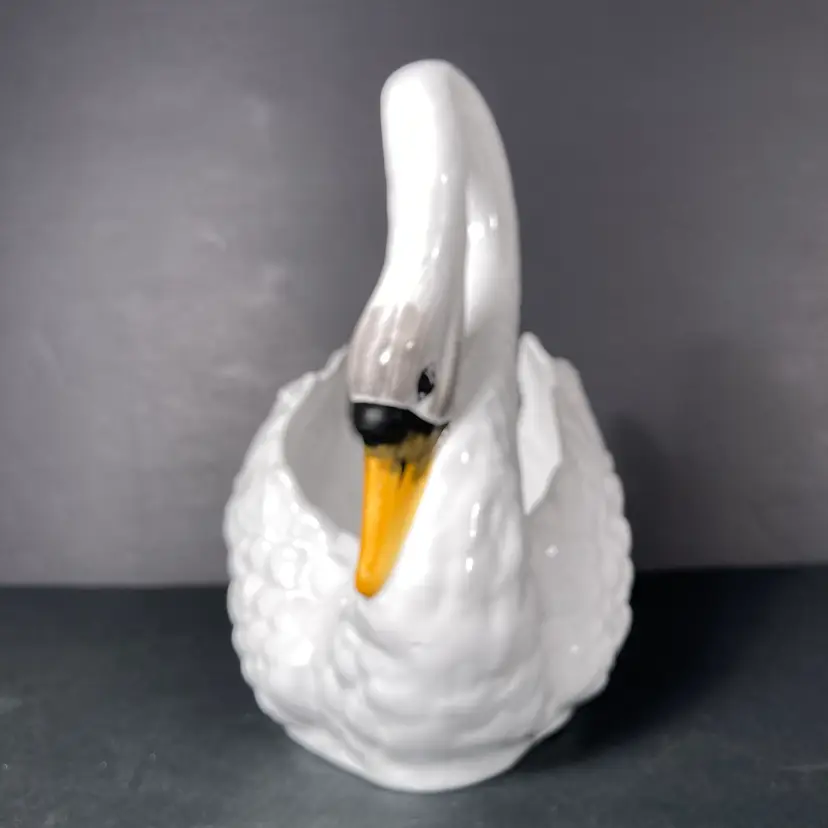 Handsome vintage ceramic swan cachepot or planter, made by RB Alcobaca, Portugal, 1975-1990. Classic design with understated hand painted features.