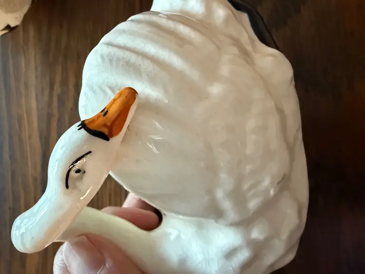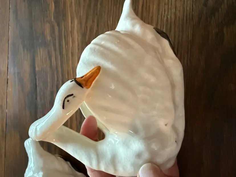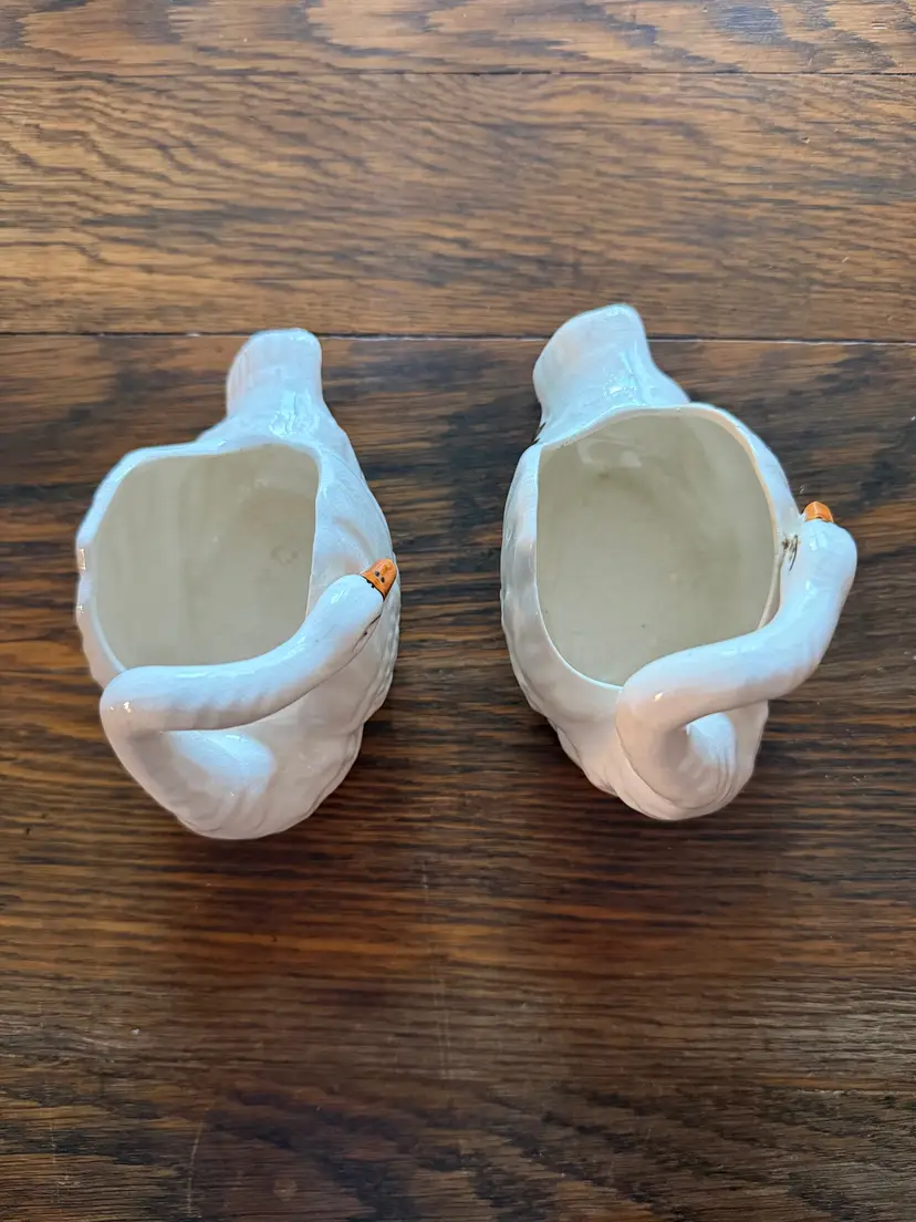 Elegant pair of vintage ceramic swans, made in Japan circa 1940s–1950s. Each features graceful curved necks, hand-painted beaks and eyes, and gentle crazing that adds authentic vintage character. Perfect for small floral displays, vanity decor, or shelf styling.