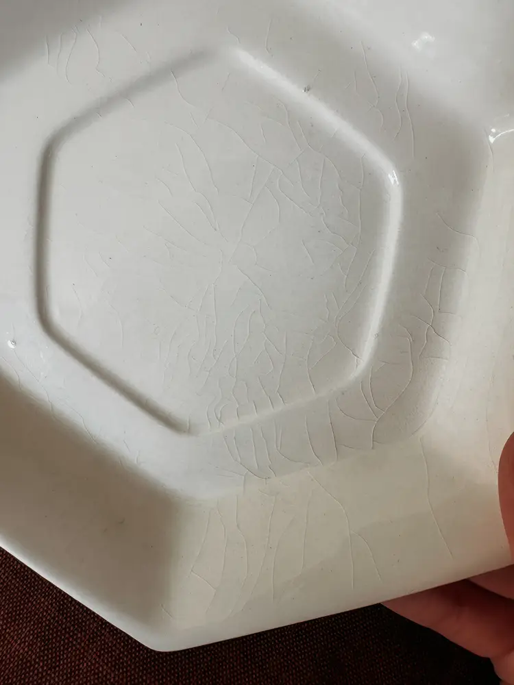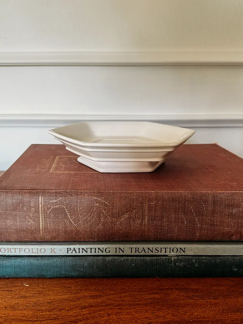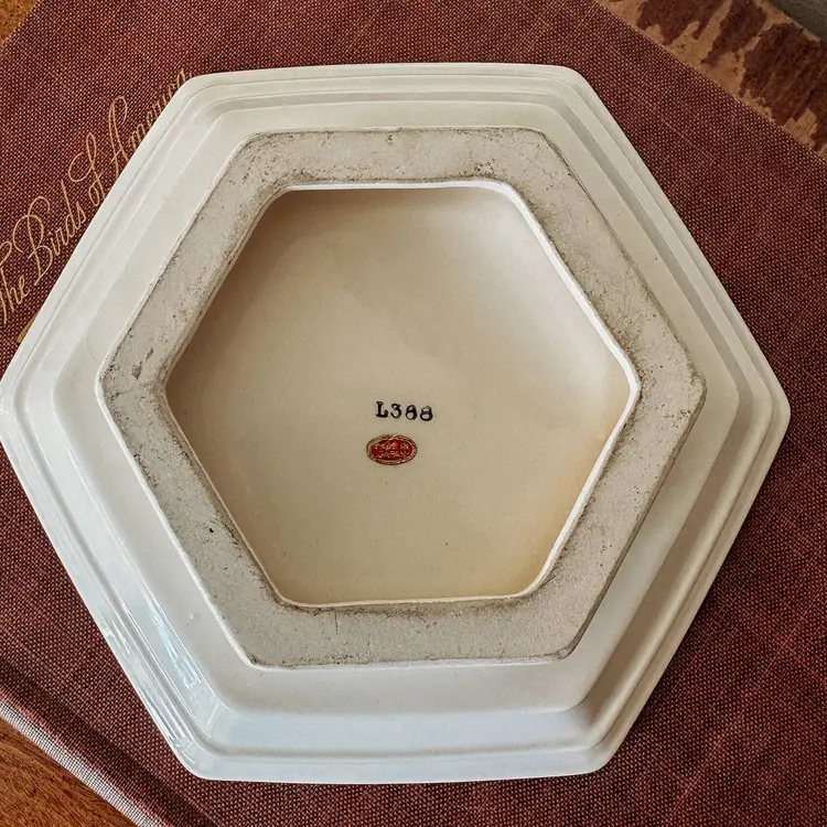 Hexagon shape with a short pedestal base, this lovely cream/ivory dish makes a lovely riser for a candle, soap, or planter. It has beautiful crazing and is marked "made in Japan" on the bottom. The manufacturer is unknown. A lovely addition to any European style home! 7"x2"