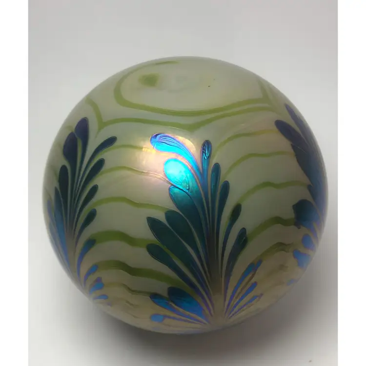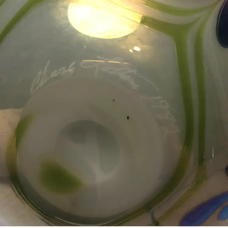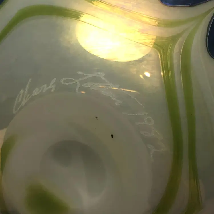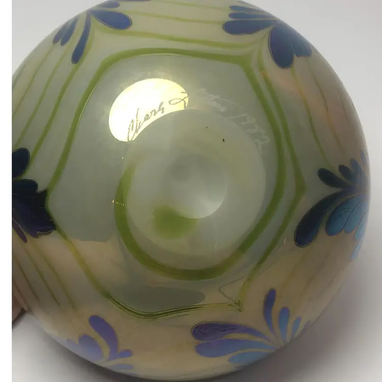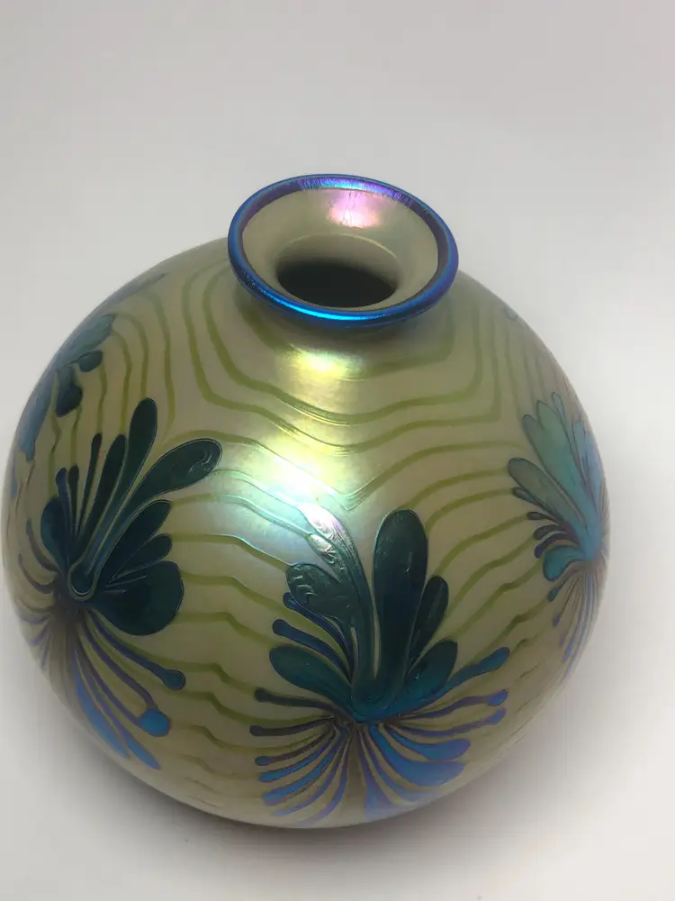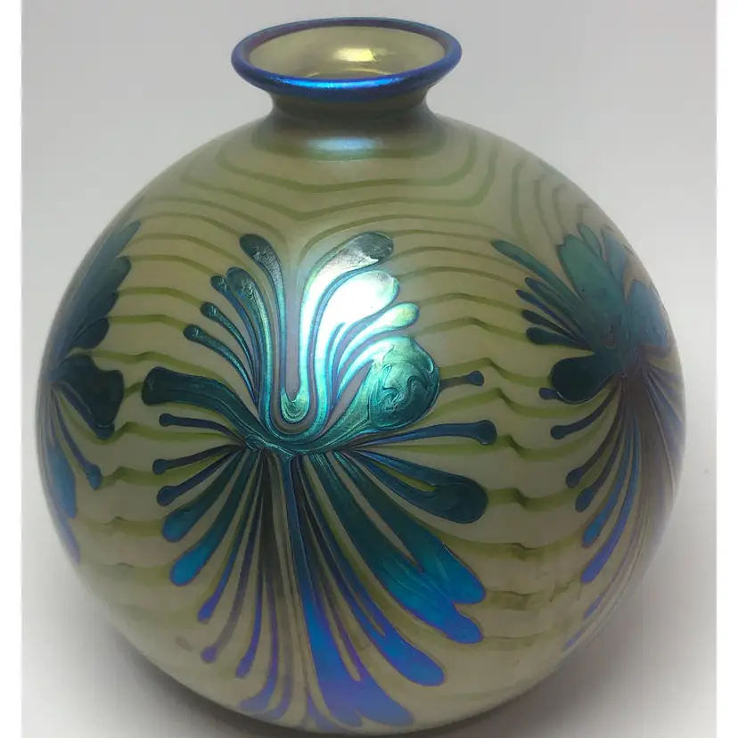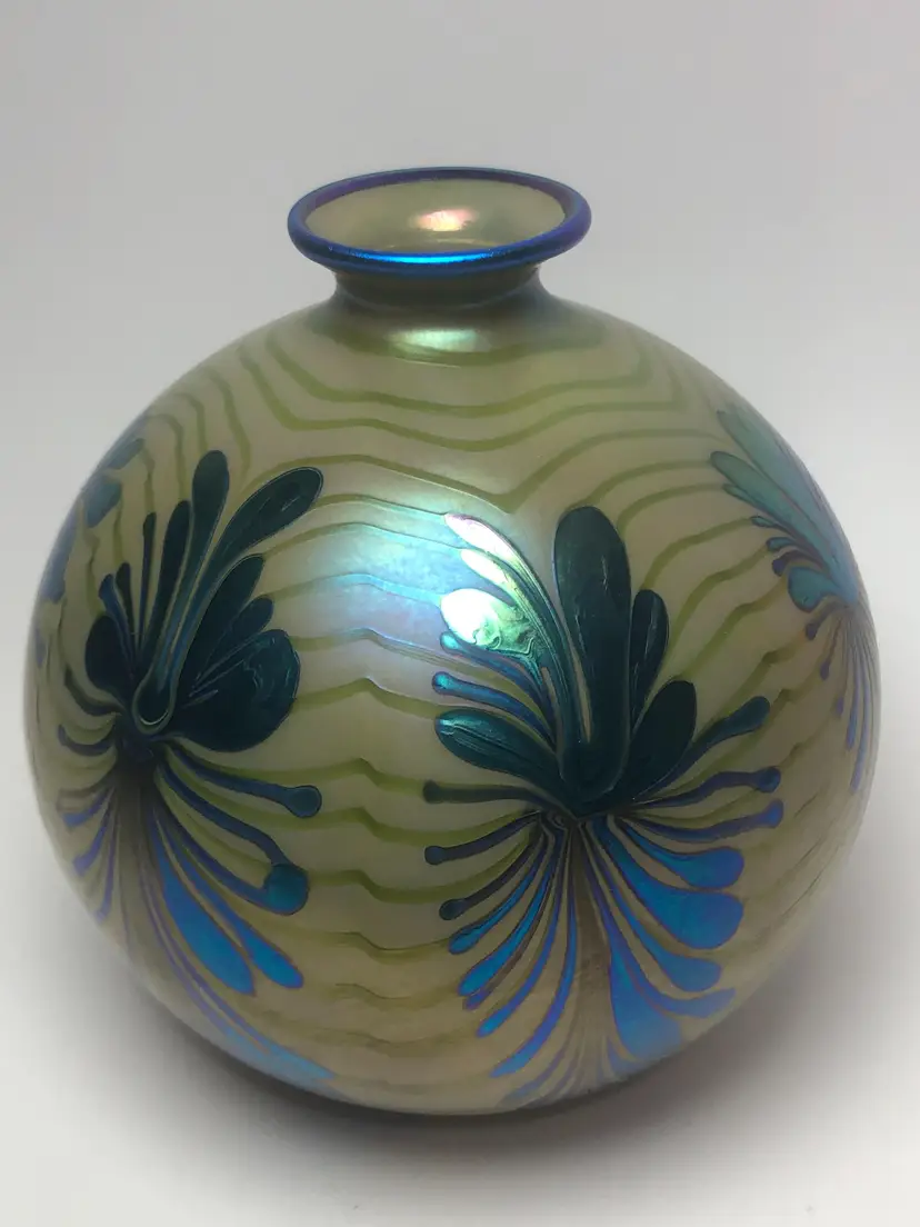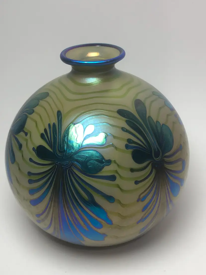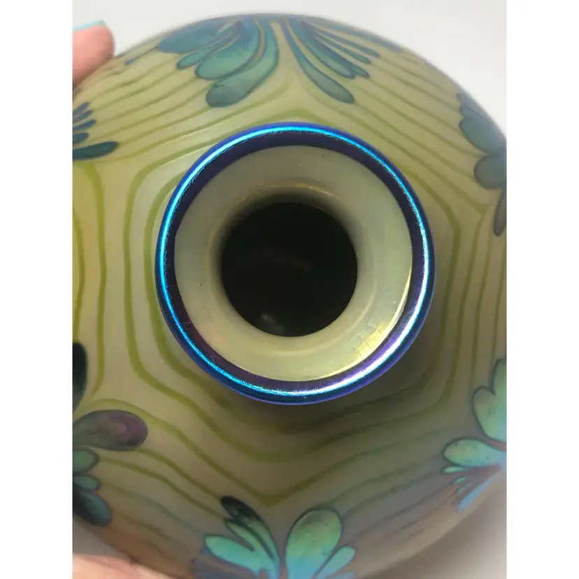 Vintage Charles Lotton Olive Green Vase Blue Luster Pulled Feather Design signed 1982. Excellent condition with no chips and no cracks. I do not see any surface wear. Vase is 6" tall x 1.75" diameter mouth x 5.5" diameter around.
