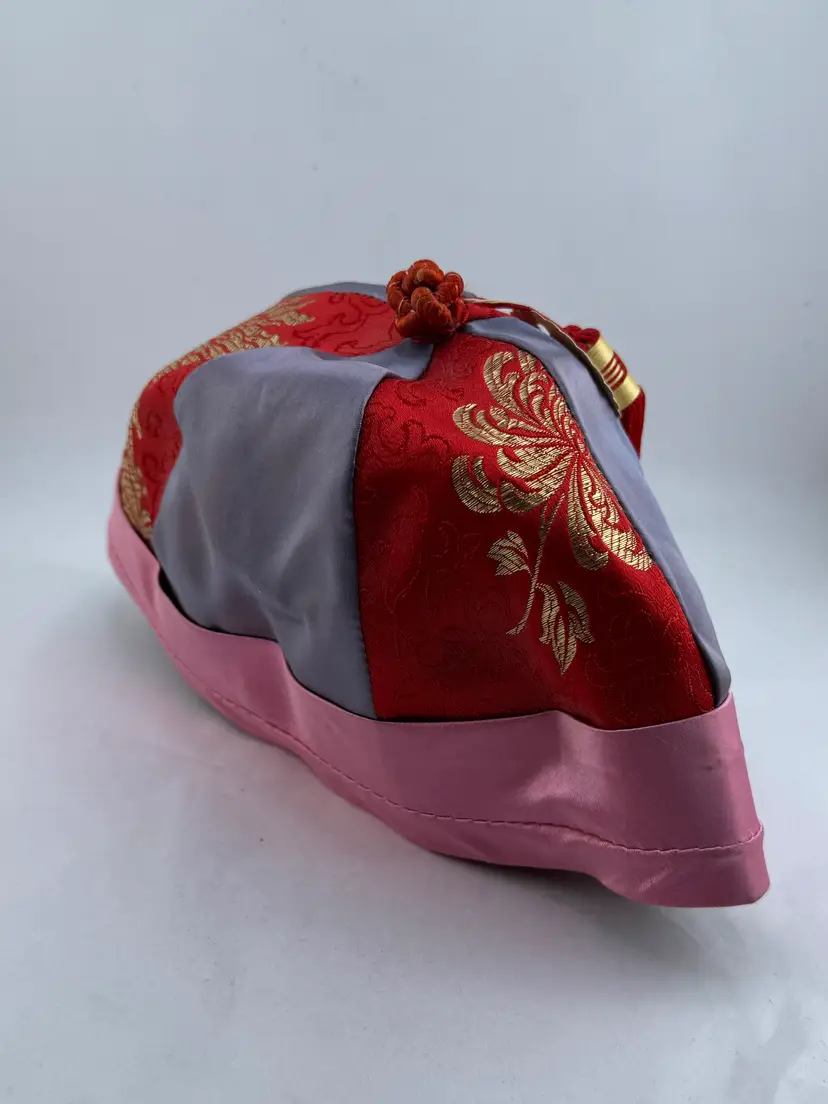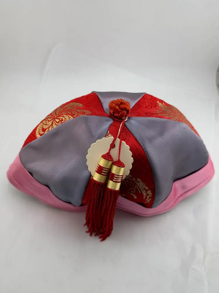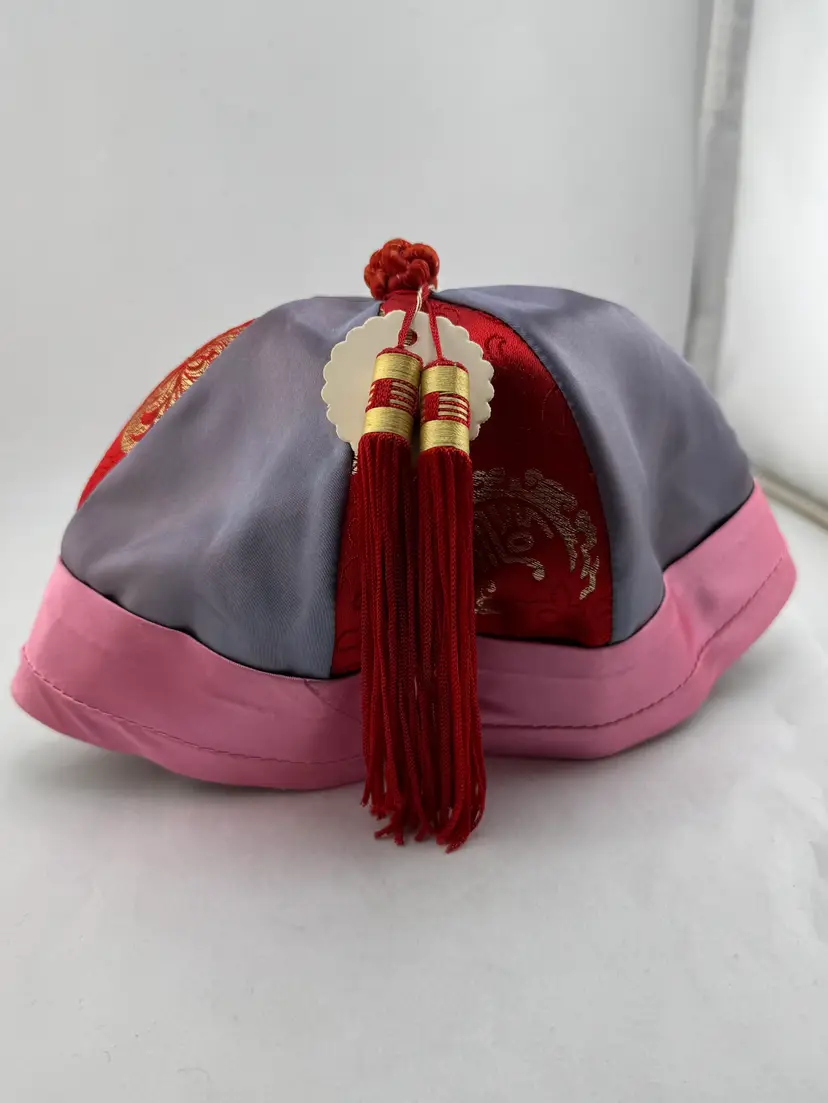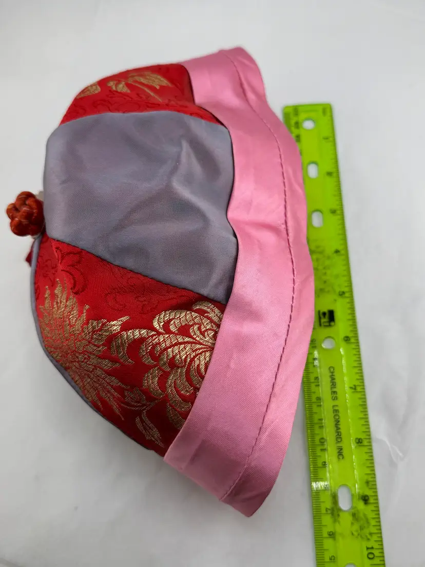 Vintage Chinese Skull Cap Pink Red Tassel Beanie Hat. Red tassels. Pink and red design. Skull cap Bernie. Tag reads 6 and marked 6 inside. INDOLLBOX.