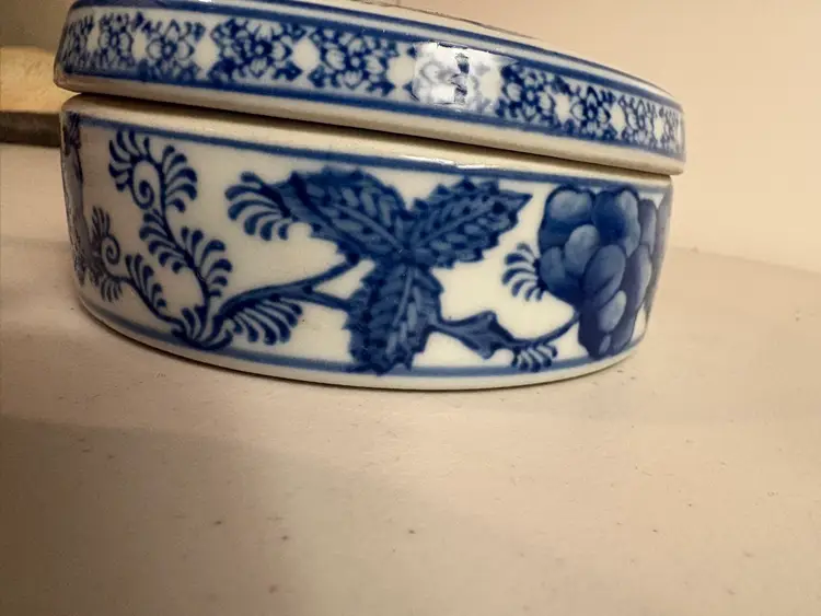 The vintage Chinoiserie porcelain trinket dish features a beautiful blue floral pattern, adding a touch of elegance to any space. Made of delicate porcelain, this round trinket box is adorned with a patterned finish that adds a unique charm to its design. Perfect for storing small treasures or serving as a decorative piece, this trinket dish is a beautiful addition to any collection or home decor.