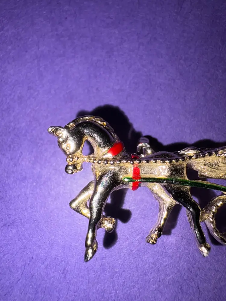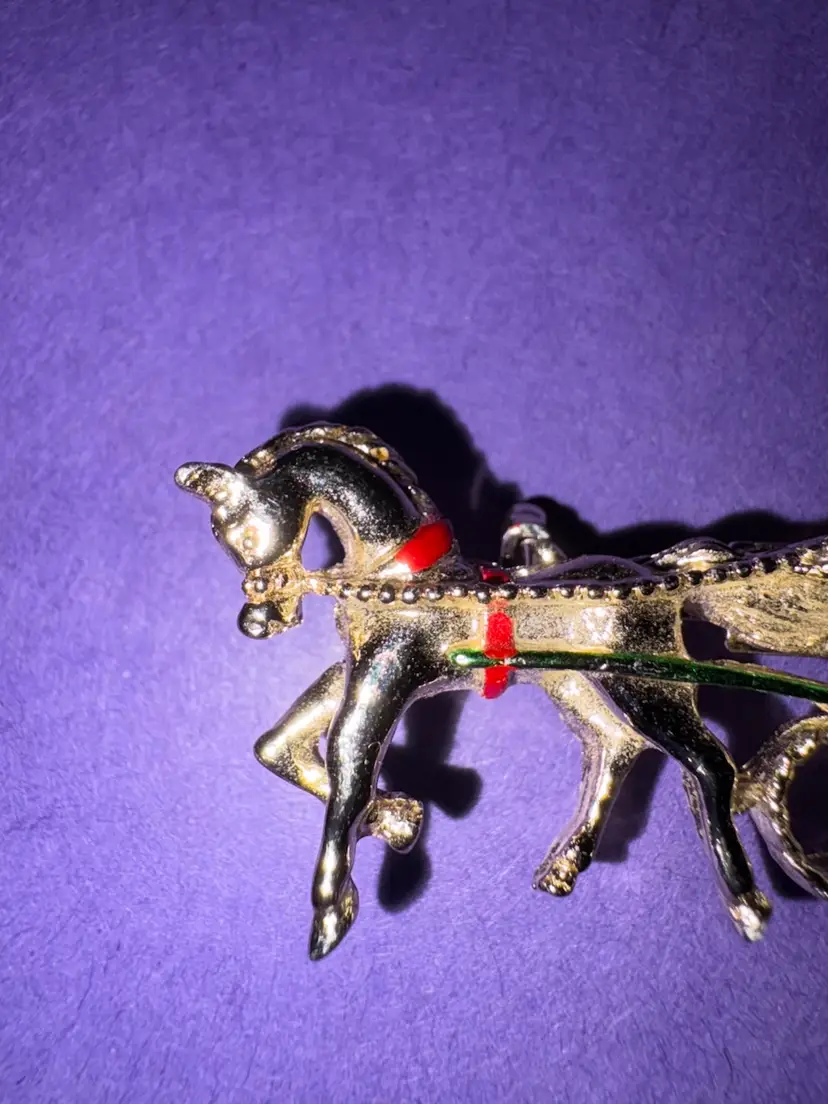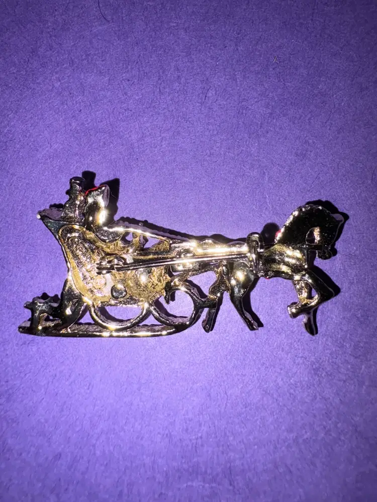 This is a great gold tone horse-drawn sleigh Christmas brooch with two people riding in the back. Has pretty holly and ivy. Color looks great! It is in excellent pre-owned condition.