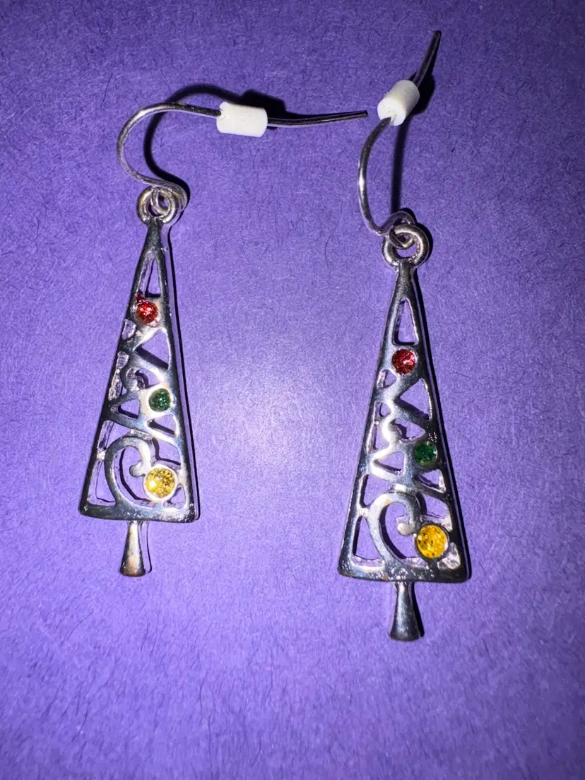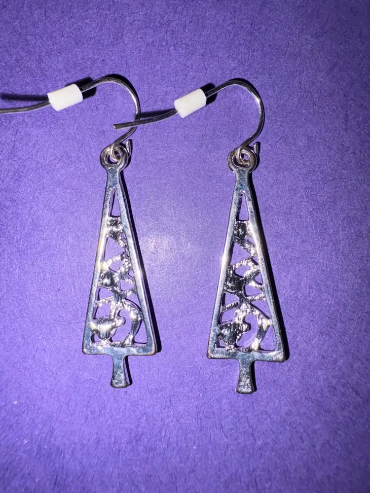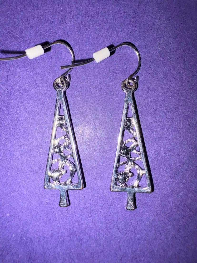 These Christmas Tree pierced earrings are in good vintage condition. Silver tone. Have a small amount of wear at the bottom of trees.