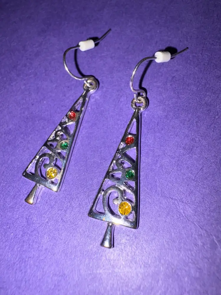 Vintage Christmas Tree Pierced Earrings - 1.25” Dangle — Silver Tone With Colored Dots