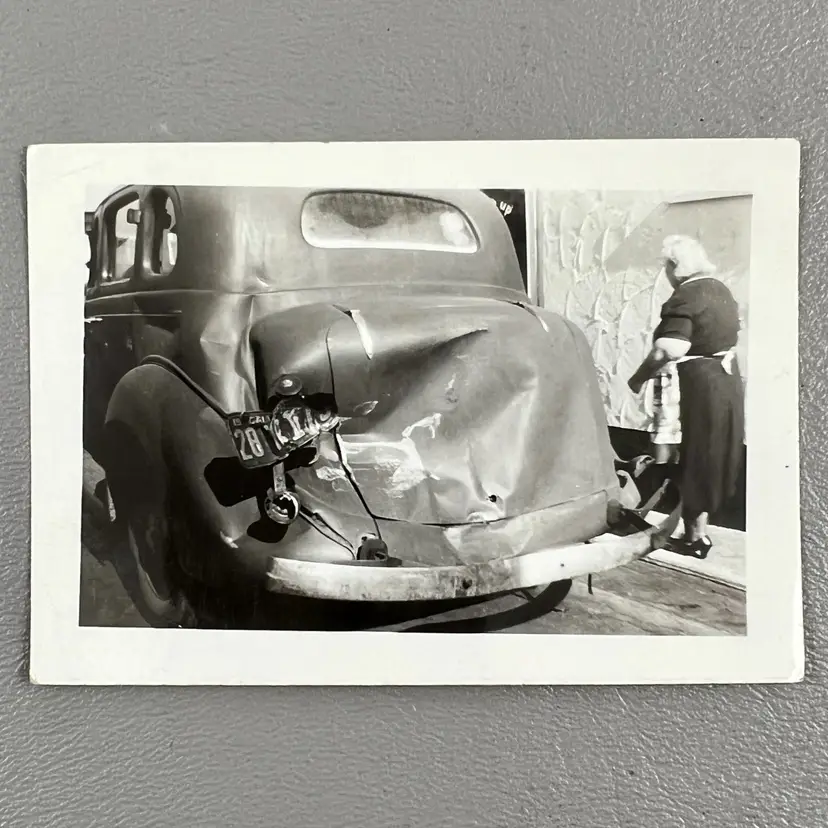 Vintage Classic Car Auto Accident Fender Bender Photo Snapshot 1930s-1940s California License Plate 2.5”x3.5”