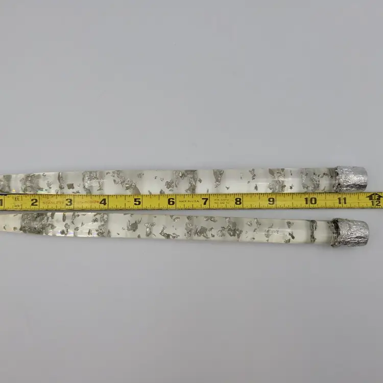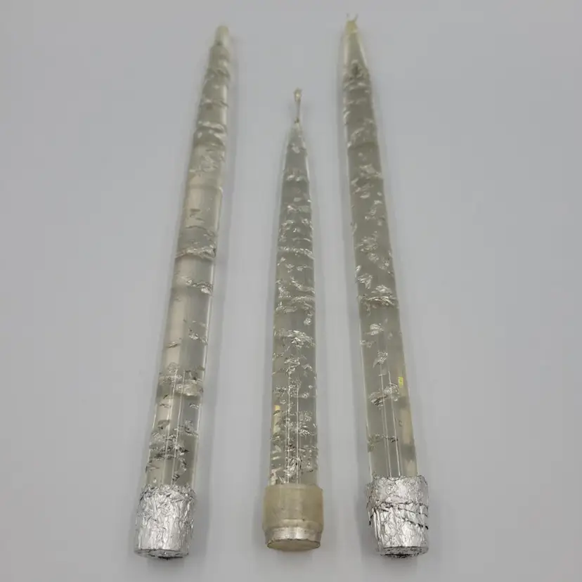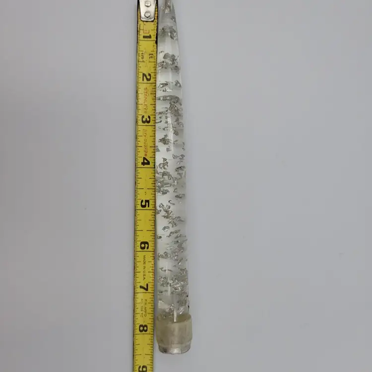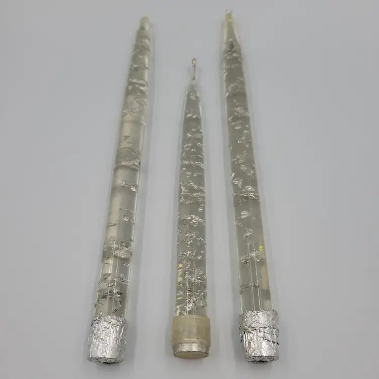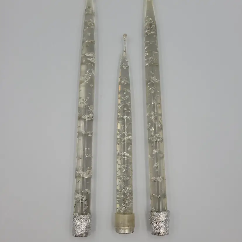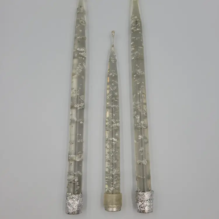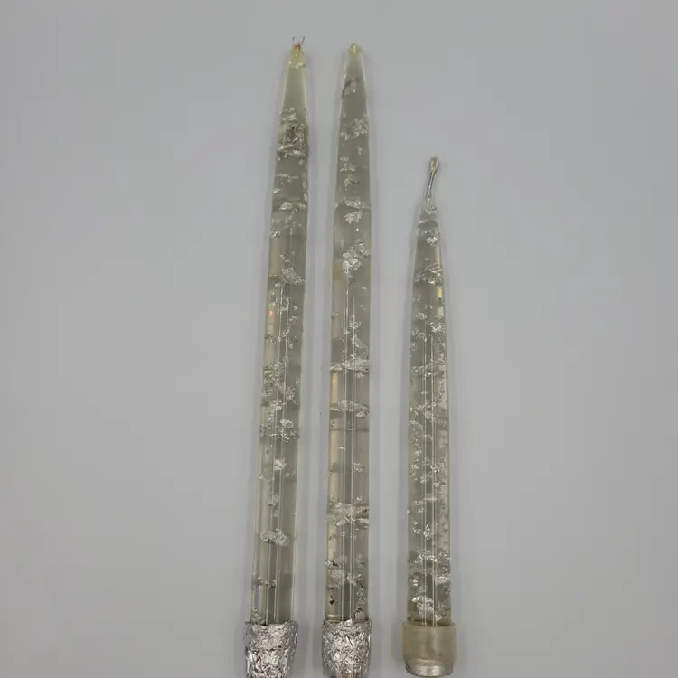 These 3 candles are all a clear lucite with silver flex. The two tall candles measure 11.50" tall and the shorter candle measures 8.25" tall. They ha w tape on the bottoms to help keep them stable in a candle holder. The two tall candles have damaged wicks, one totally missing and the other broken off (see photos). There is some minor discoloration in the lucite on the two large candles. There are no chips or cracks.