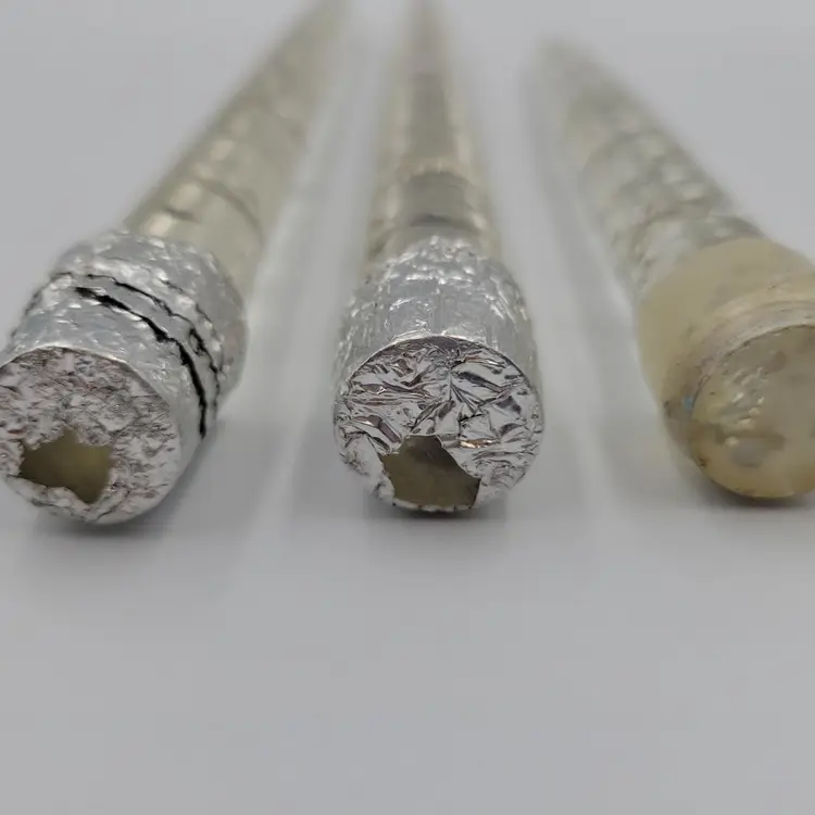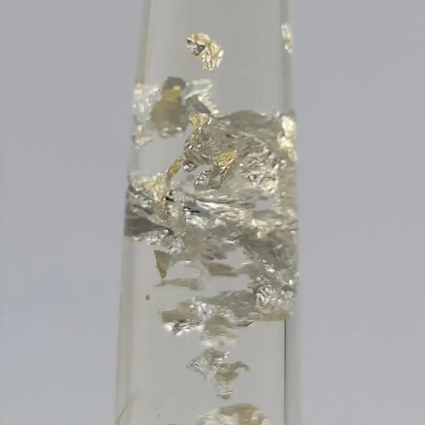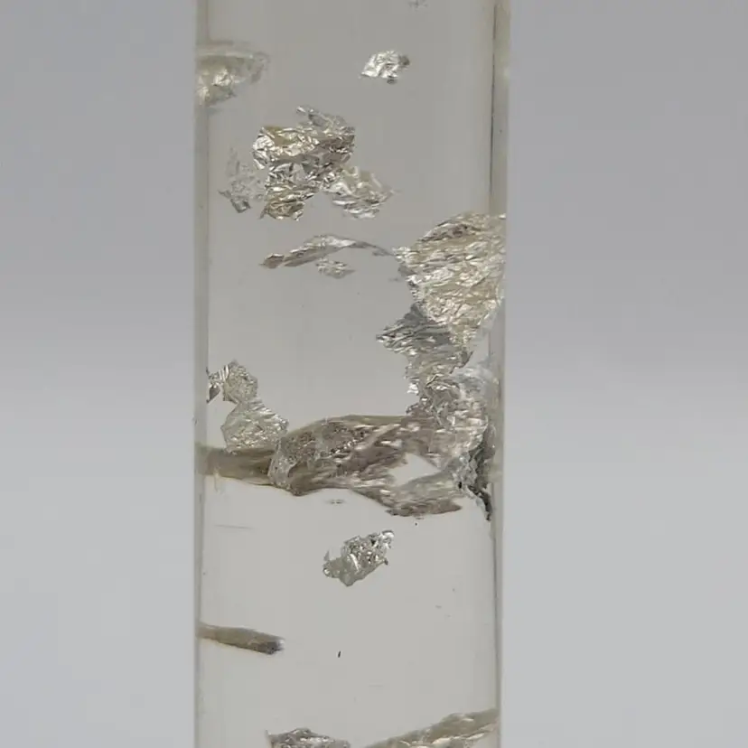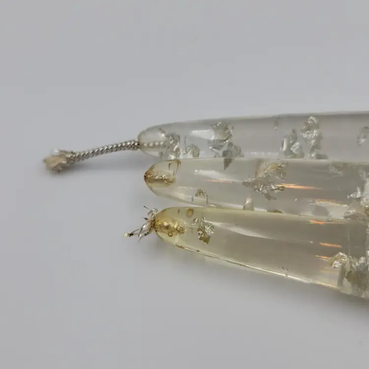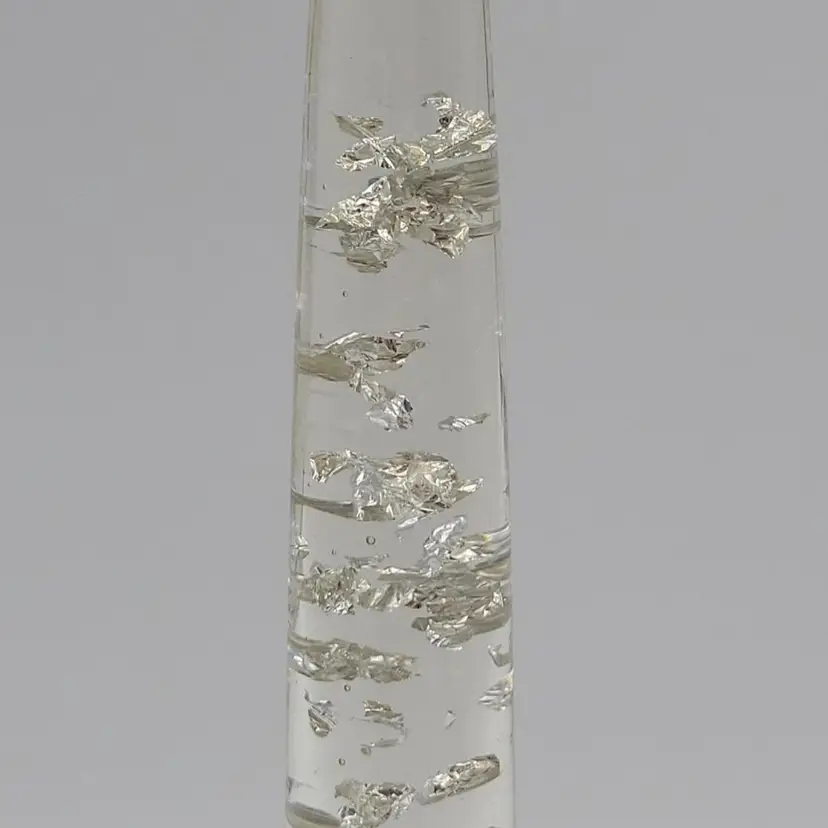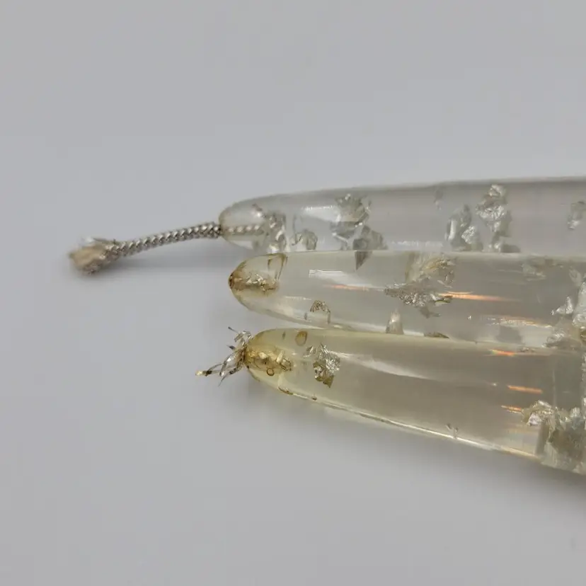 These 3 candles are all a clear lucite with silver flex. The two tall candles measure 11.50" tall and the shorter candle measures 8.25" tall. They ha w tape on the bottoms to help keep them stable in a candle holder. The two tall candles have damaged wicks, one totally missing and the other broken off (see photos). There is some minor discoloration in the lucite on the two large candles. There are no chips or cracks.