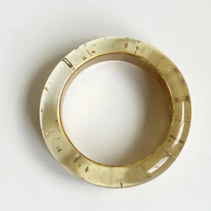 This chunky lucite bangle features suspended small gold flecks throughout, a matte gold coating on the interior of the band and an asymmetrical wavy shape. The bangle glows under black light. I'm not sure if the gold flecks are real gold so listing as gold tone flecks.