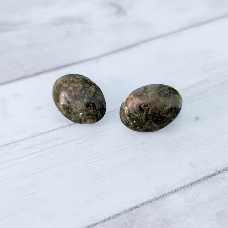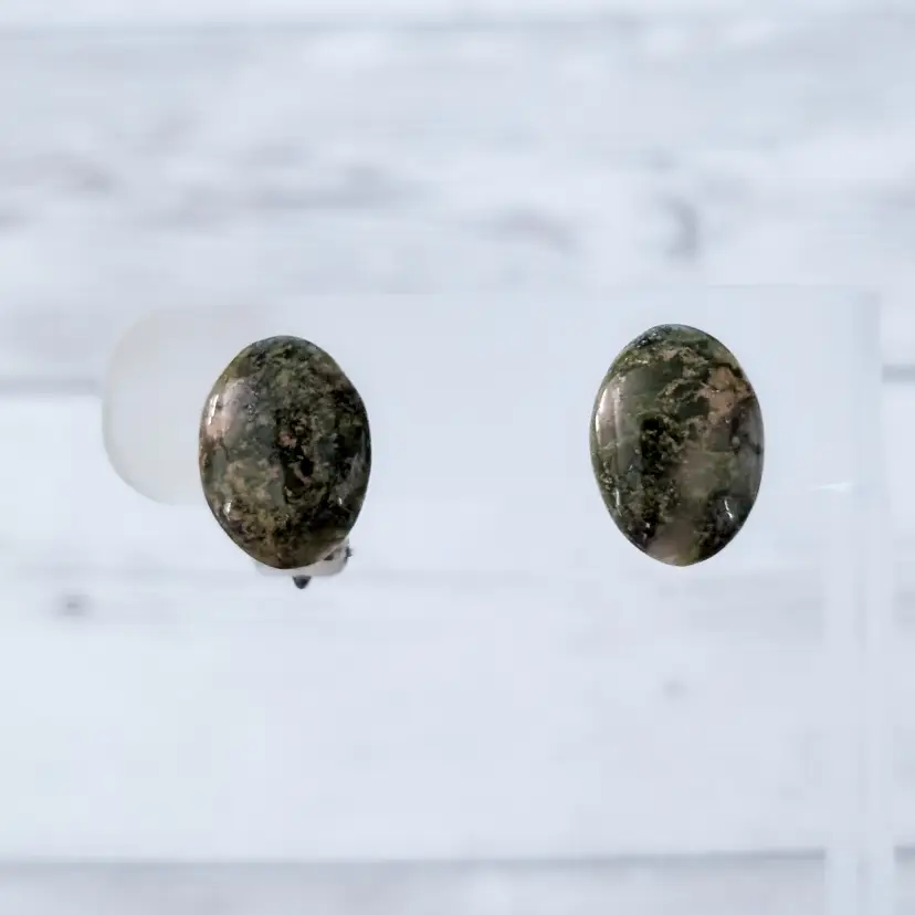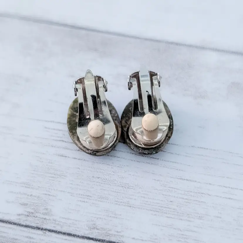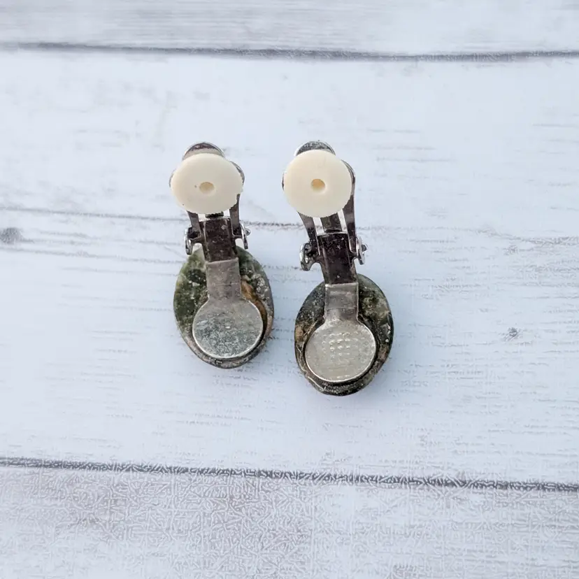 Vintage Clip On Earrings Green & Tan Tones Oval