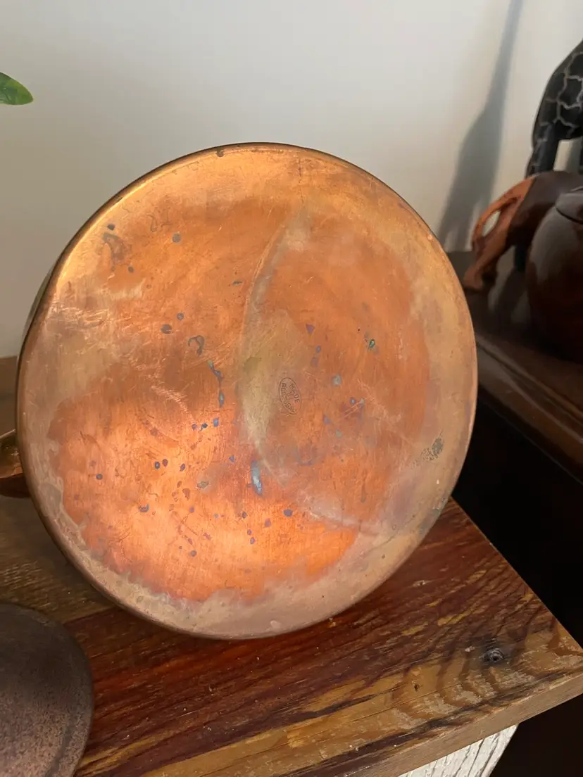 9 1/2” tall including handle 7” across bottom Beautiful patina