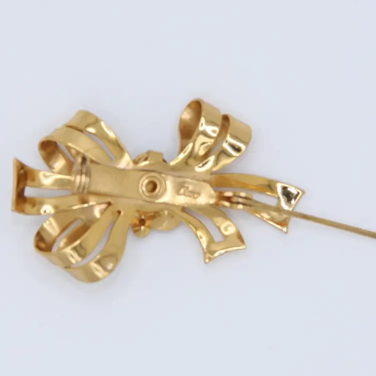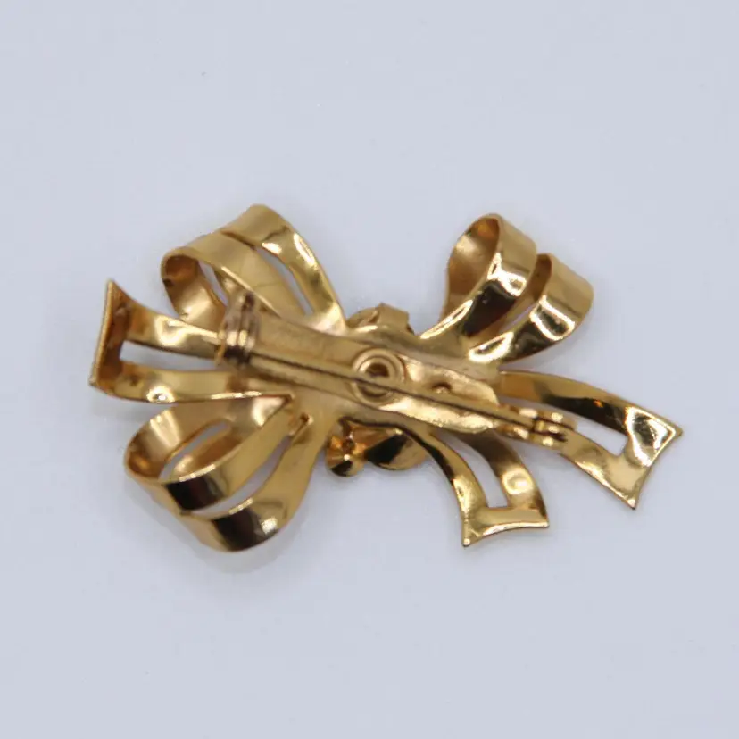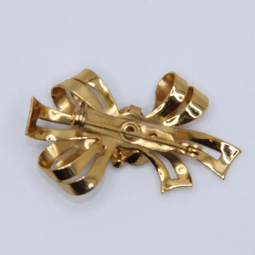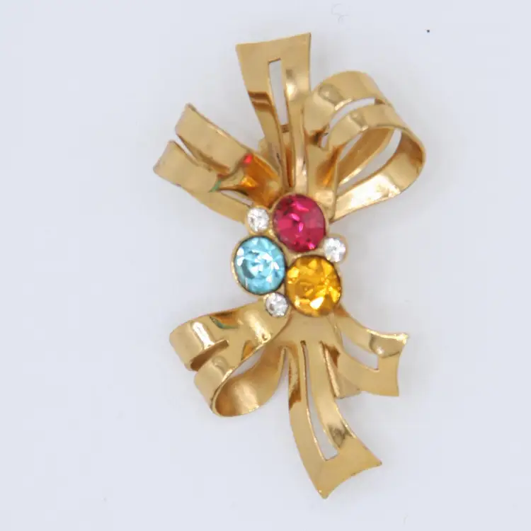 This Coro bow brooch is in excellent condition with no chips, cracks or repairs! The gold tone metal is in great condition with little to no signs of wear. There are 3 small clear glass rhinestones and 3 bigger rhinestones in pink, blue and orange. All stones are in great condition with no chips, cracks or repairs and bright, vibrant colors. This Coro bow brooch is about 1-3/4 inches long and 1 inch tall. It is signed Coro on the back.