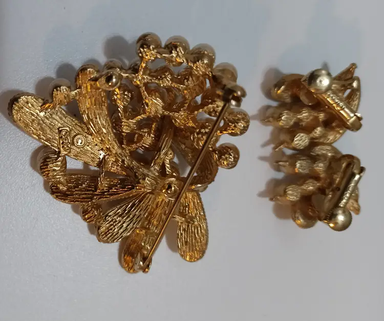 Spectacular Vintage Coro Gold Tone Brooch Adorned with Faux Pearls With Matching Clip on Earrings; Beautiful 3 Piece Set! Excellent Condition! 2" x 2" x .75"