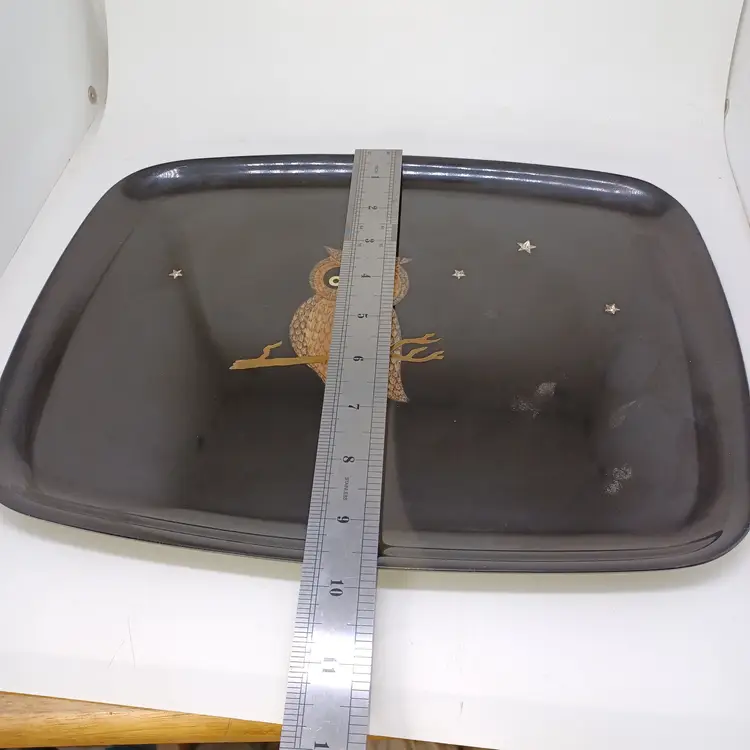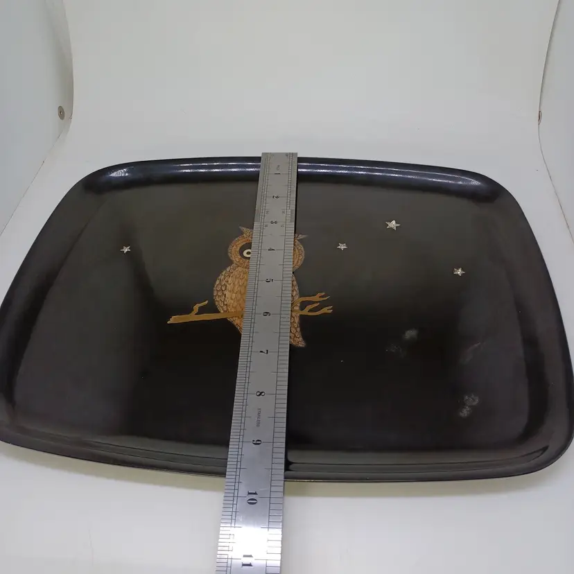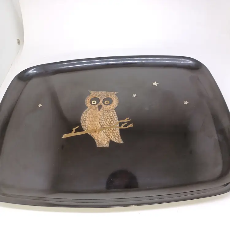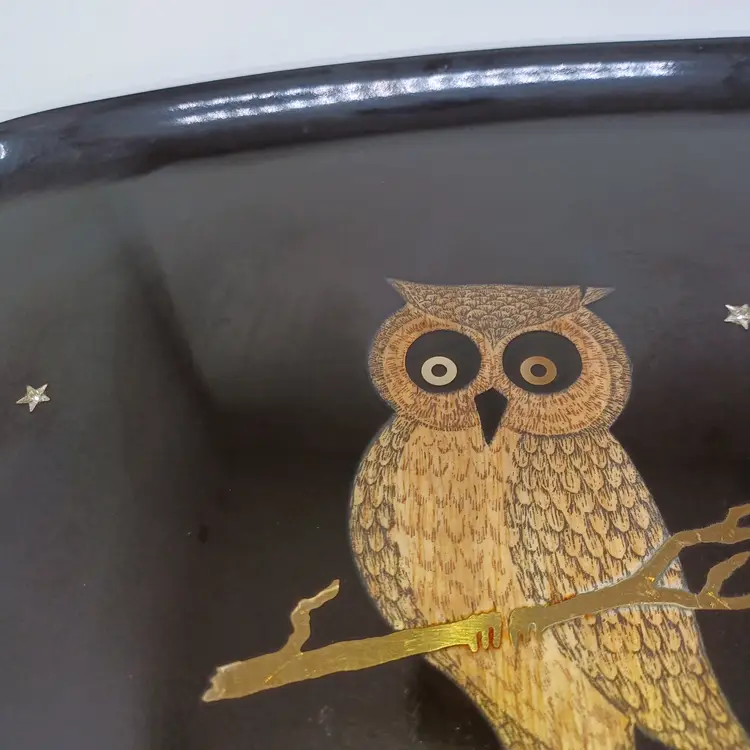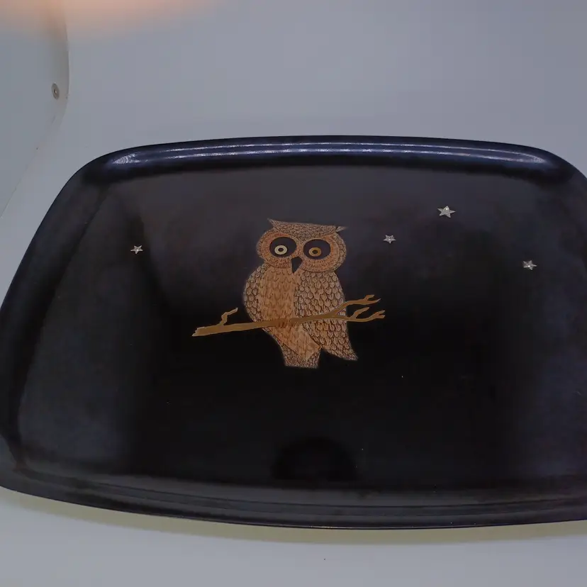 Vintage Couroc Owl Inlaid Tray 12 × 9 in Black Gold Mid-century modern tray with original foil sticker on the back does have some light scratching and a small chip out of the right side of the tray will not affect uae or display please see all pictures as they are the best description all items from a smoke-free home with pets experienced fragile shipper