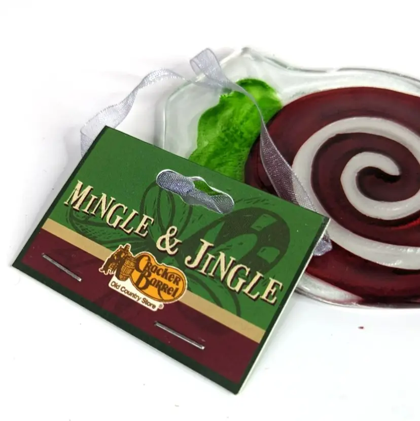 Vintage Cracker Barrel Mingle & Jingle Peppermint Candy Glass Christmas Ornament. Condition is preowned. Measures approximately 4.5 inches x 3 inches. (FC03) 202307141